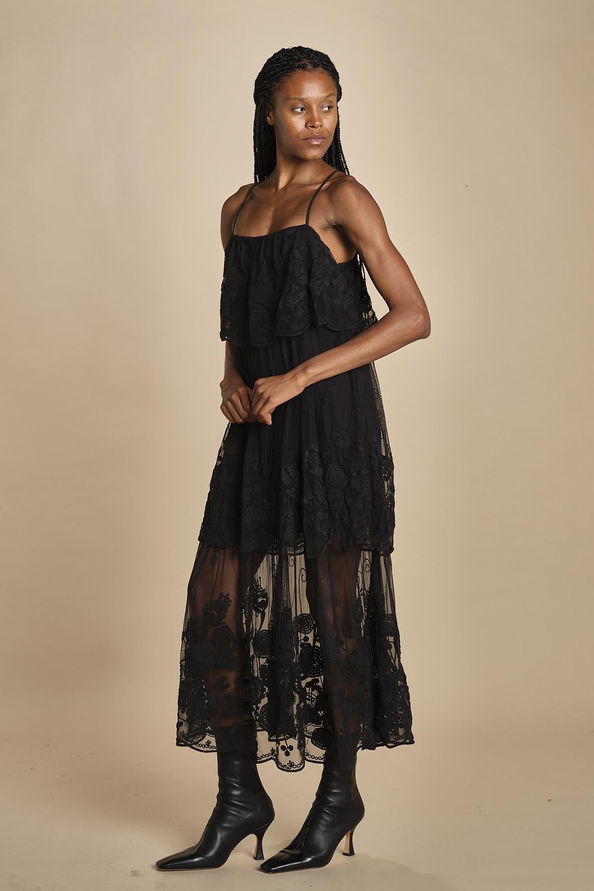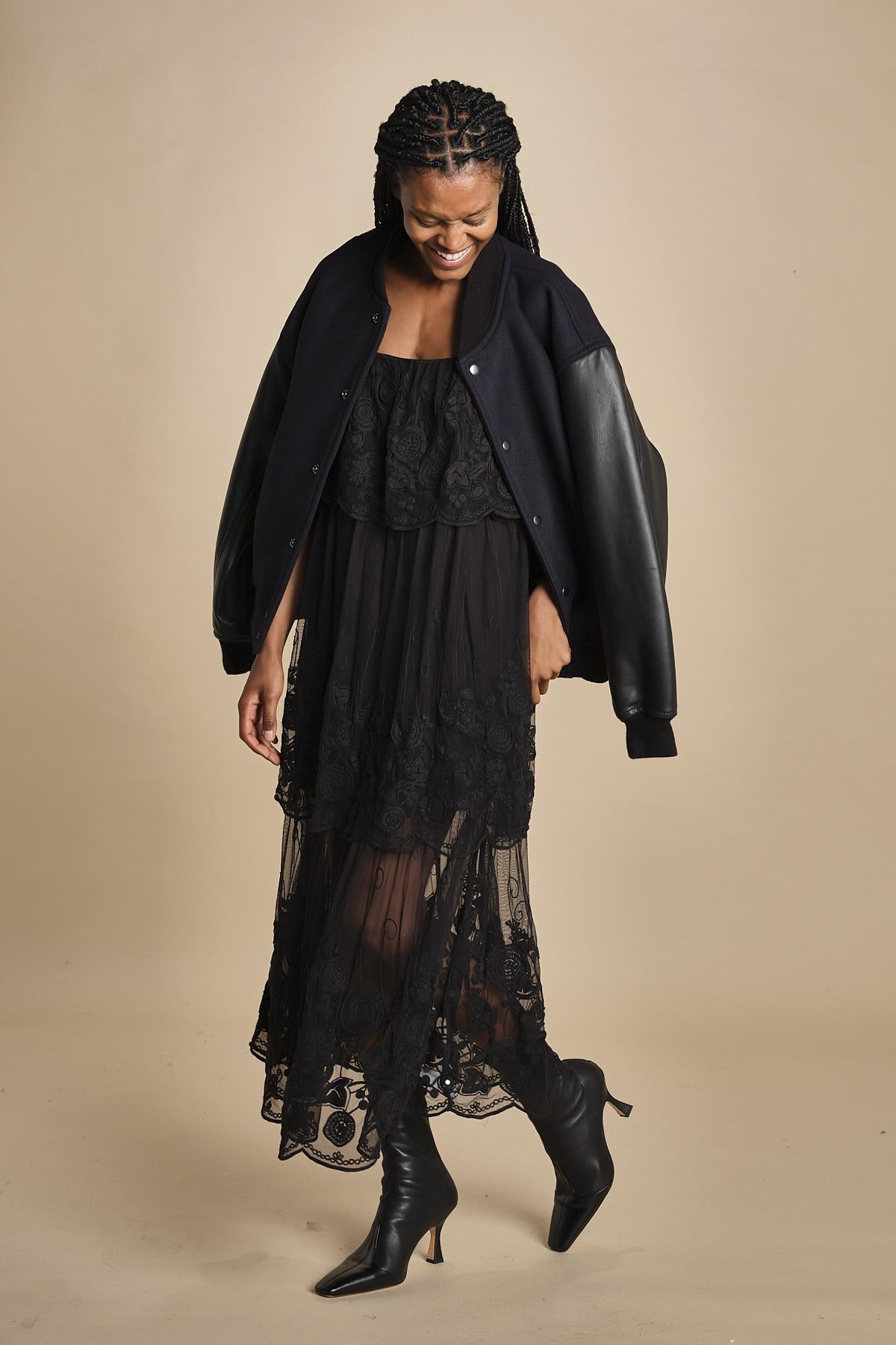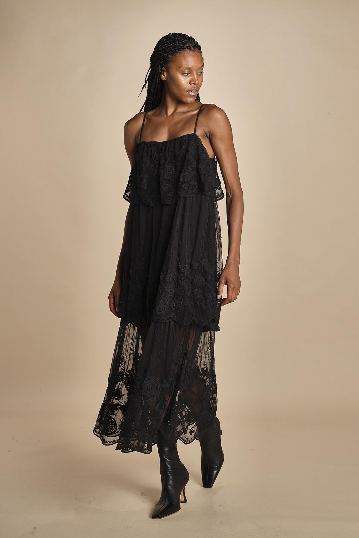 abito lungo in pizzo. La modella è alta 174 cm e indossa una taglia xs.
