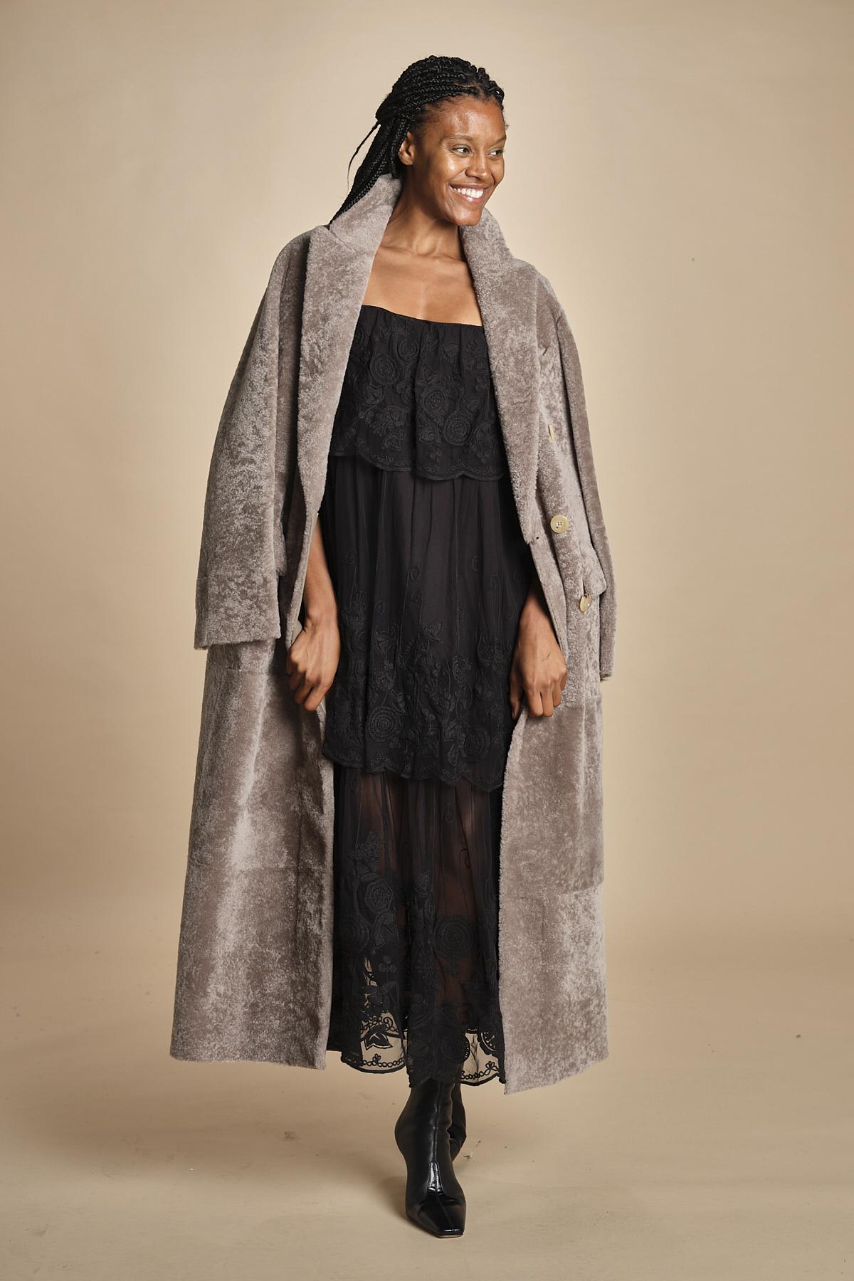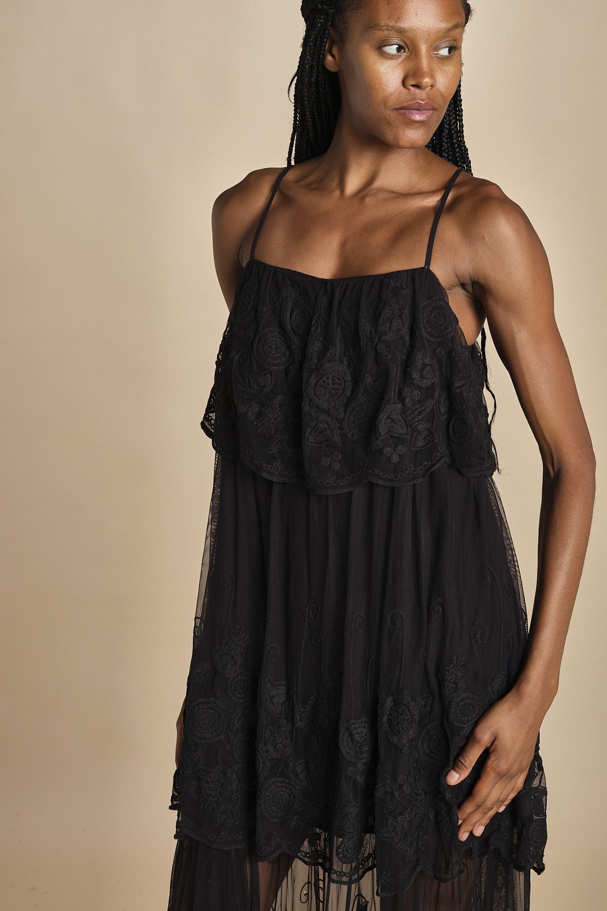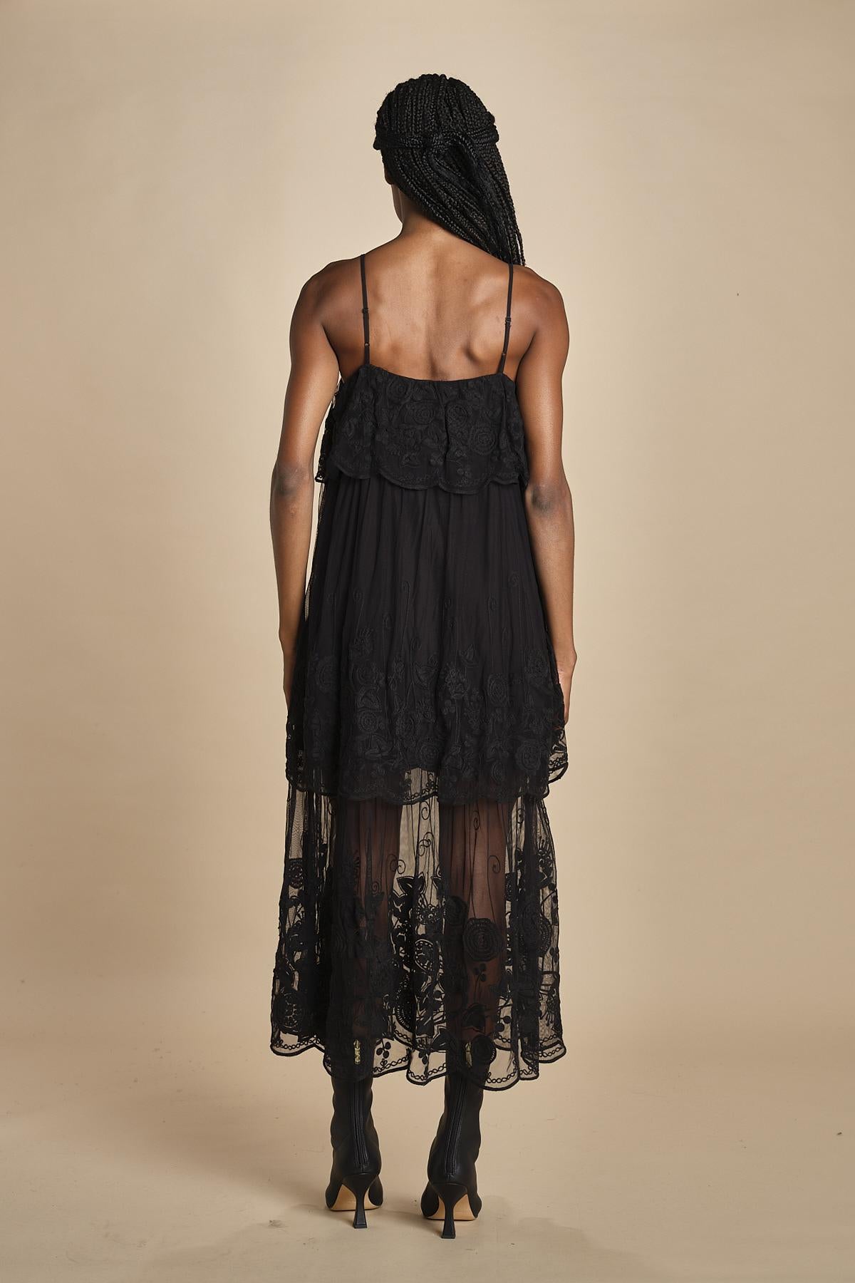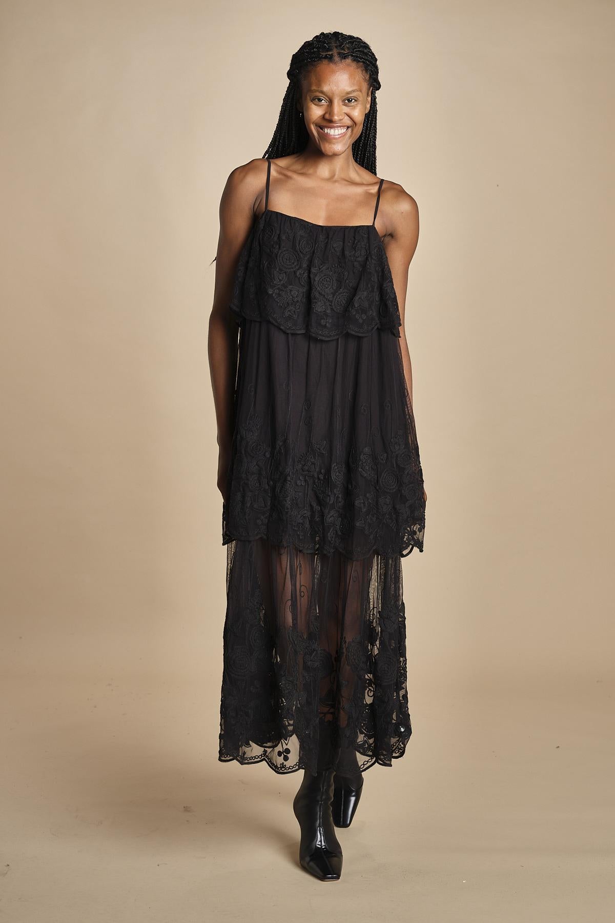 abito lungo in pizzo. La modella è alta 174 cm e indossa una taglia xs.