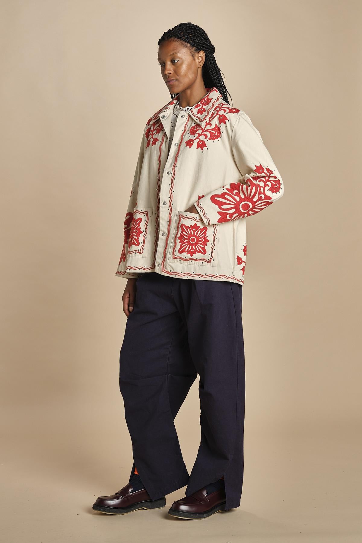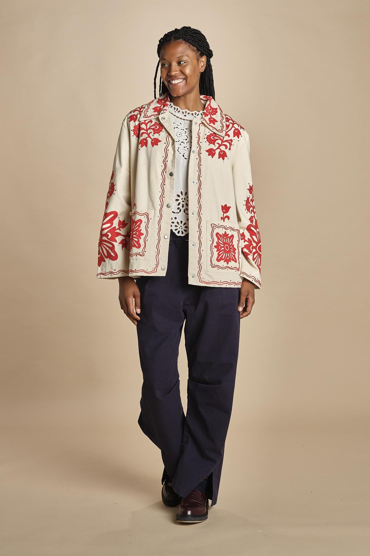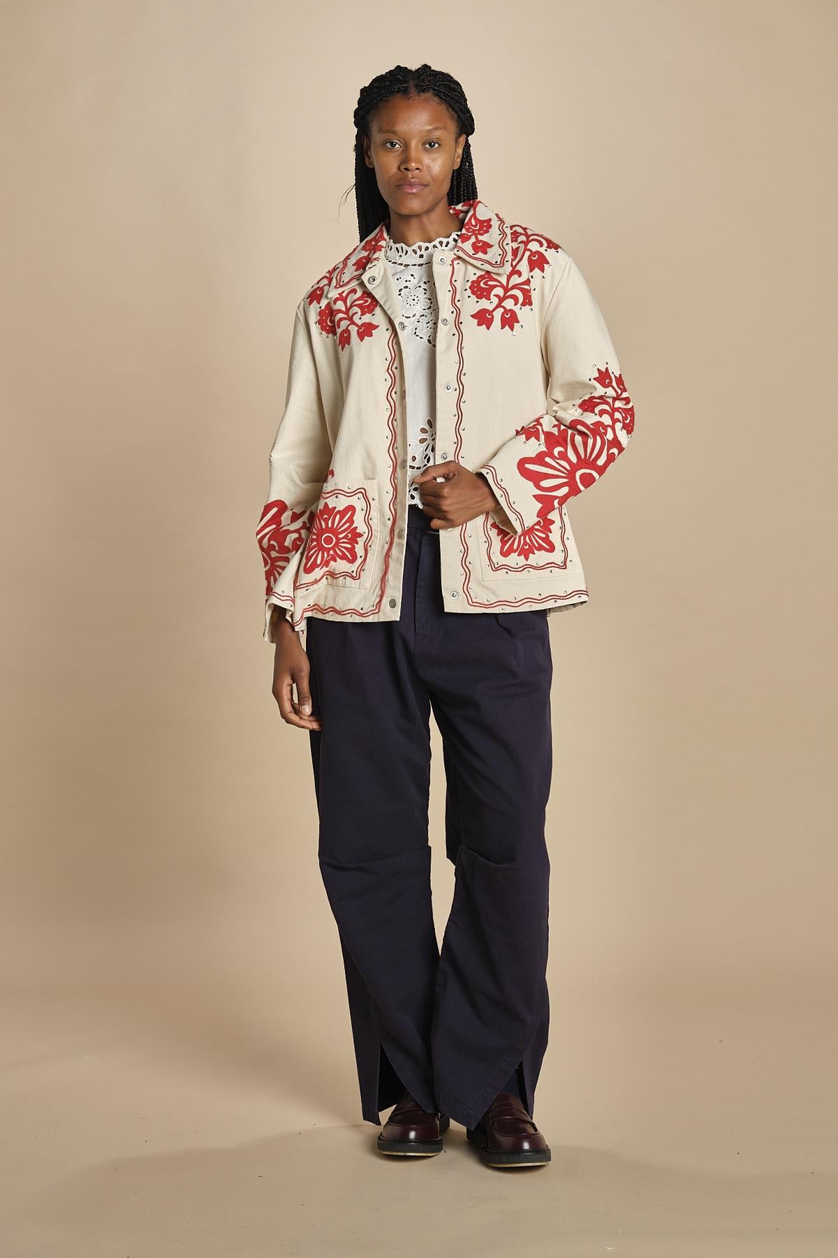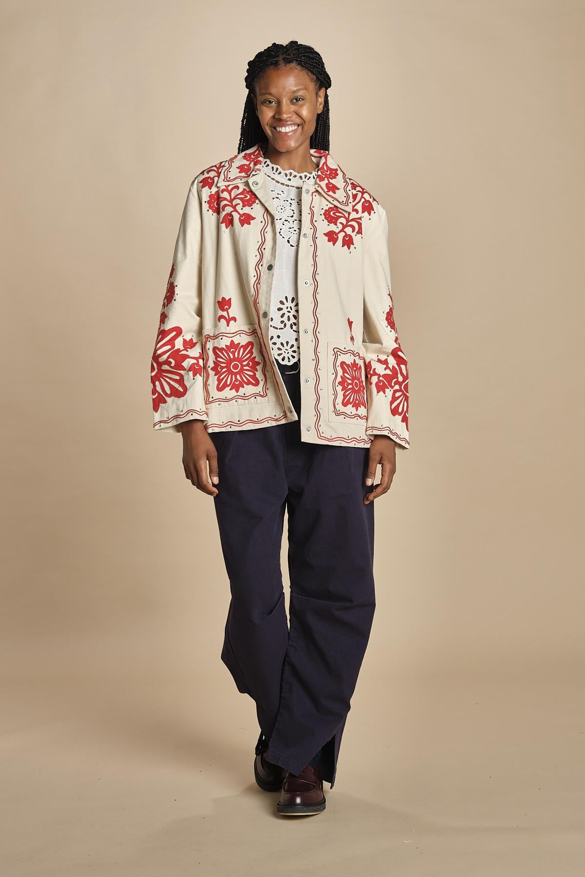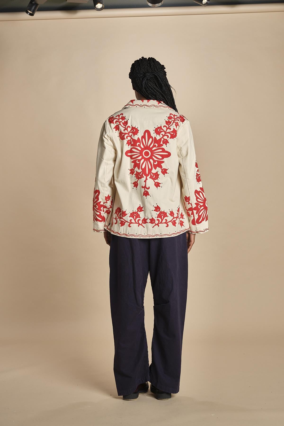 giacca con fiori stampati. La modella è alta 174 e indossa una taglia s.