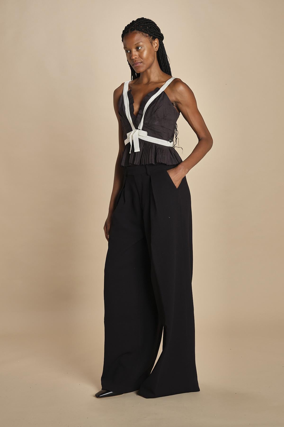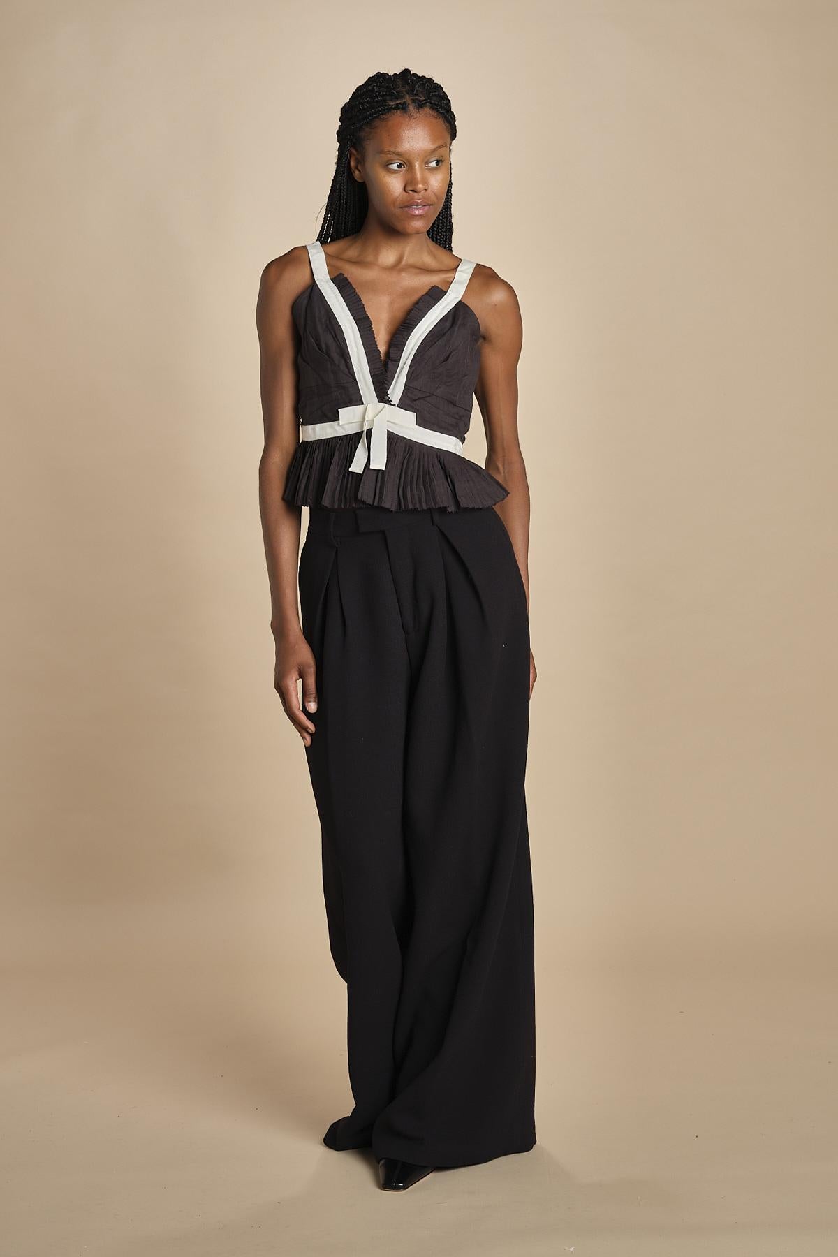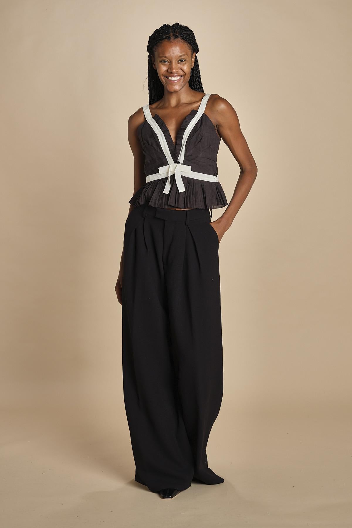 top con fiocco in contrasto. La modella è alta 174cm e indossa una taglia 2.