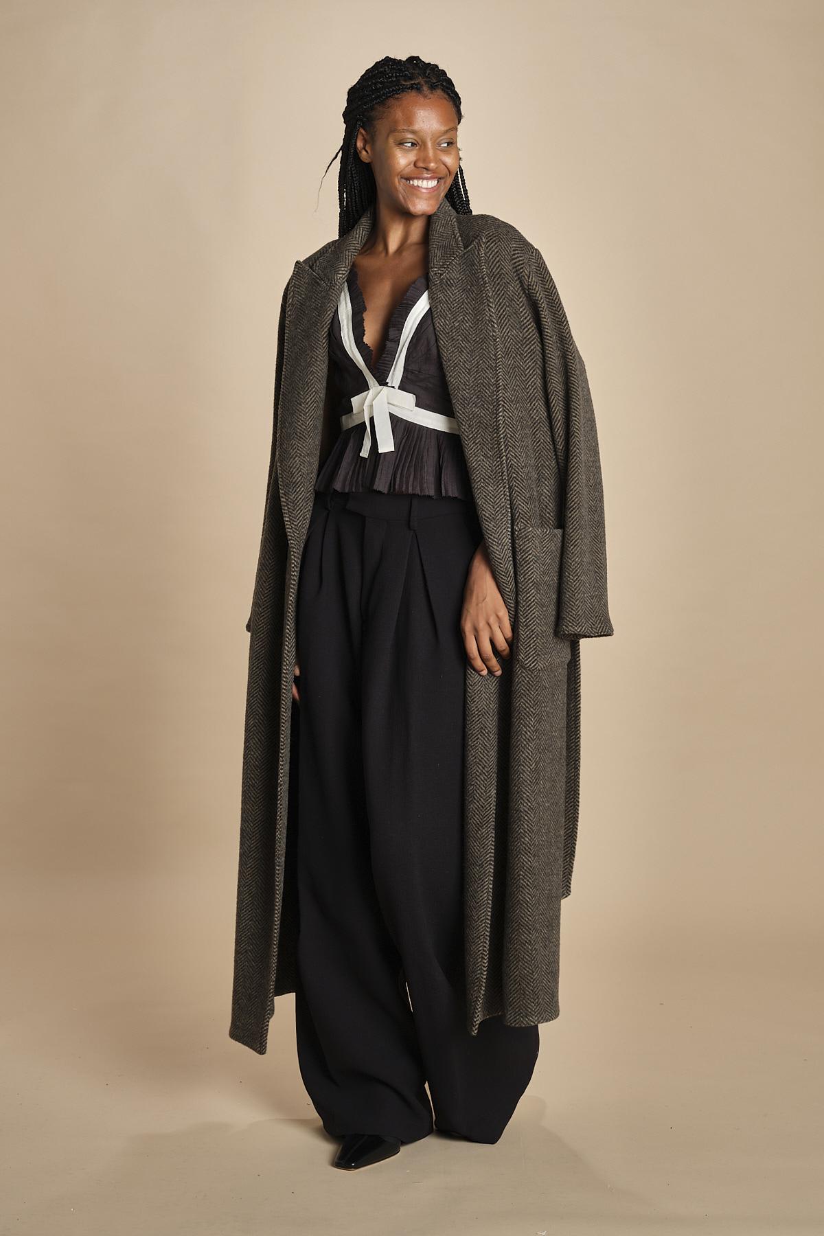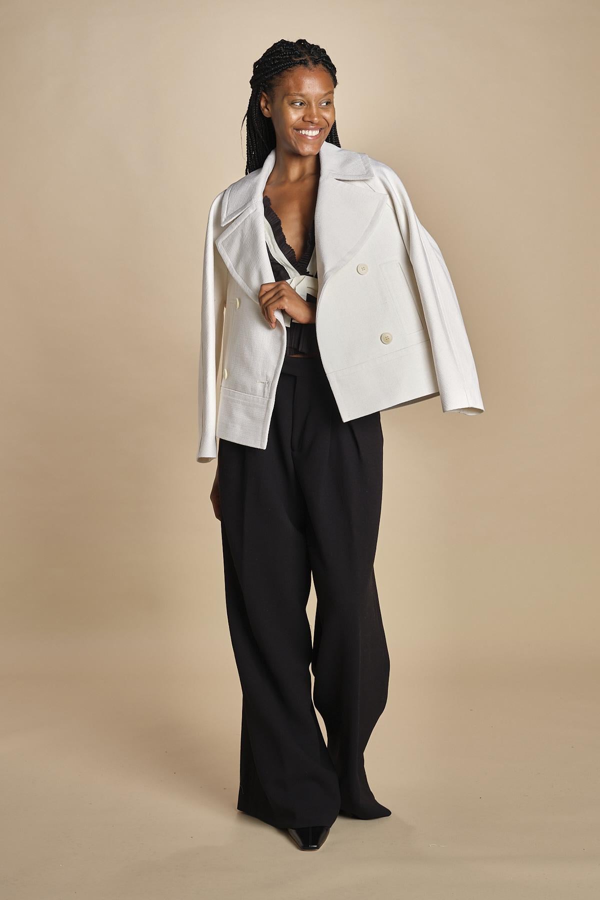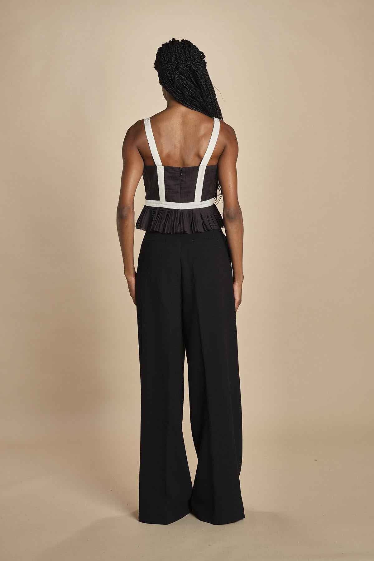 top con fiocco in contrasto. La modella è alta 174cm e indossa una taglia 2.
