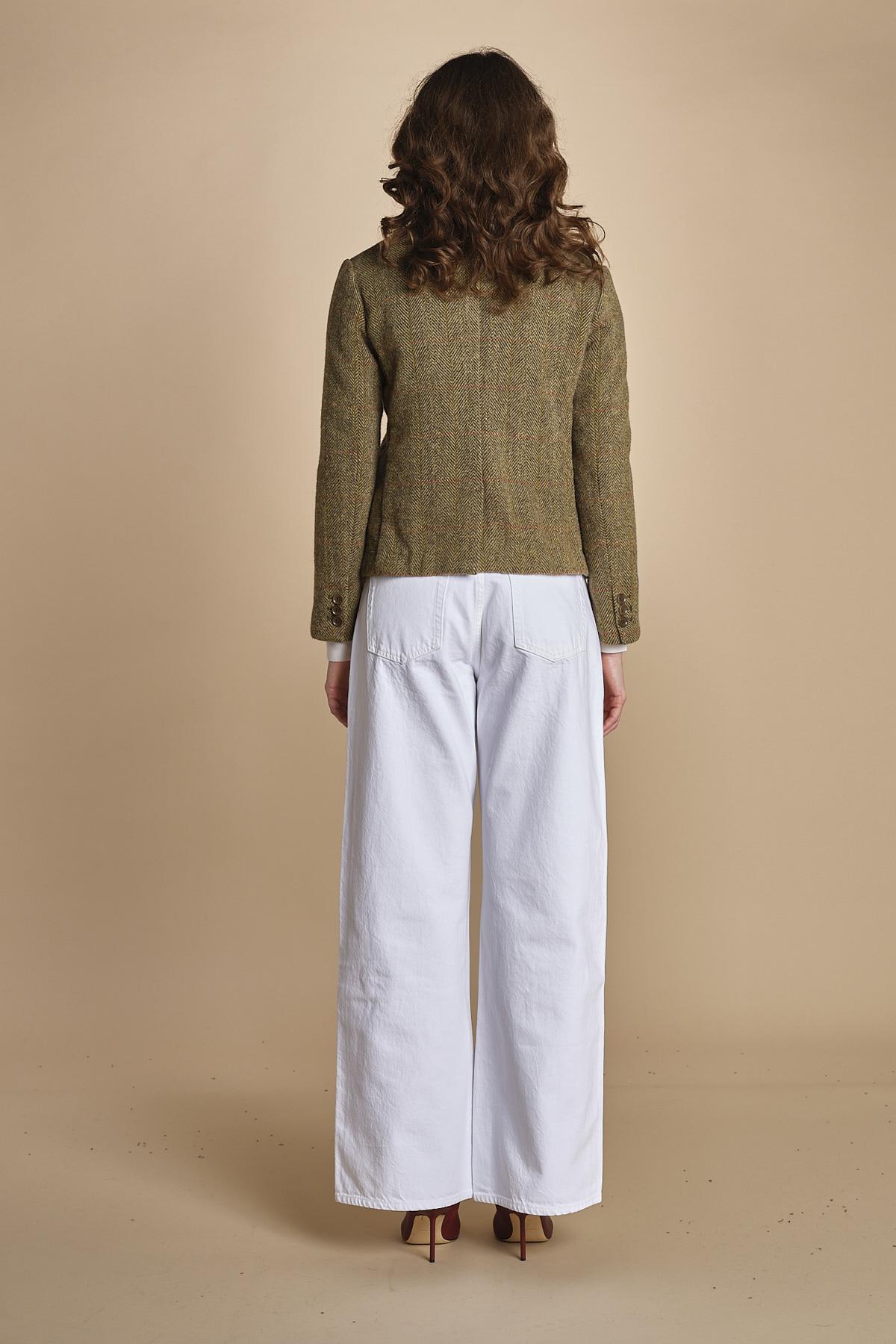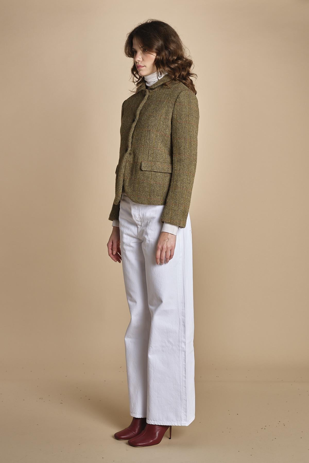 giacca in shetland con colletto rotondo. La modella è alta 176 cm e indossa una taglia 40. 100% LANA