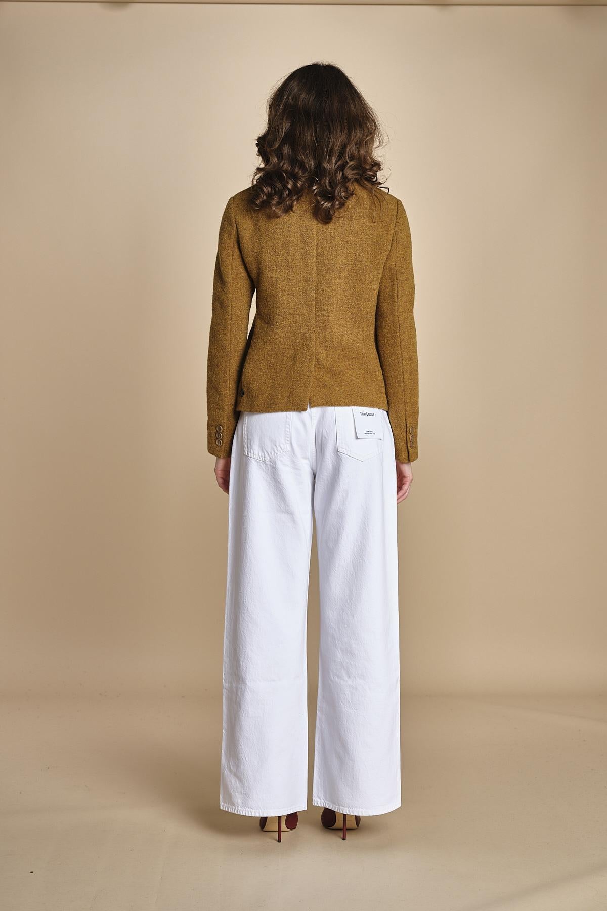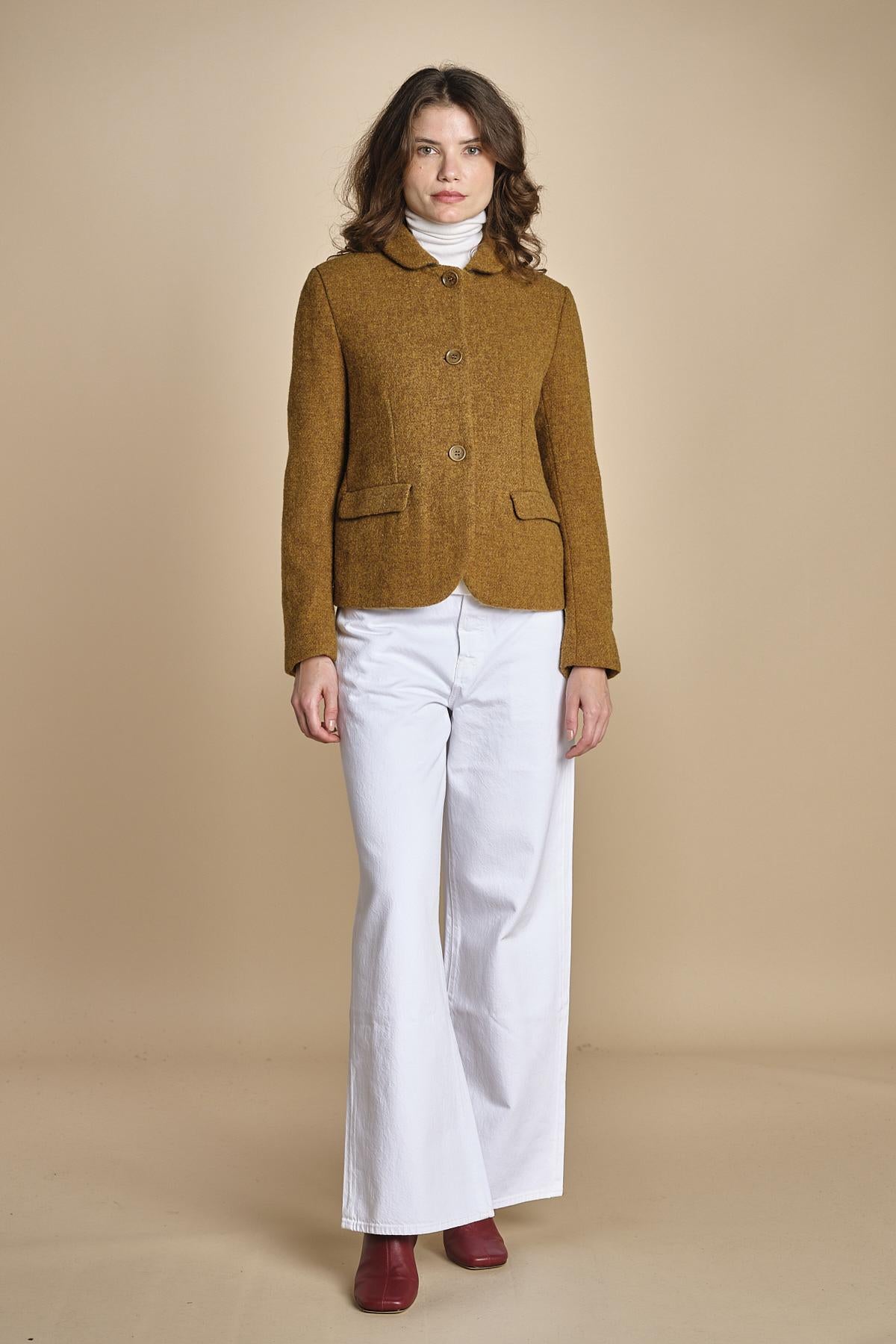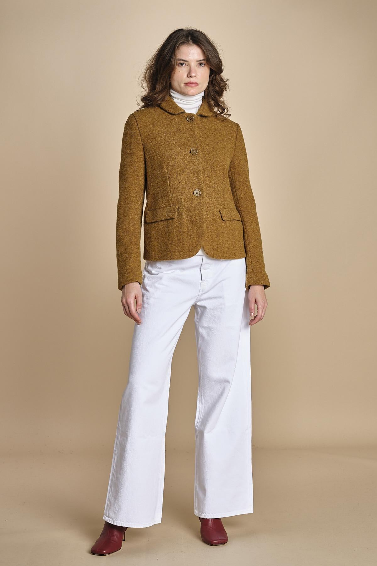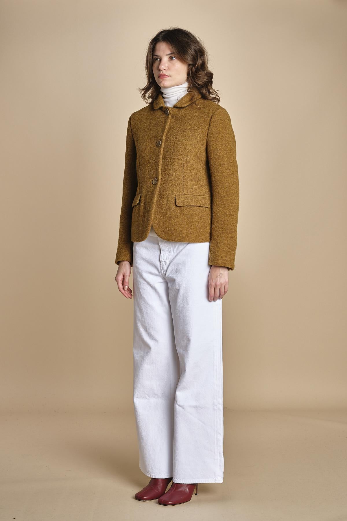 giacca in shetland con colletto rotondo. La modella è alta 176 cm e indossa una taglia S. 100% LANA