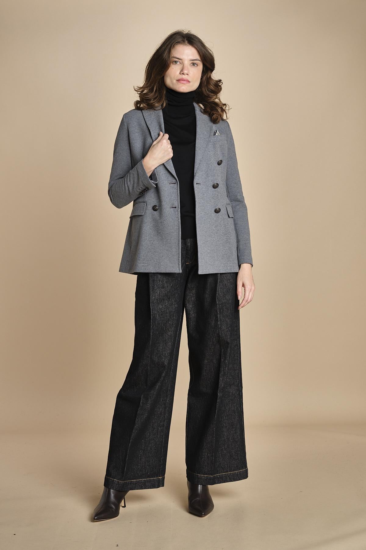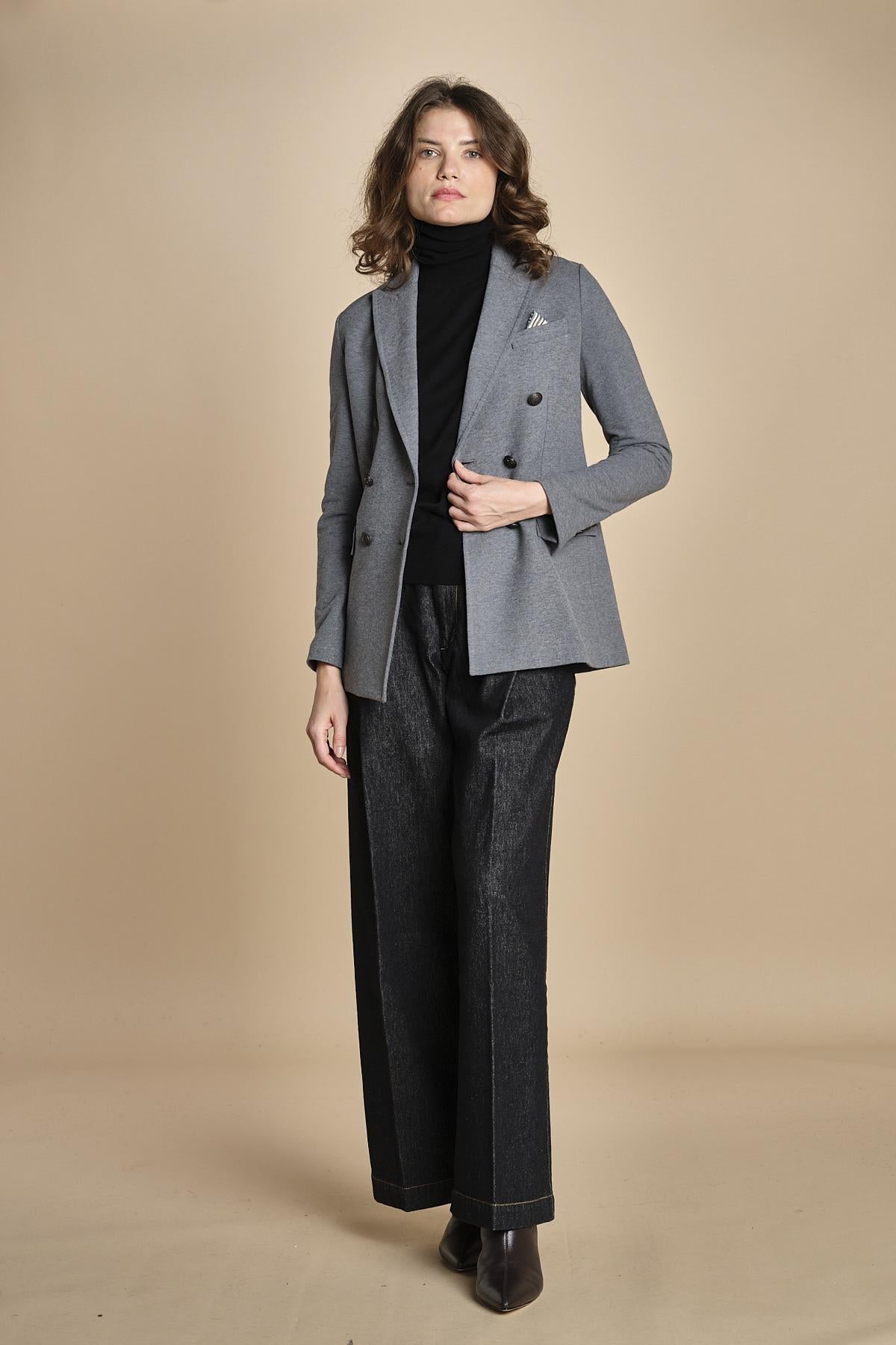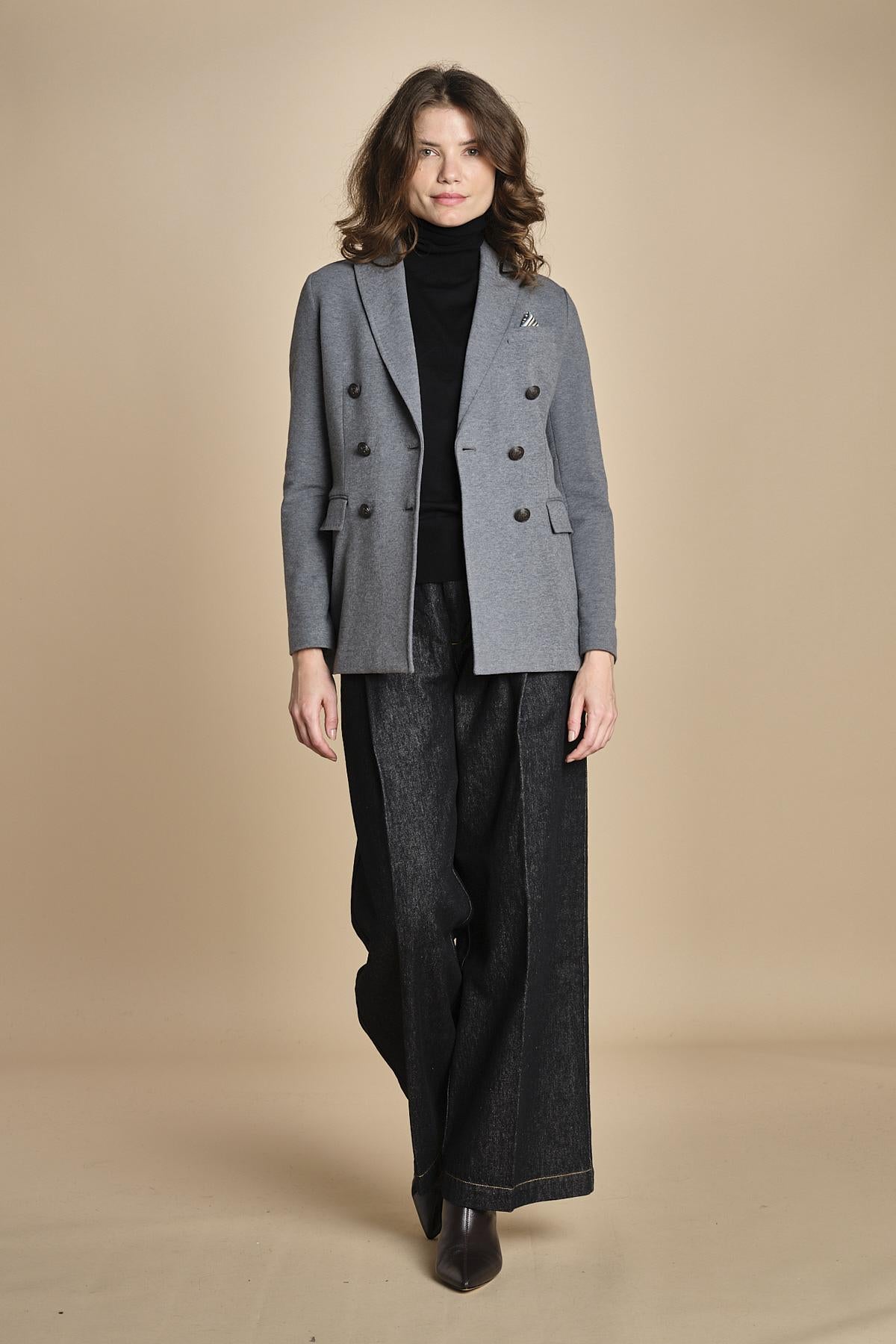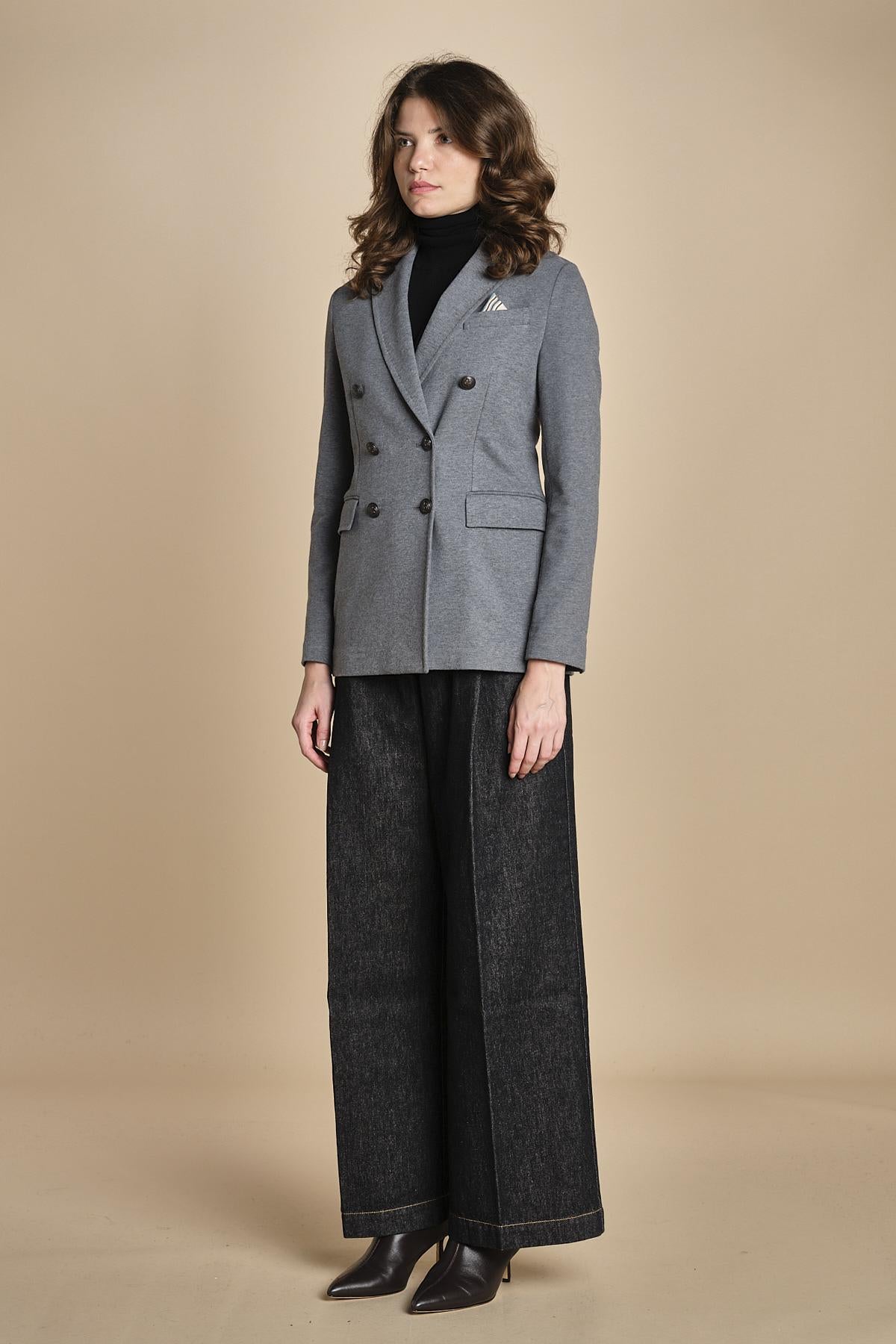 doppiopetto in felpa. La modella è alta 176 cm e indossa una taglia 40. 87% COTONE 13% ELASTANE