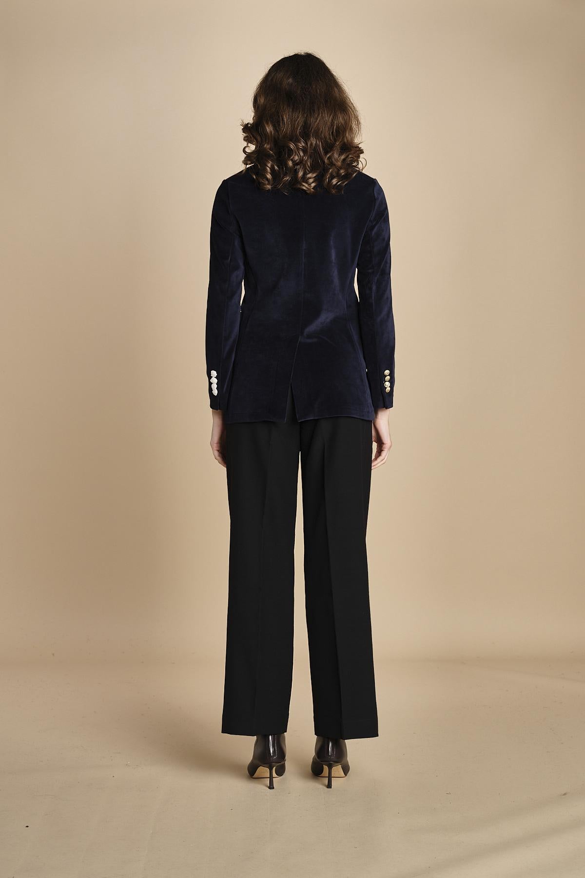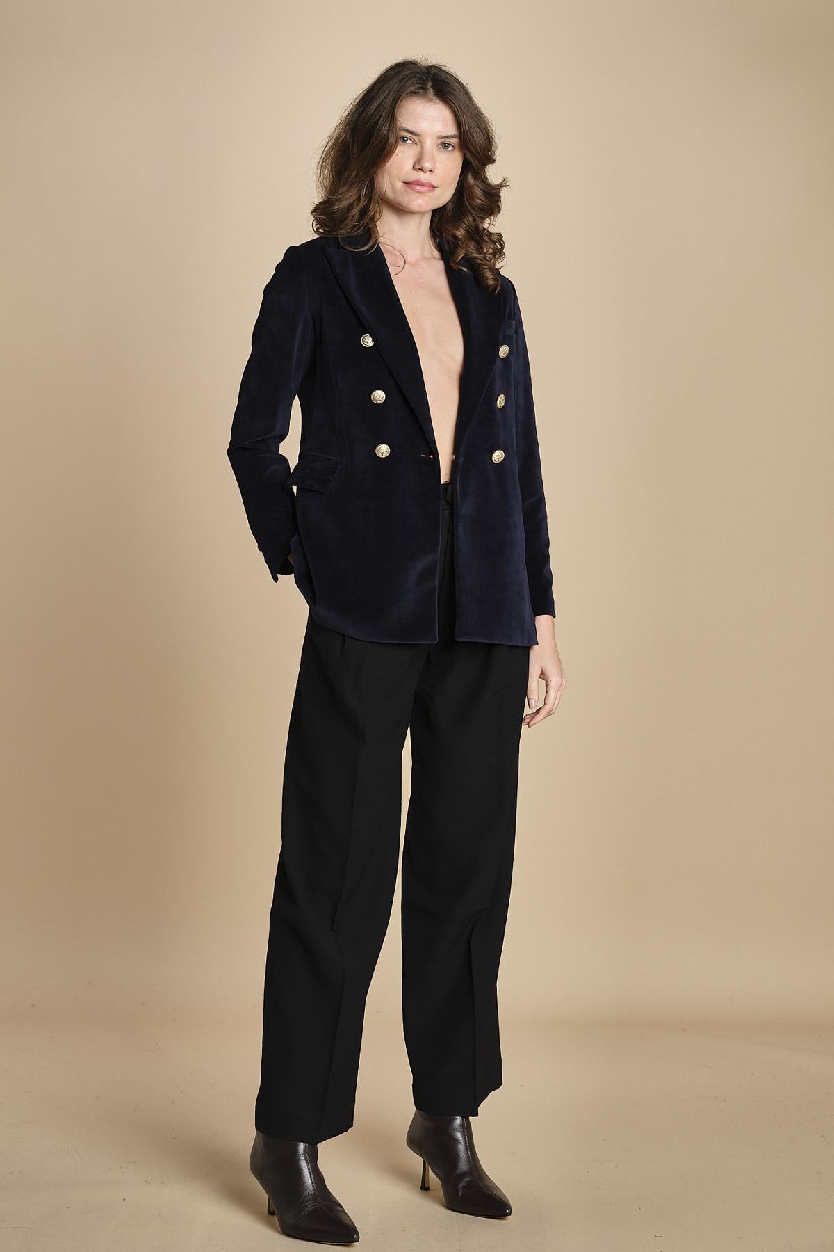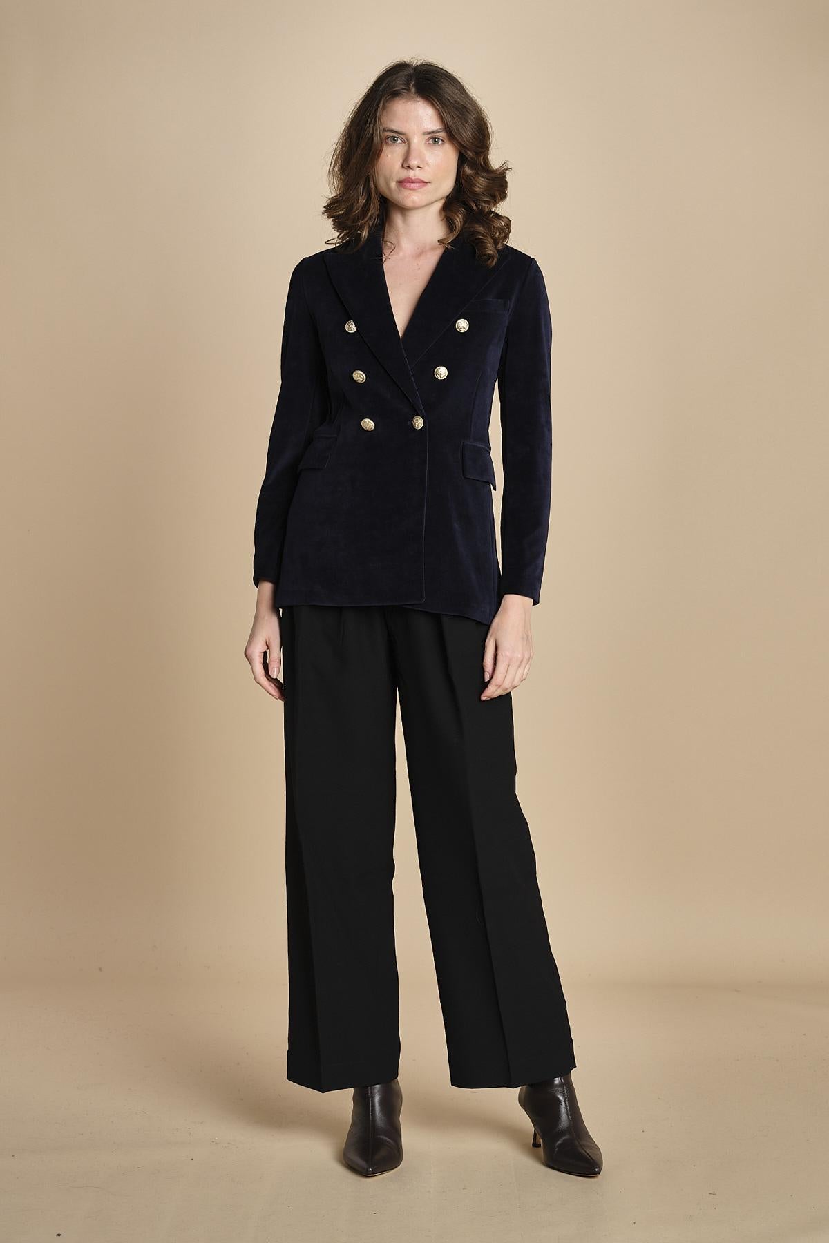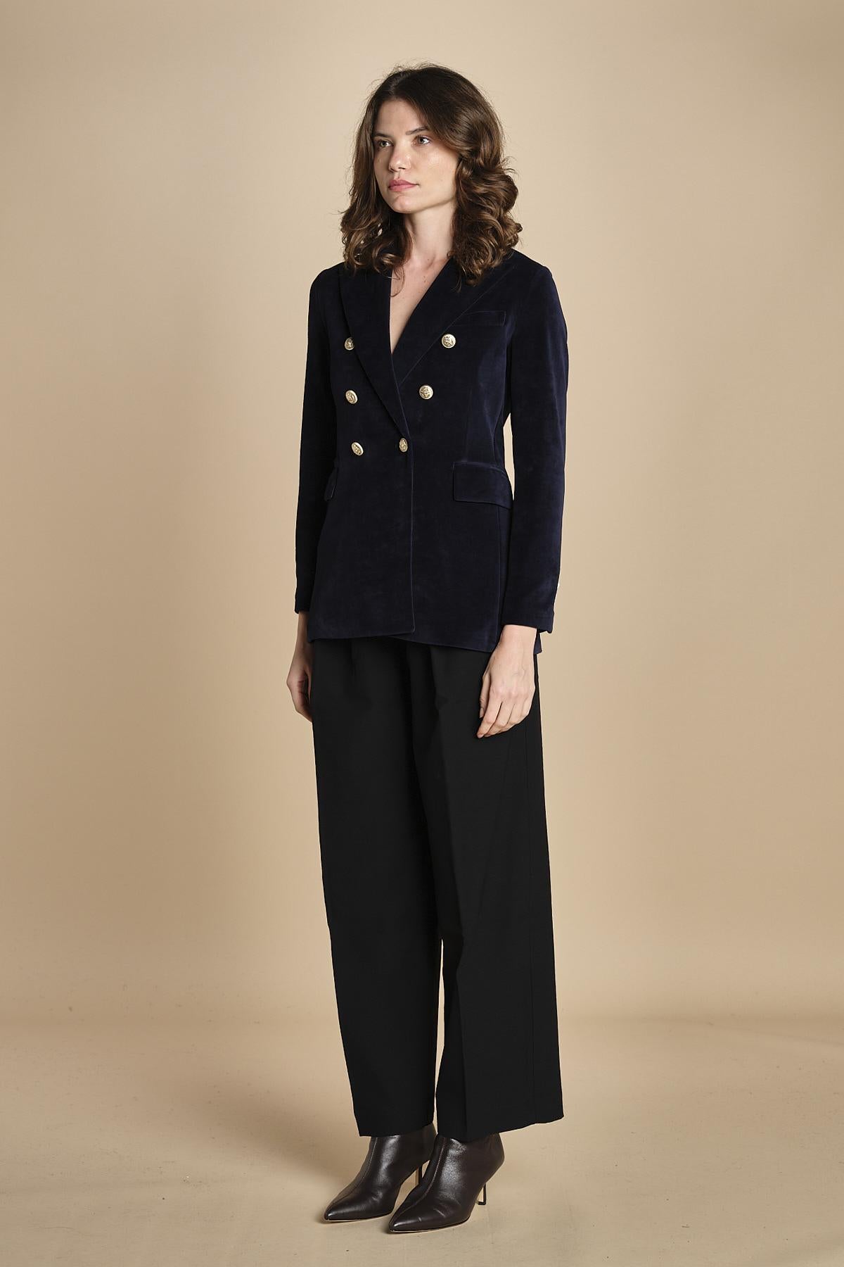doppiopetto in velluto liscio. La modella è alta 176 cm e indossa una taglia 40. 80% COTONE 20% POLIESTERE
