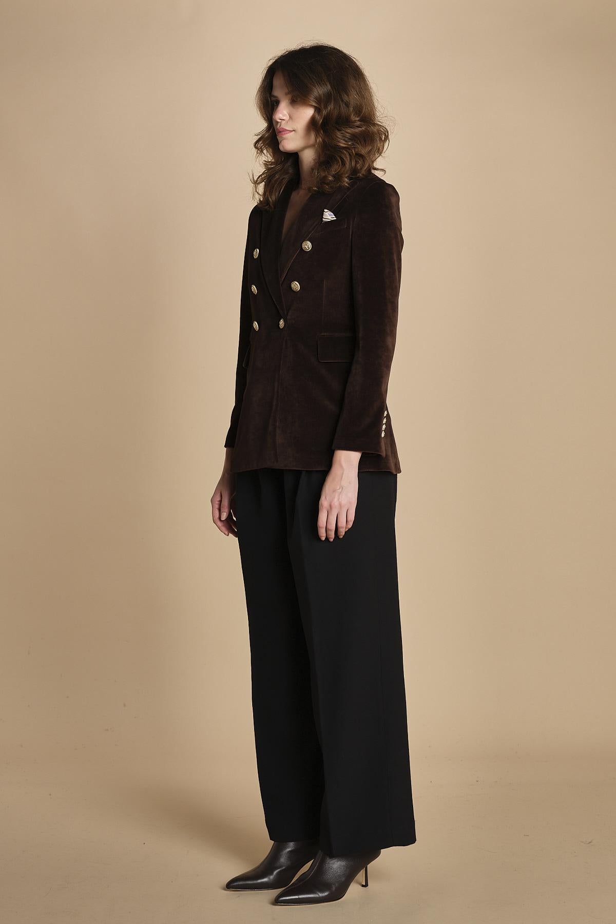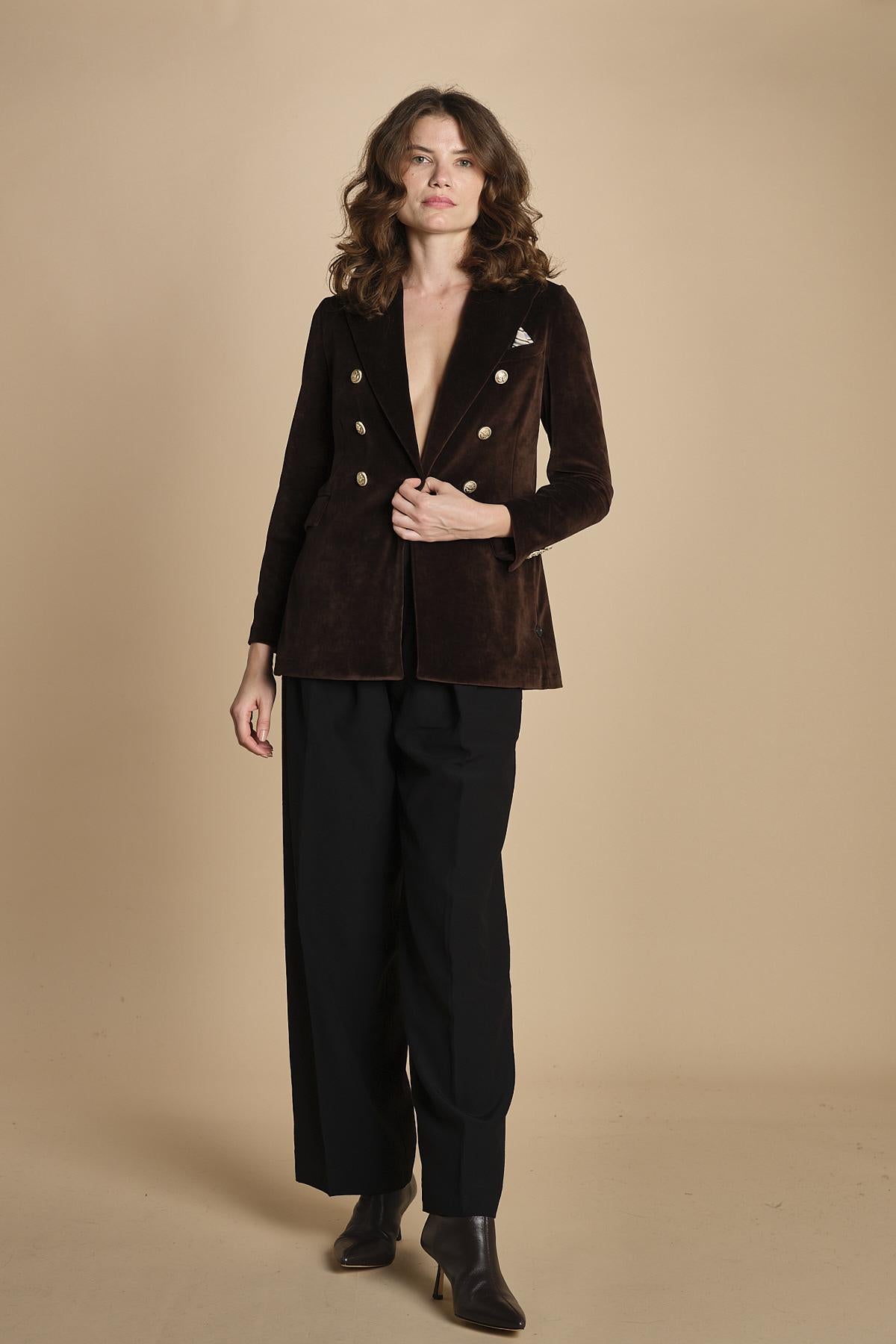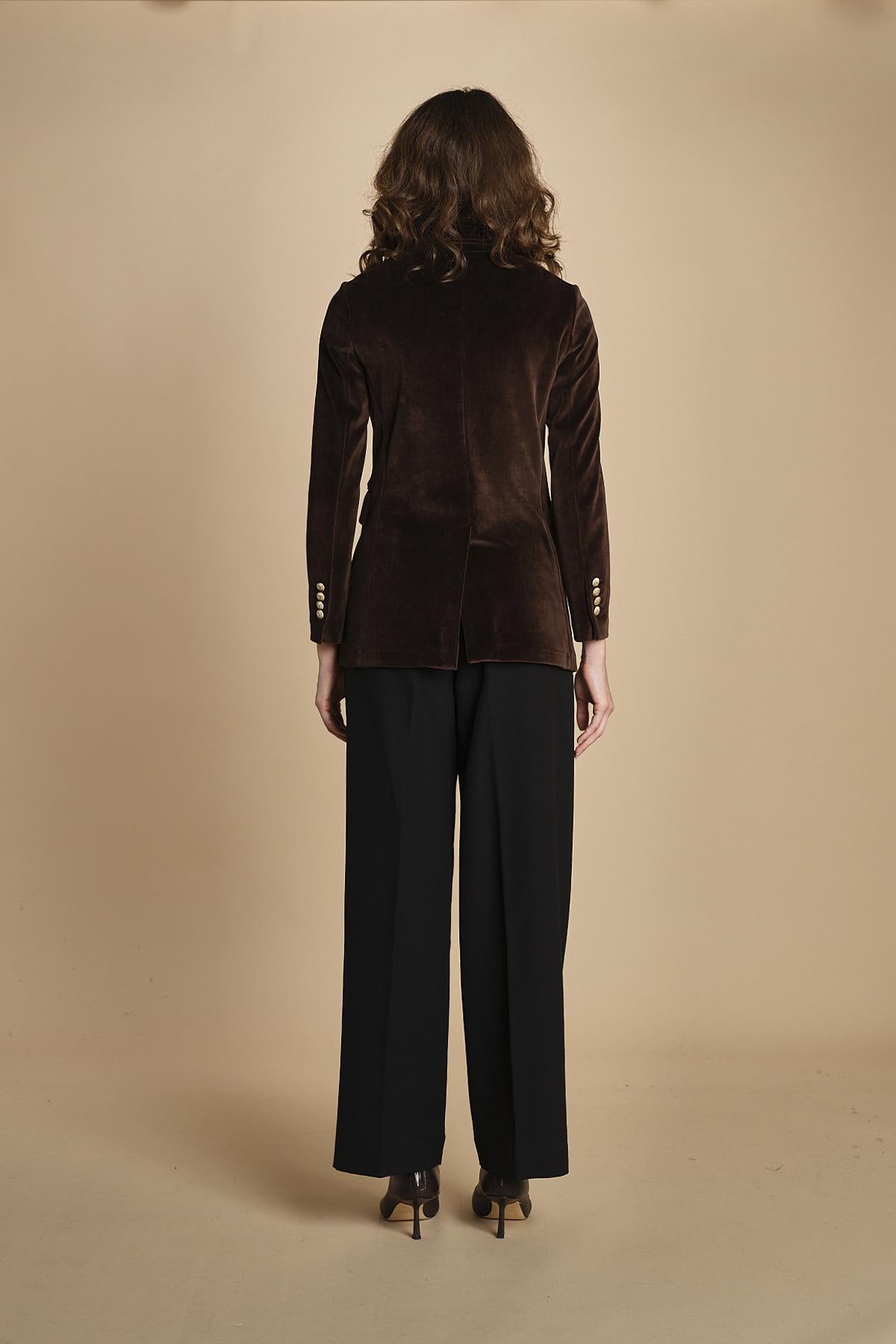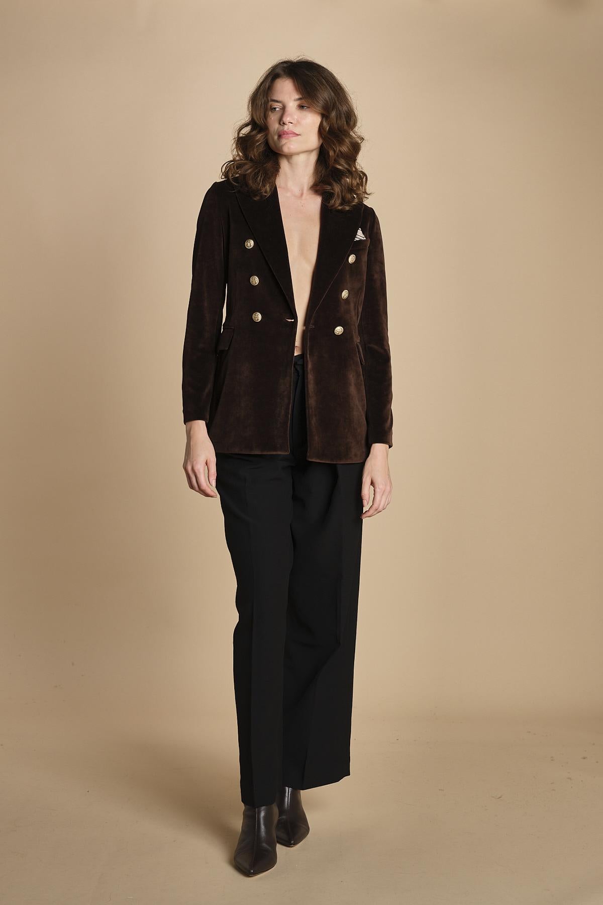 doppiopetto in velluto liscio. La modella è alta 176 cm e indossa una taglia 40. 80% COTONE 20% POLIESTERE