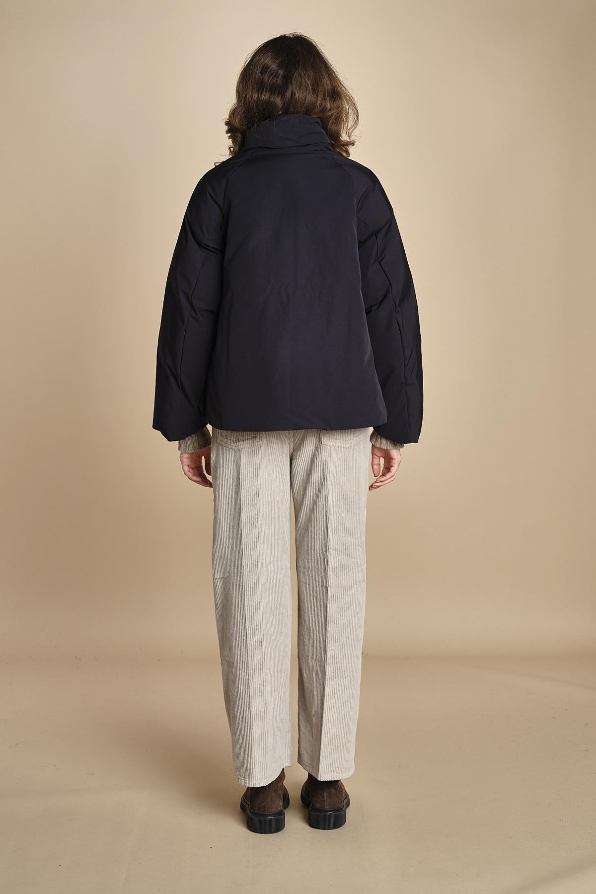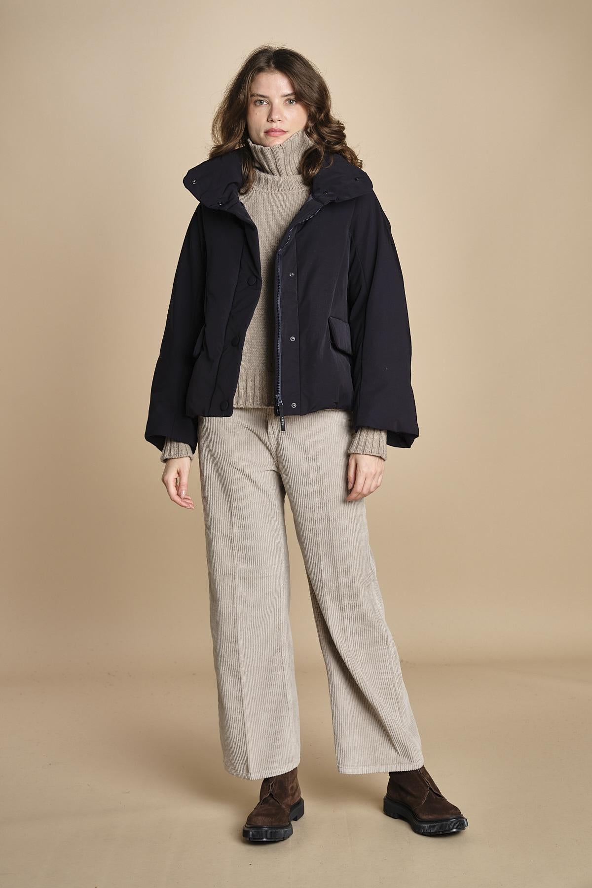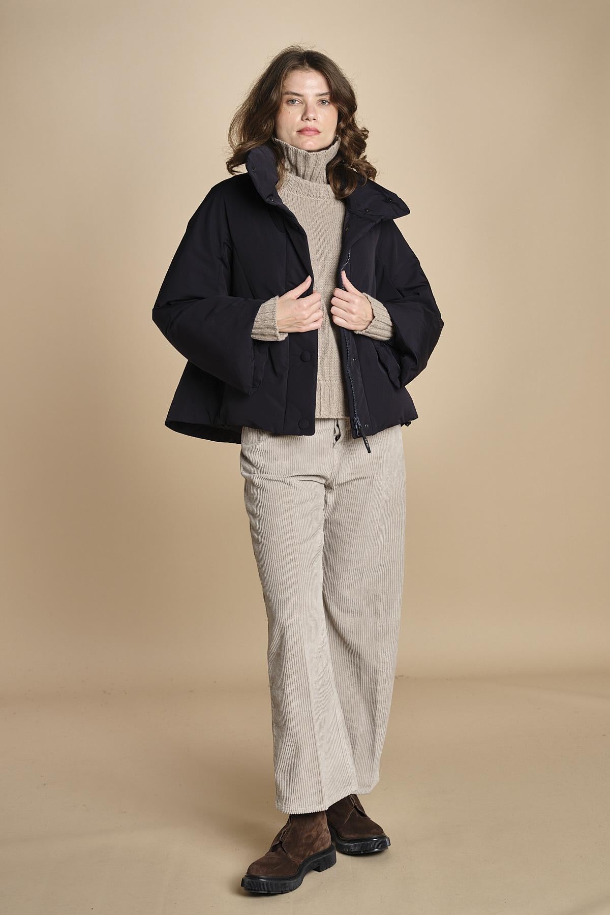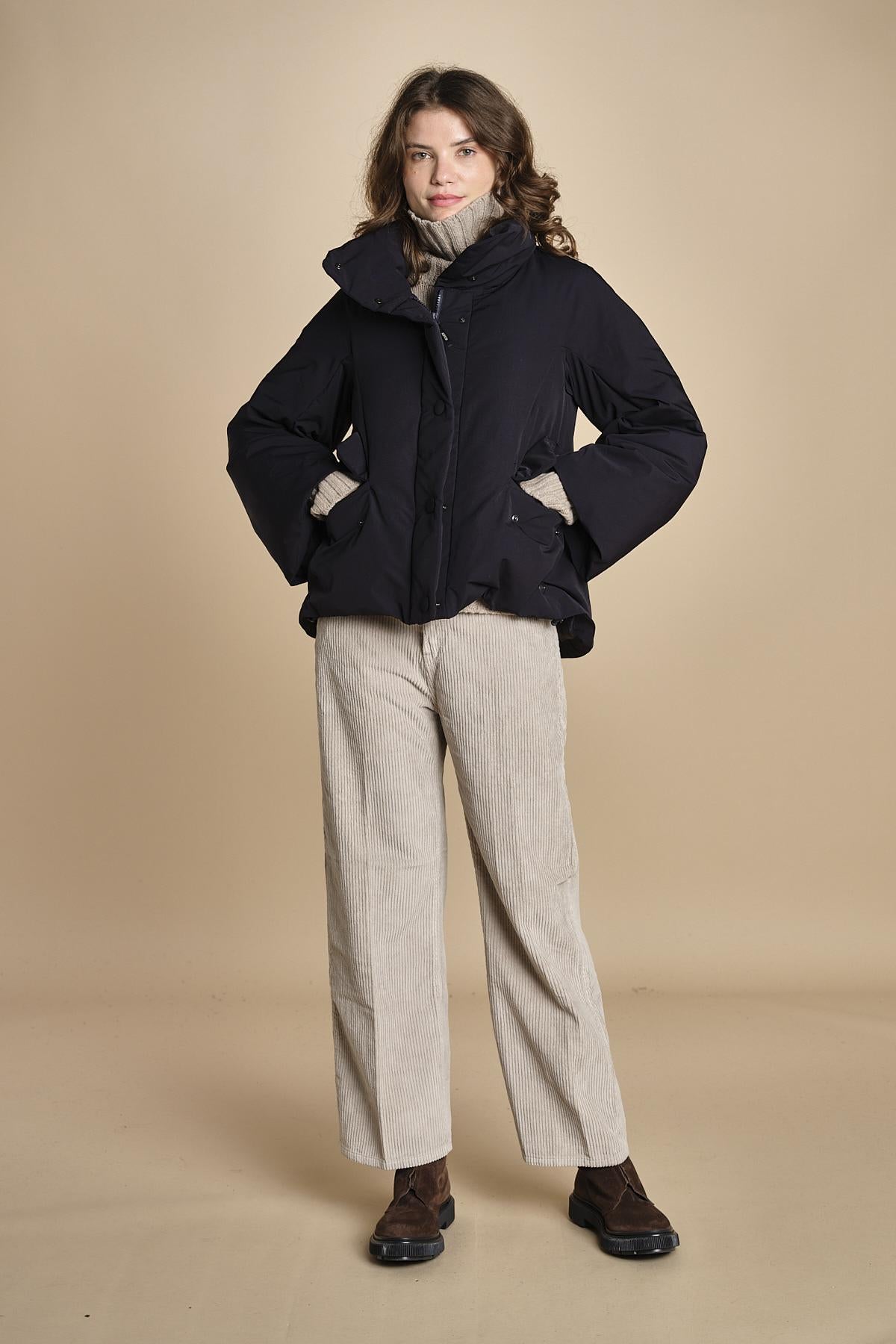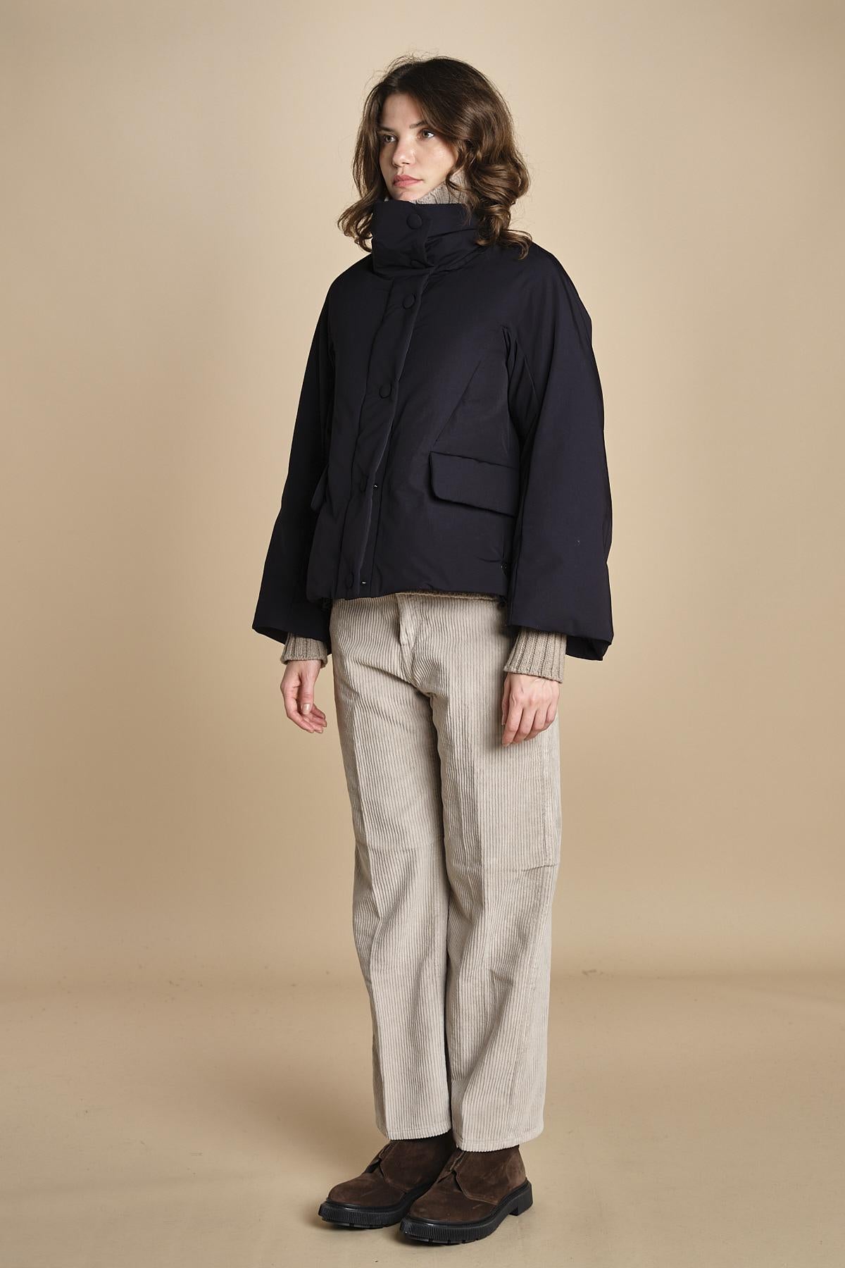 piumino con bottone ricoperto e manica a campana. La modella è alta 176 cm e indossa una taglia S. 53% COTONE 47% POLIESTERE