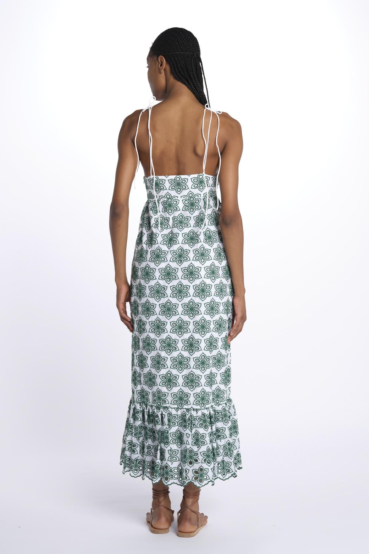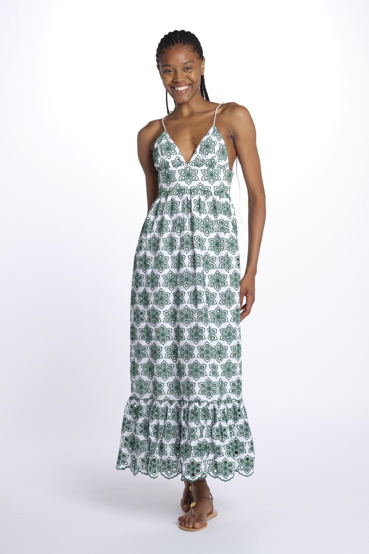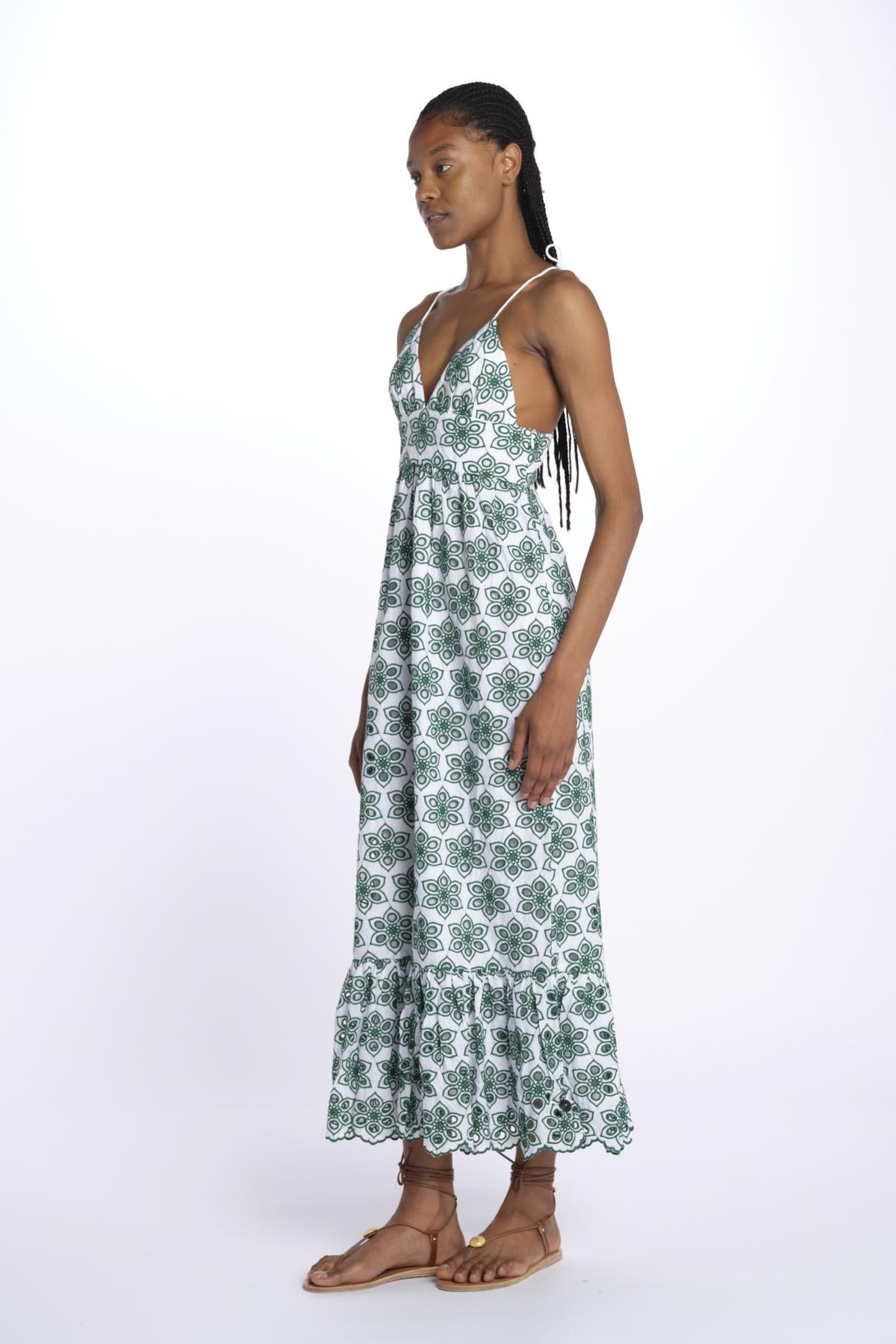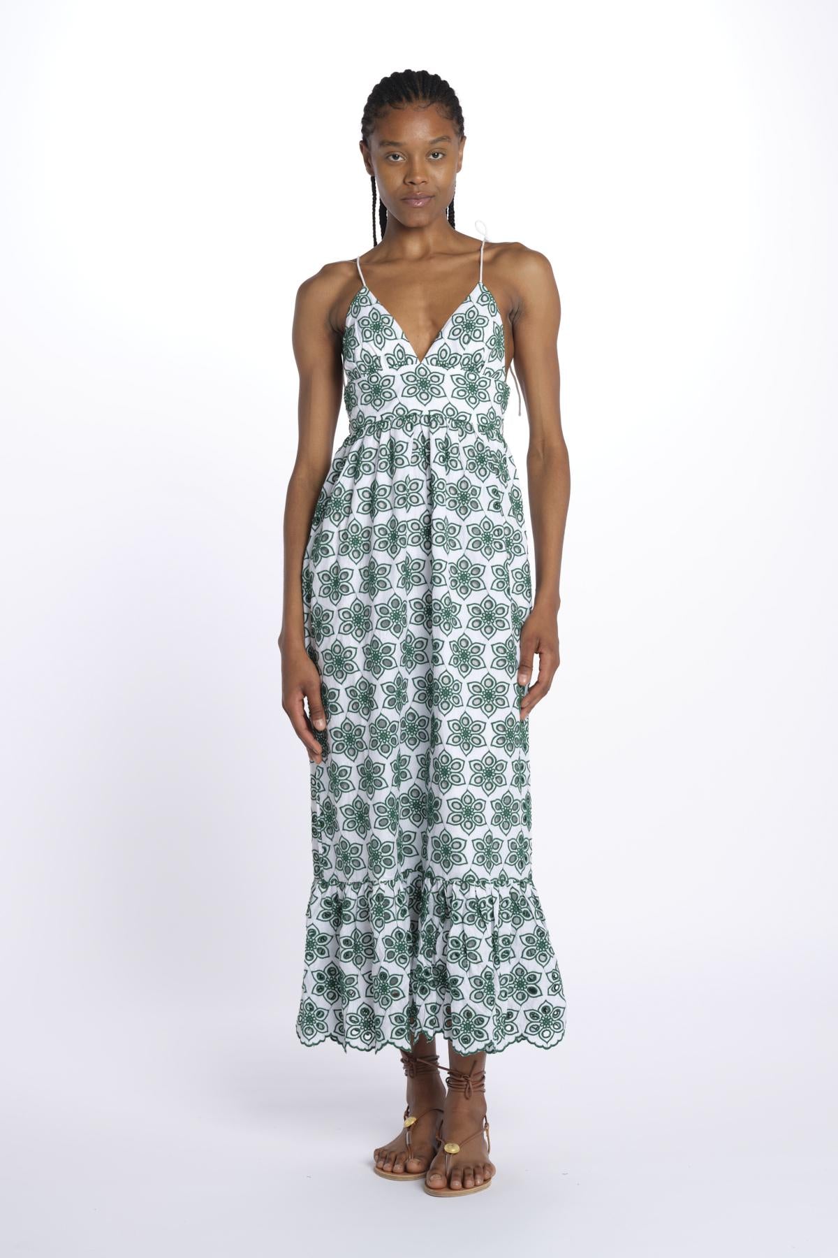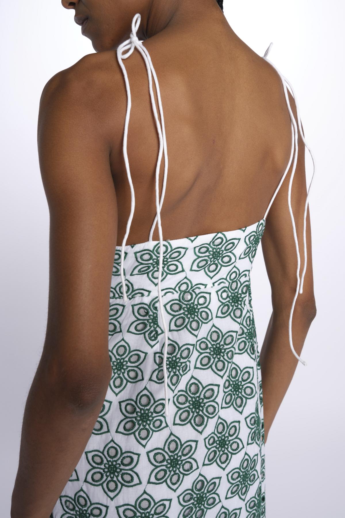 LOUVE shoulder strap dress with flower embroidery by sundress. The model is 174 cm tall and wears a size S. Composition: 100% cotton.