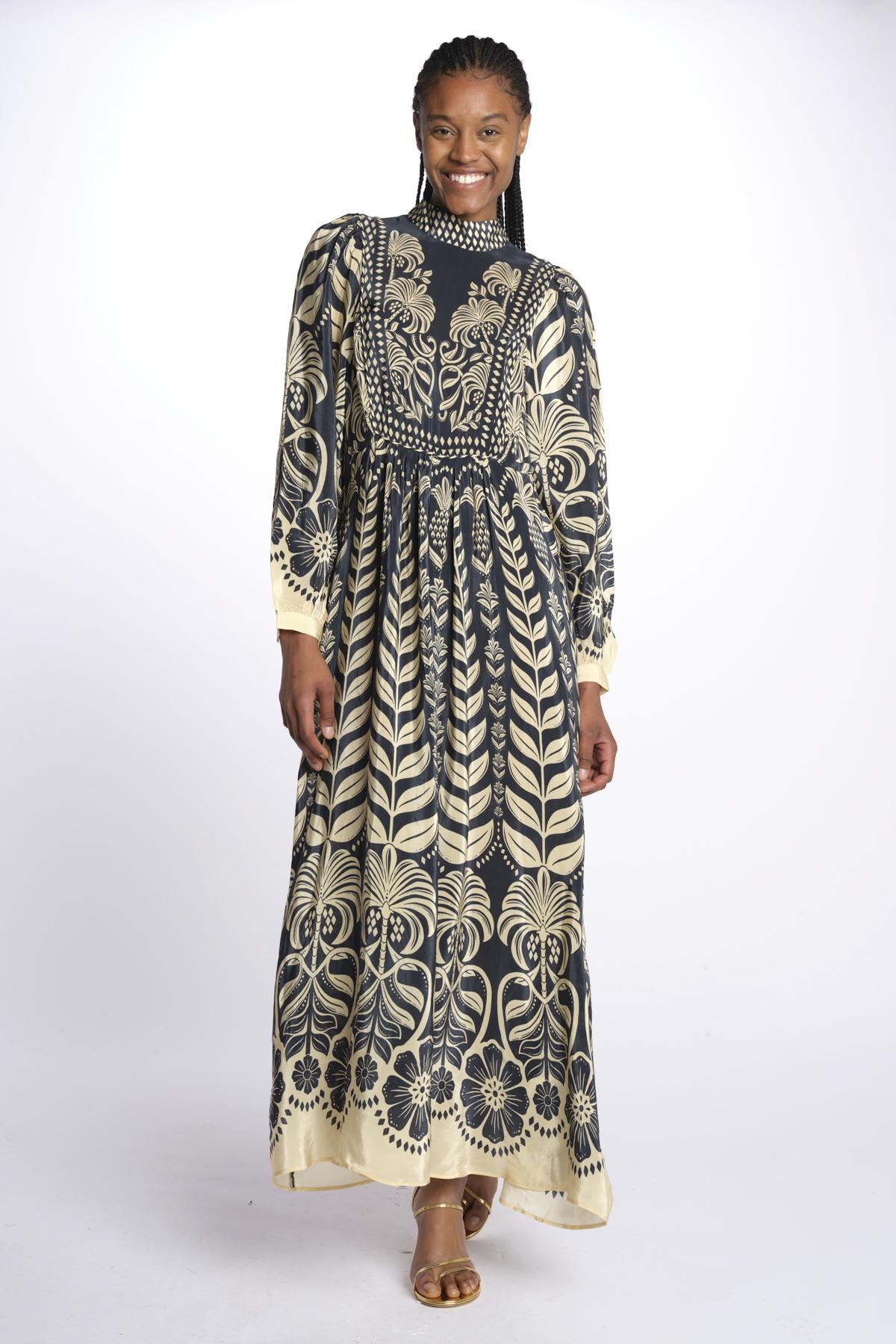 AINIKA two-tone print long dress by farm rio. The model is 174 cm tall and wears a size S.