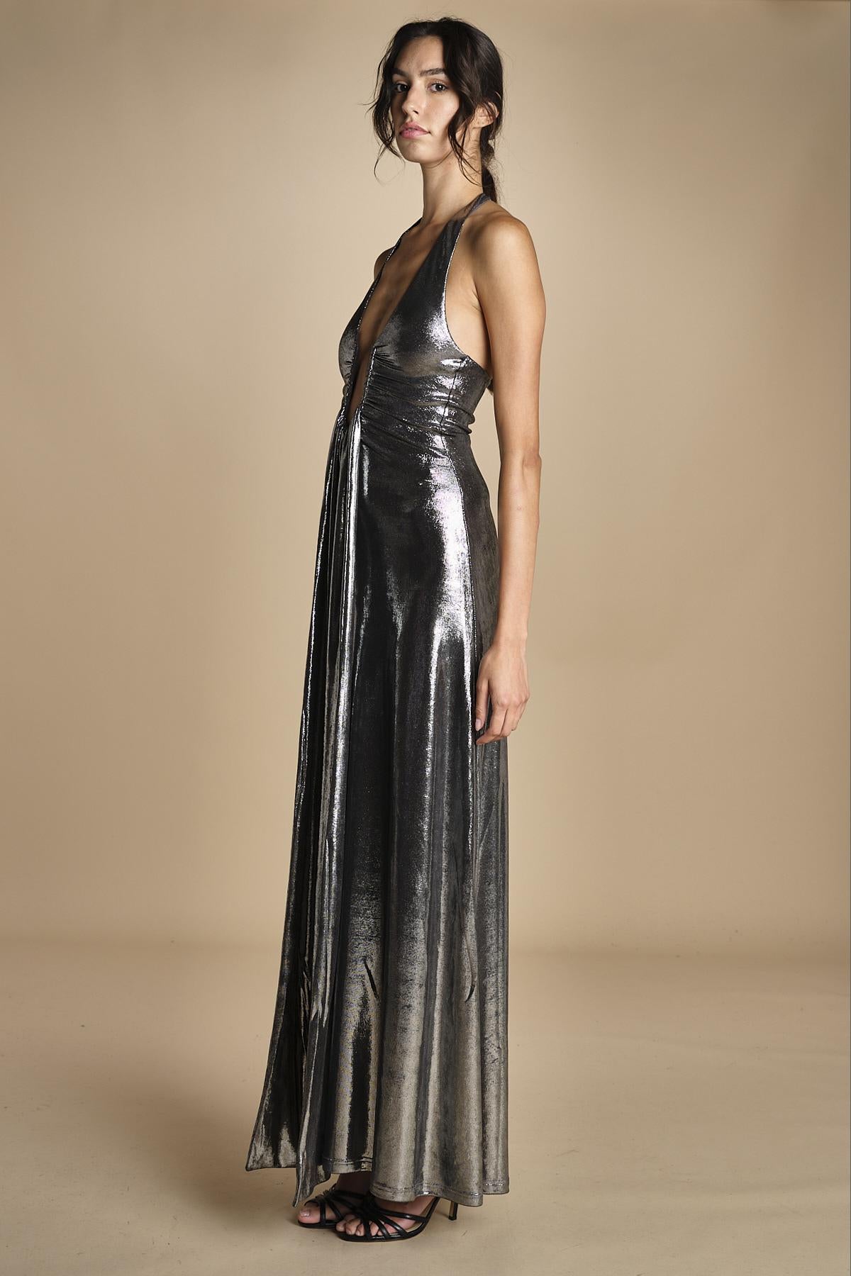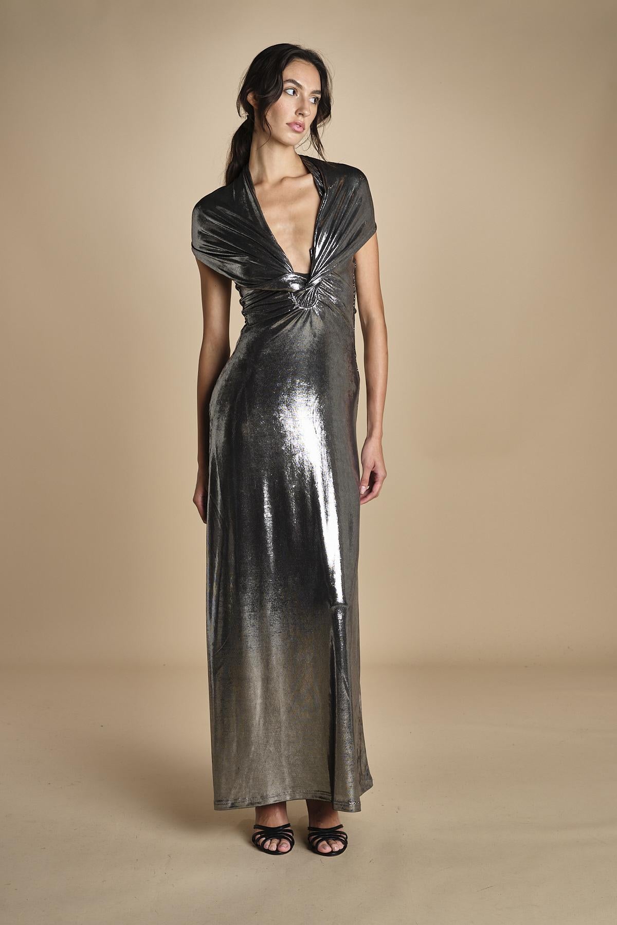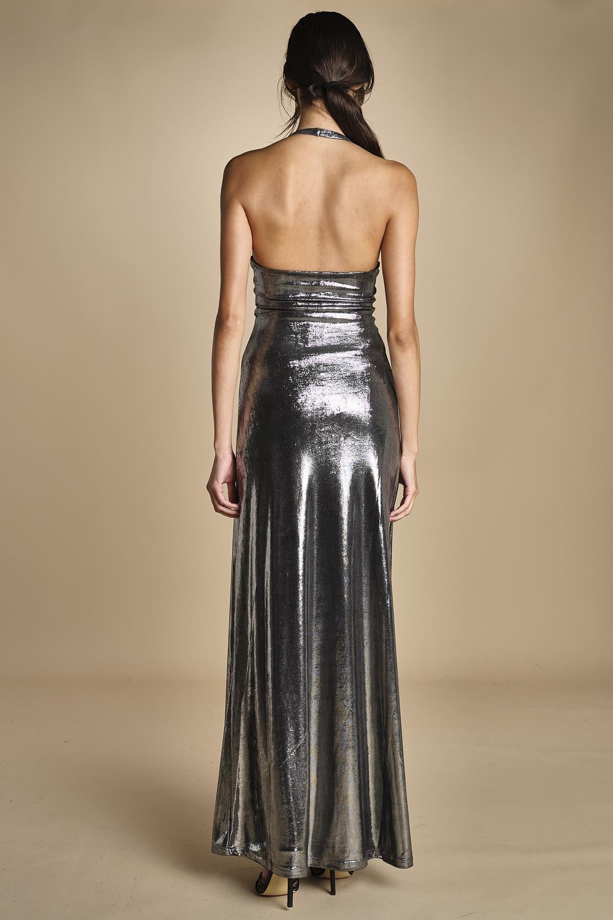 abito lungo laminato. La modella è alta 176 cm e indossa una taglia s. 95% poliestere 5% elastane