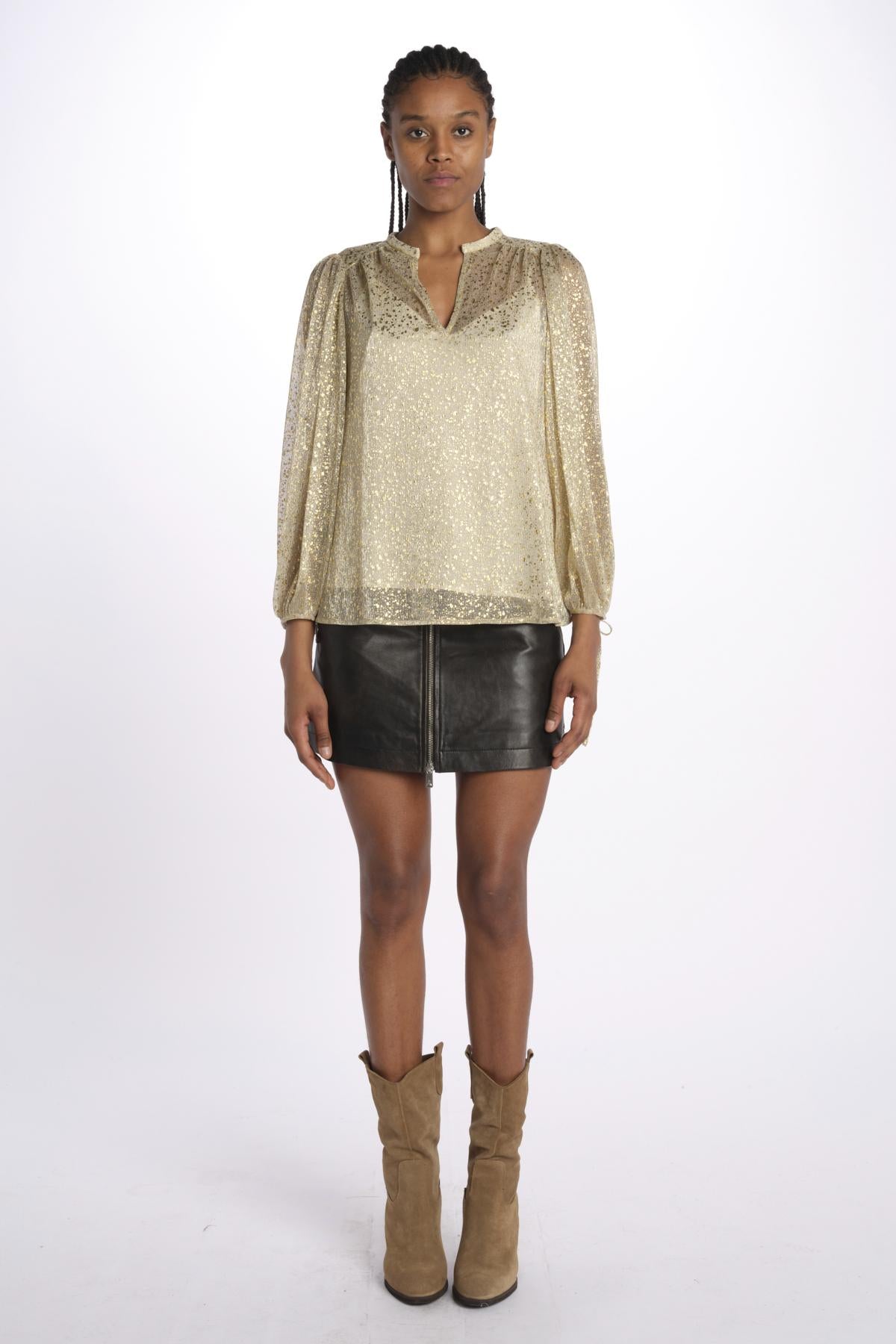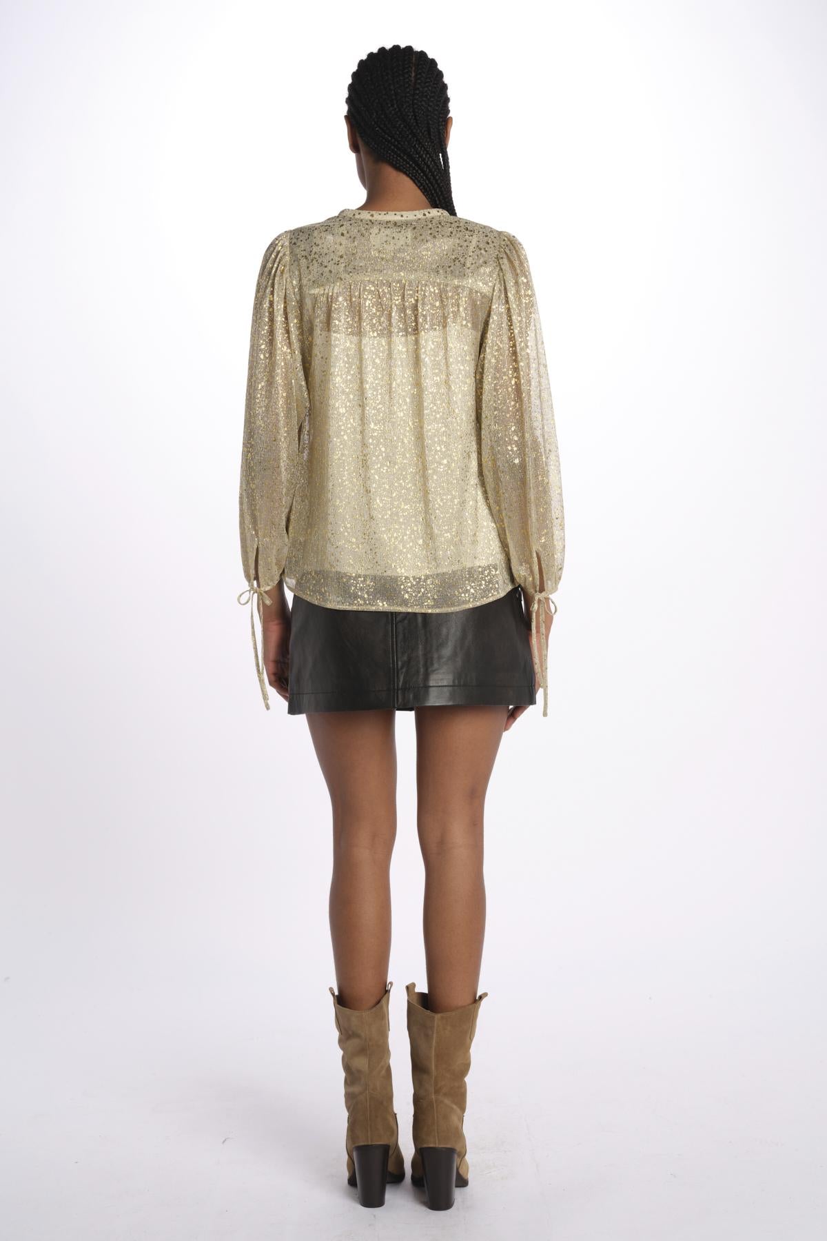 Gold print shirt by ba&sh. The model is 174 cm tall and wears a 0 (IT 38). Composition: 55% polyester, 45% polyester film.