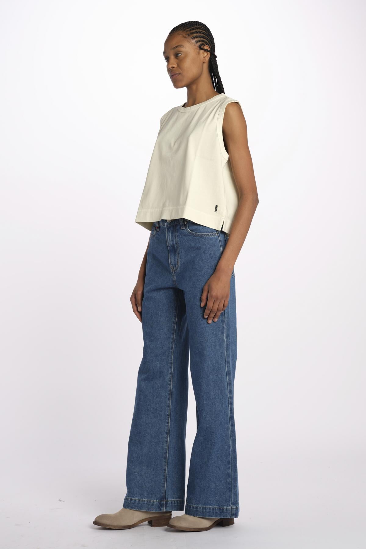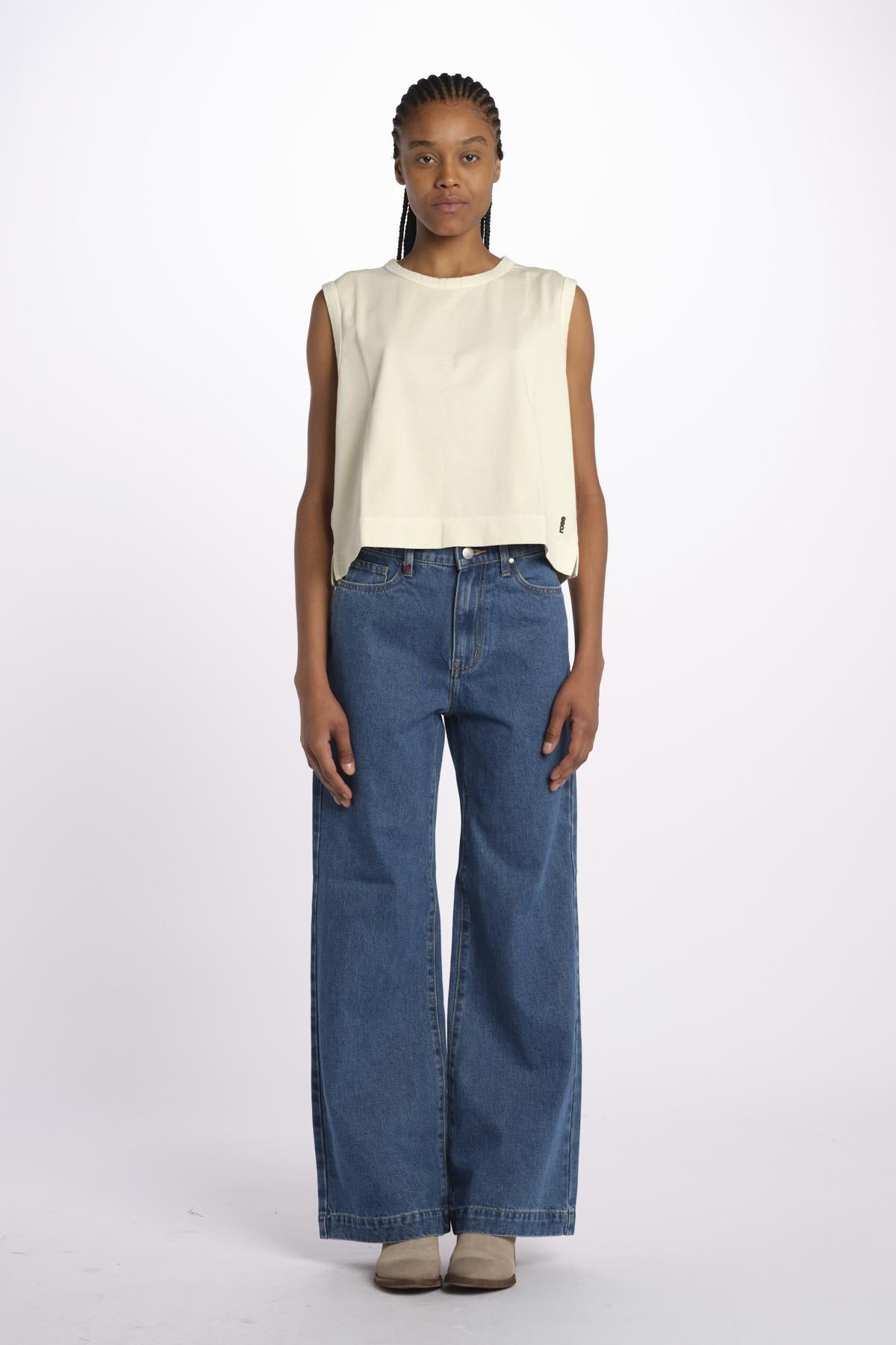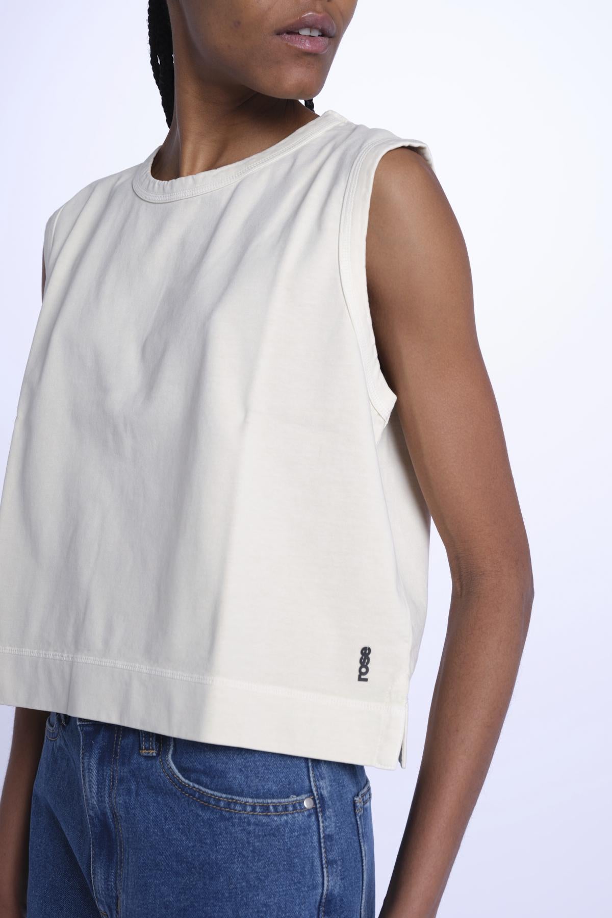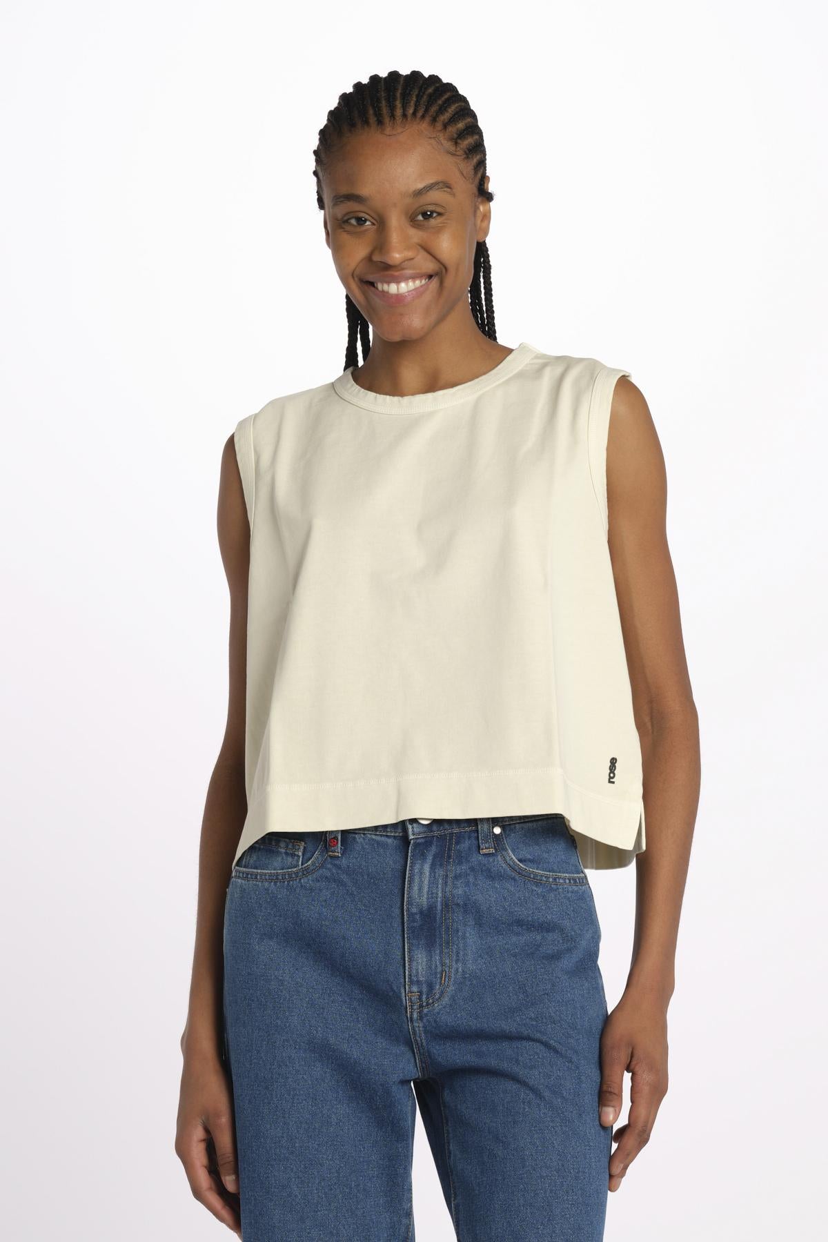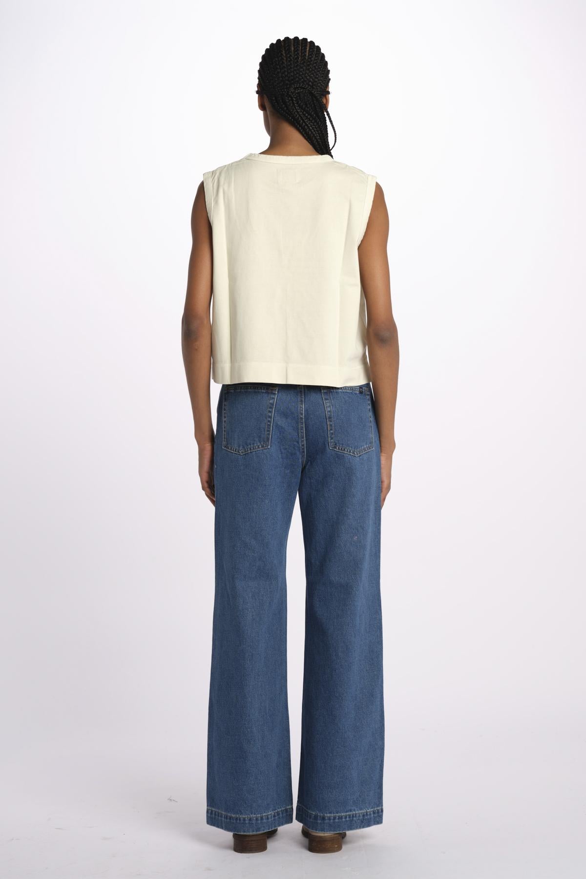 CUARE sleeveless t-shirt by bellerose. The model is 174 cm tall and wears a size 34 (IT38). Composition: 100% cotton.