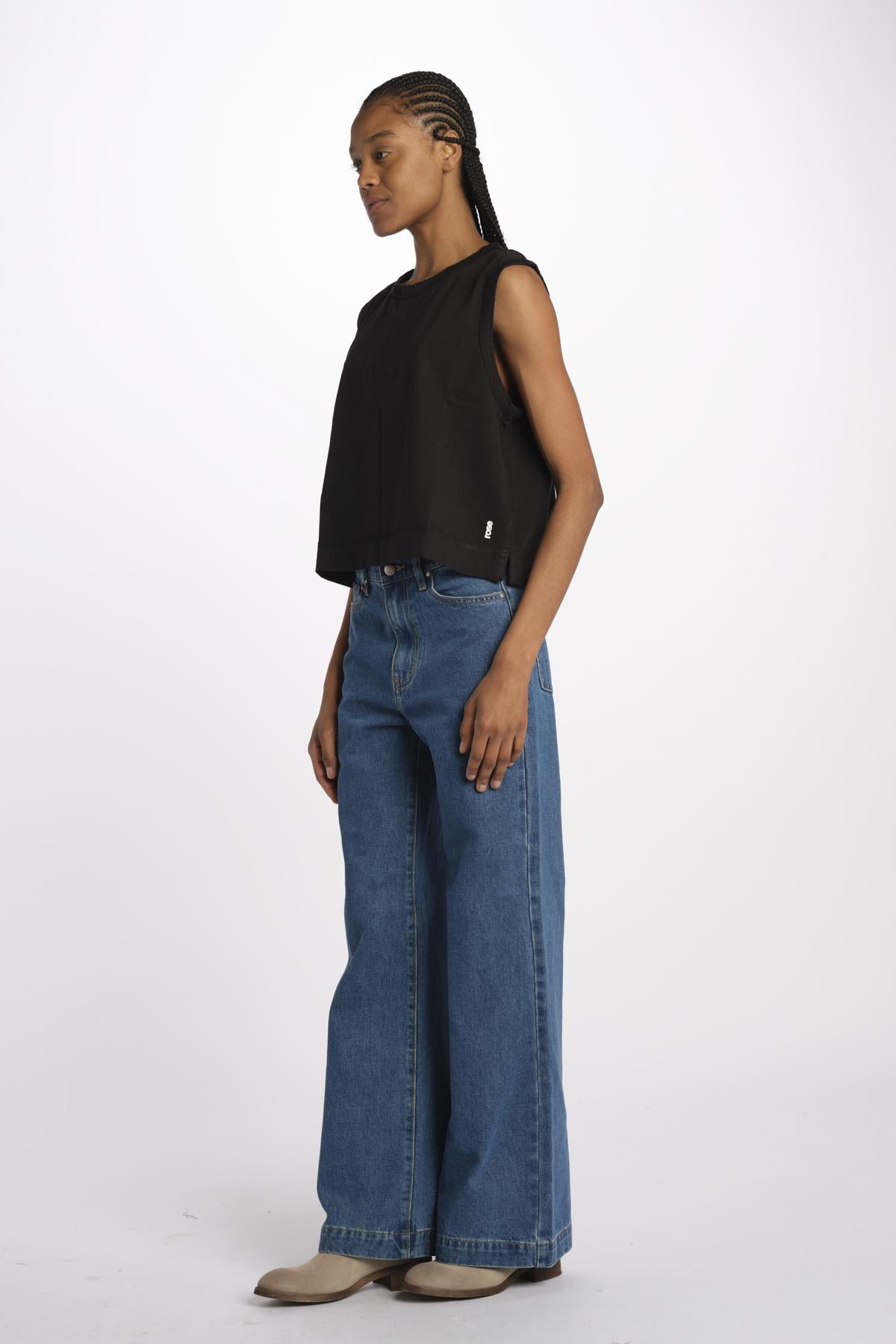 CUARE sleeveless t-shirt by bellerose. The model is 174 cm tall and wears a size 34 (IT38). Composition: 100% cotton.