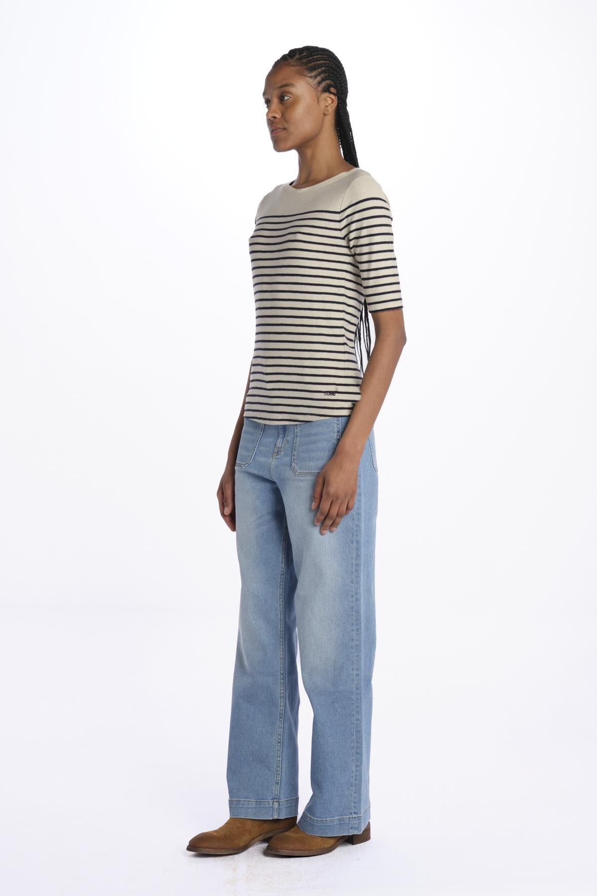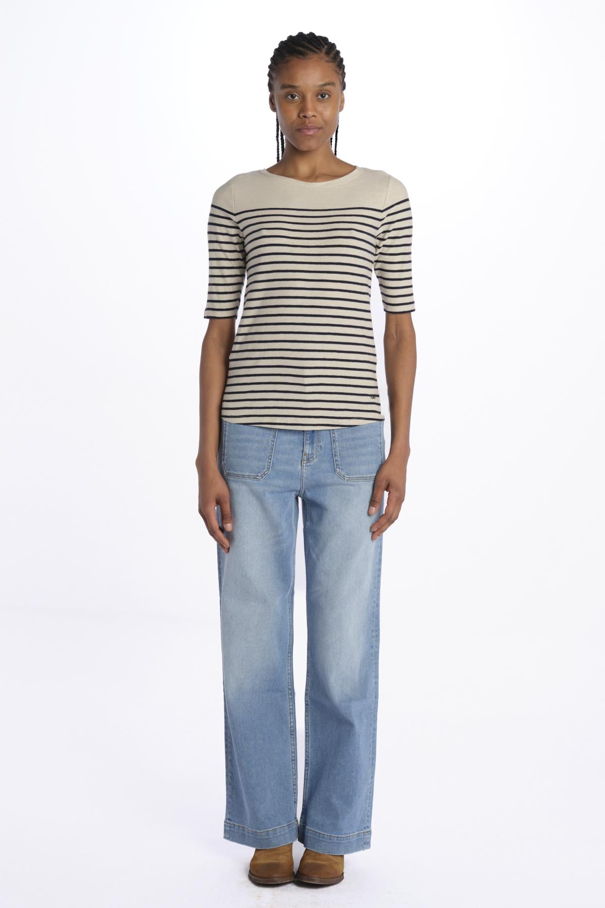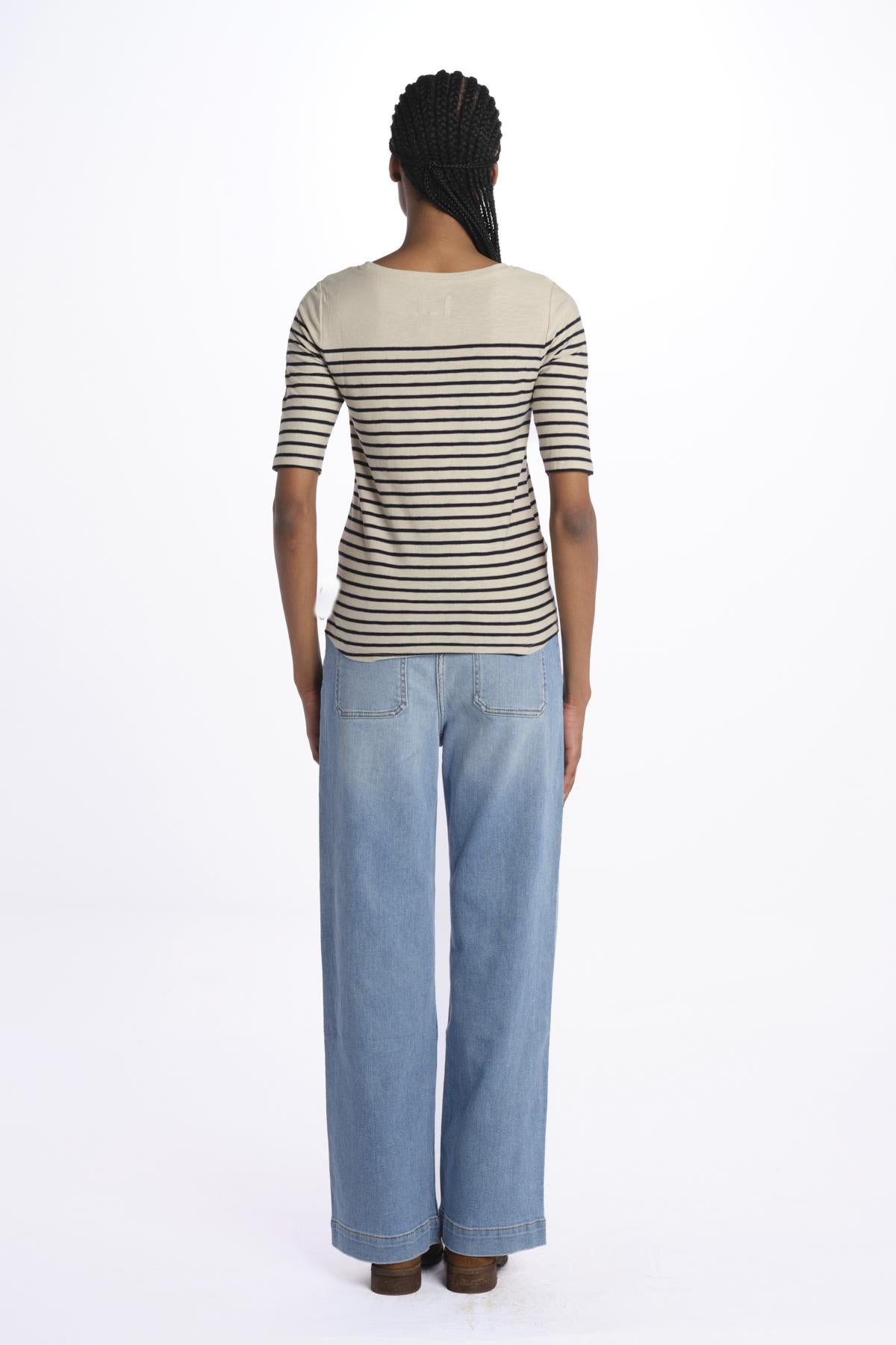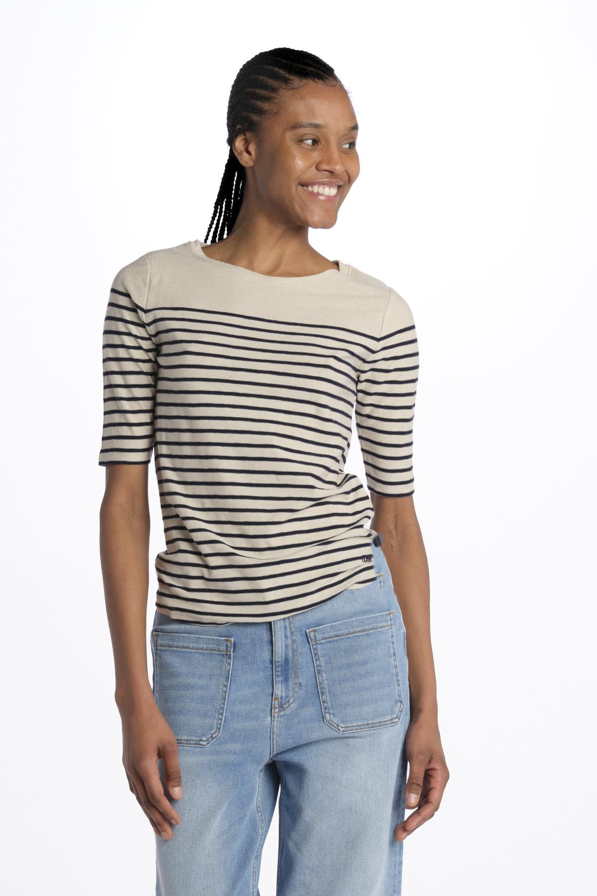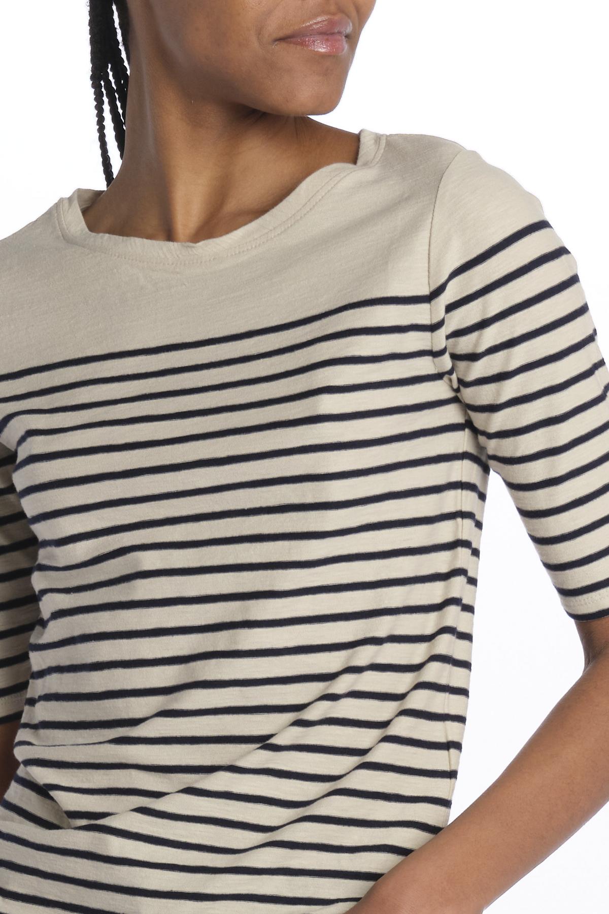 MIAS 3/4 Sleeve Striped T-Shirt by bellerose. The model is 174 cm tall and wears a size S. Composition: 100% cotton.