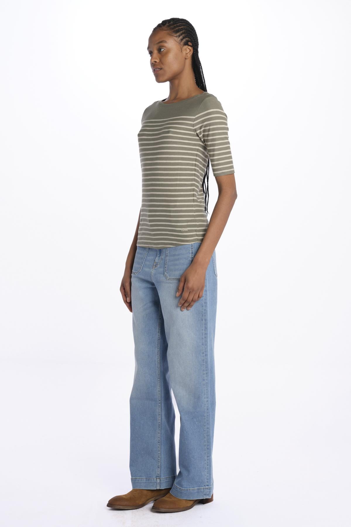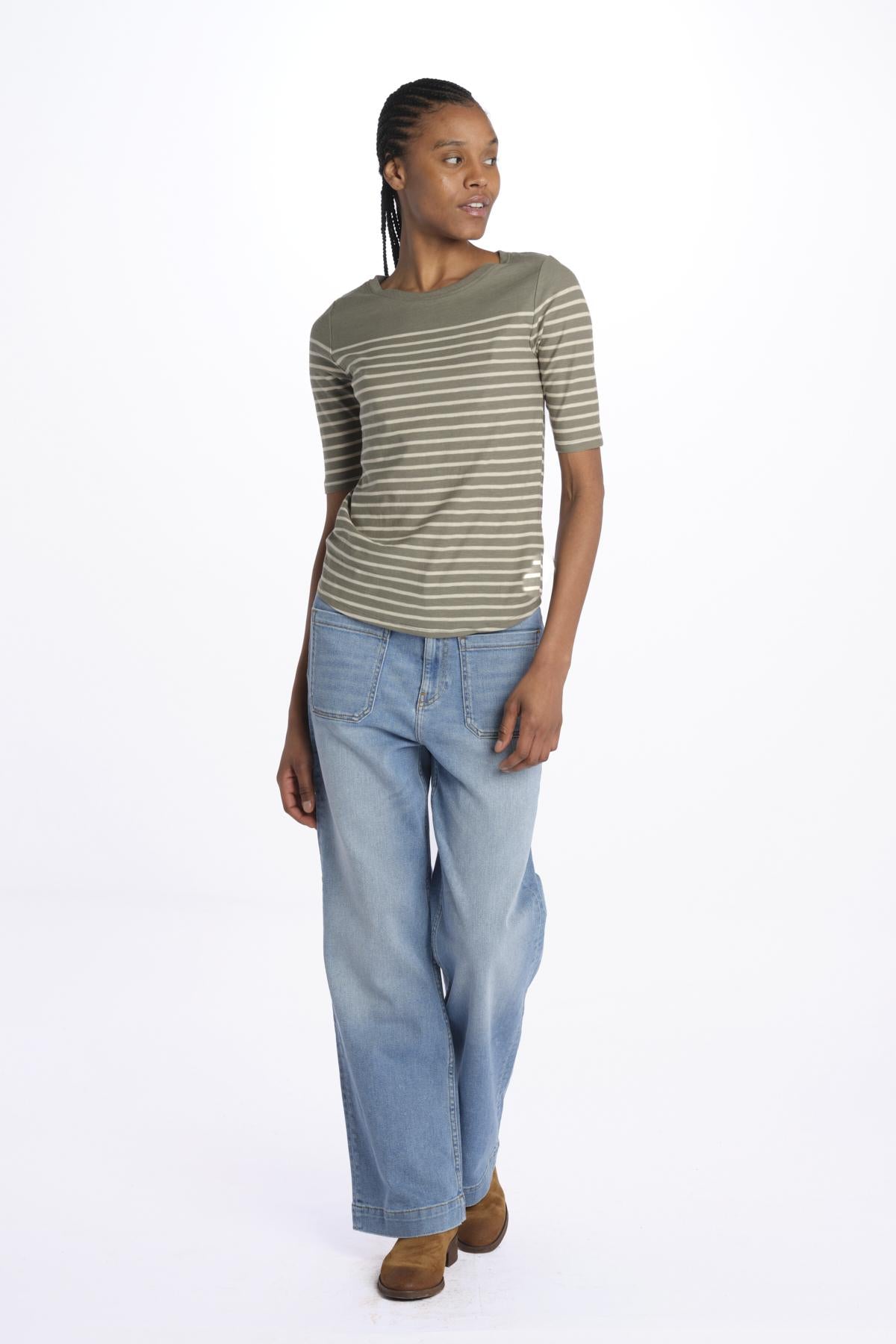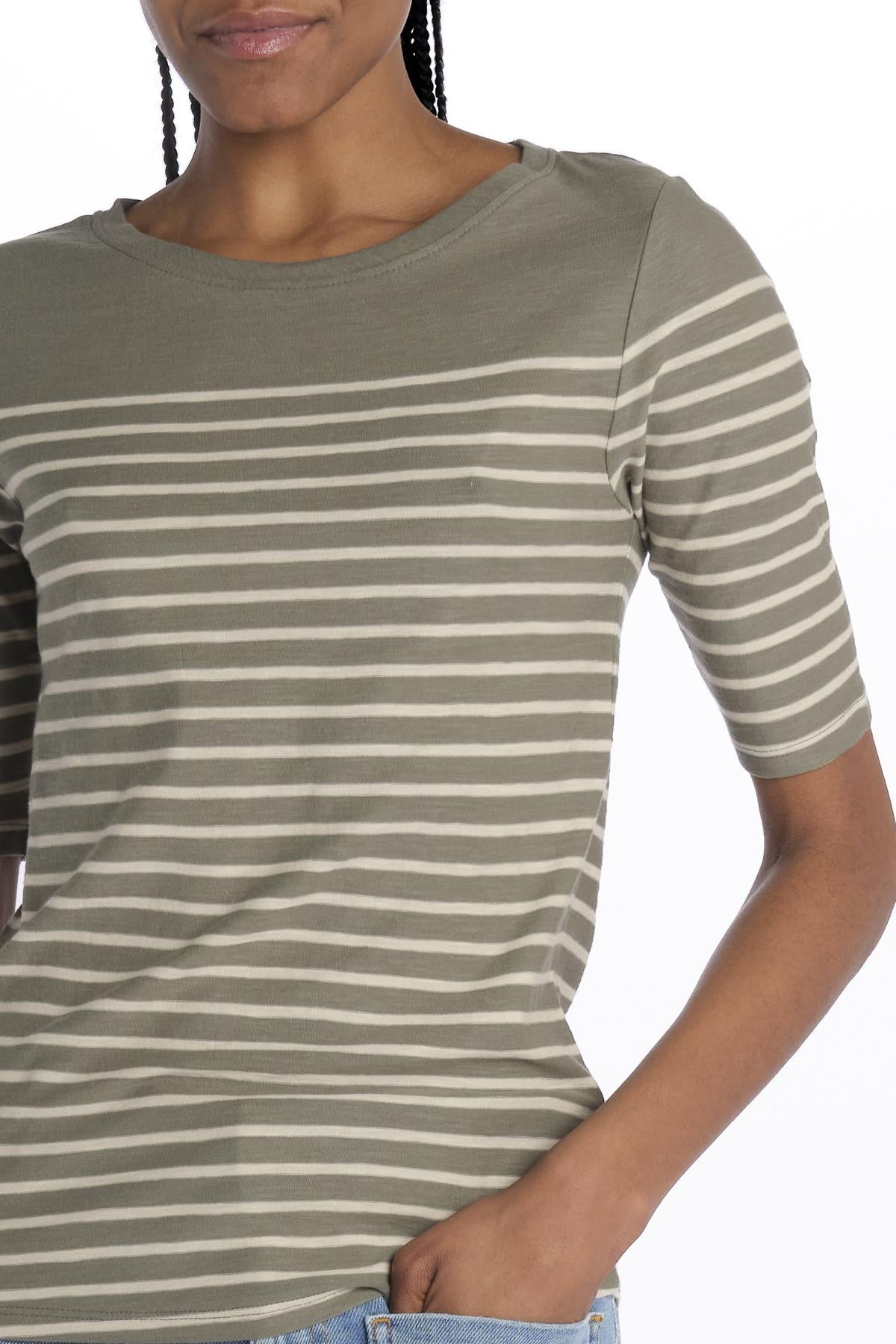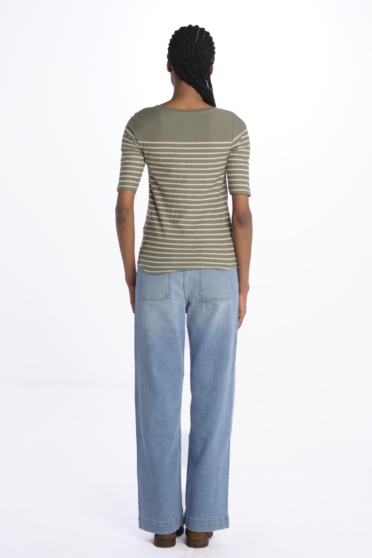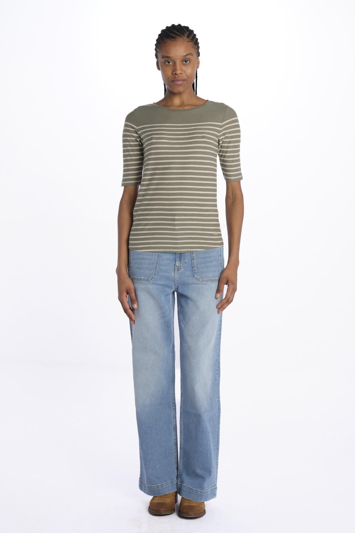 MIAS 3/4 Sleeve Striped T-Shirt by bellerose. The model is 174 cm tall and wears a size S. Composition: 100% cotton.