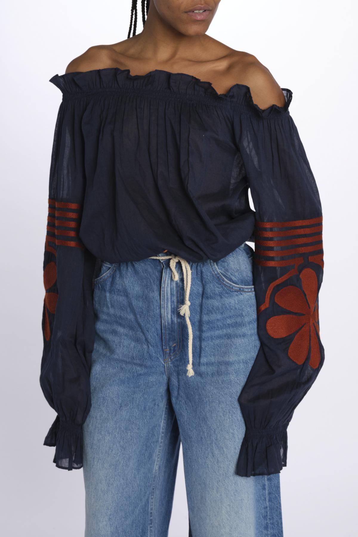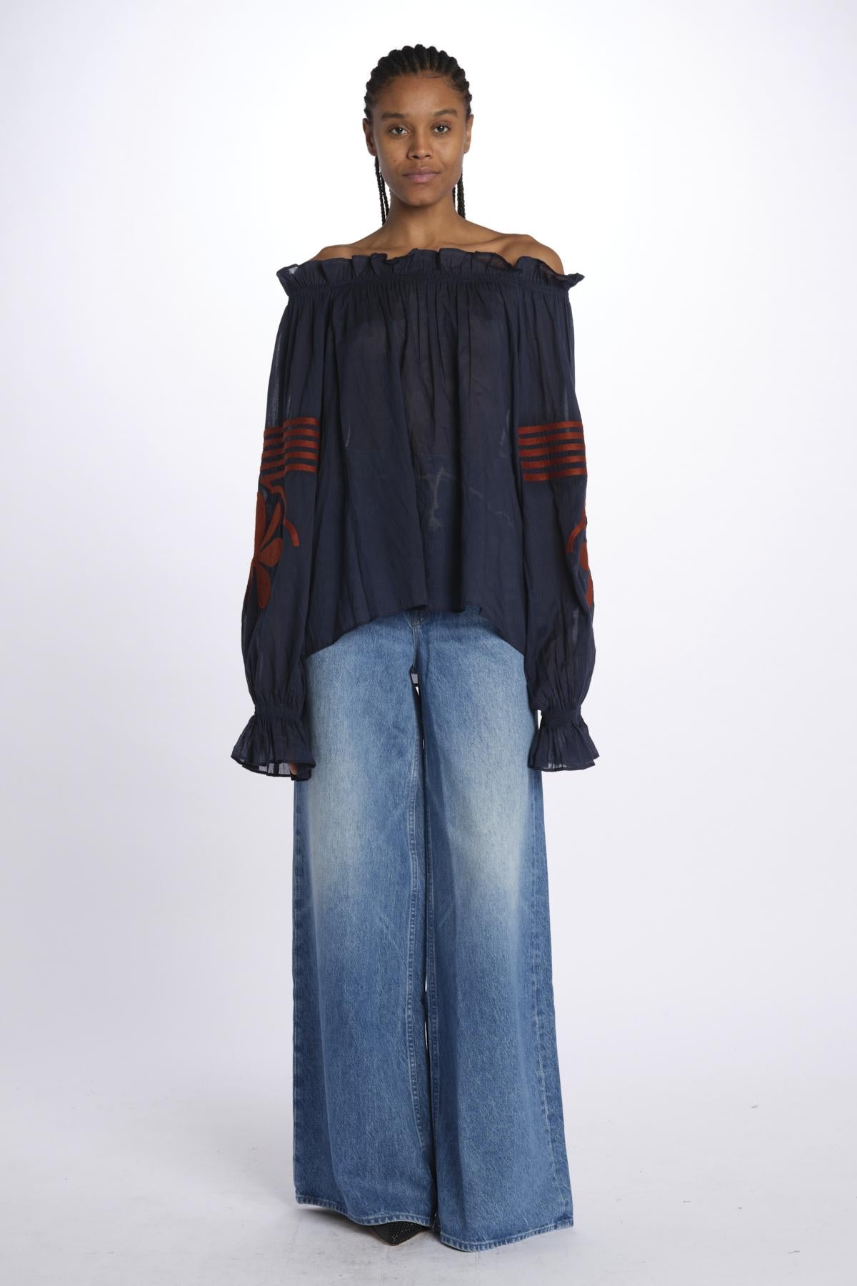 Puff Sleeve Embroidery Shirt by benaras. The model is 174 cm tall and wears a size S. Composition: 100% cotton.