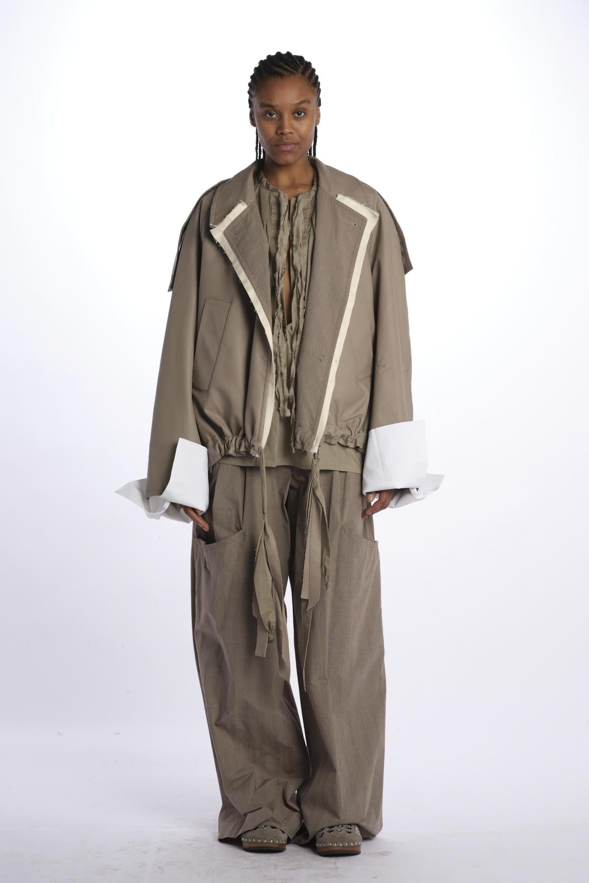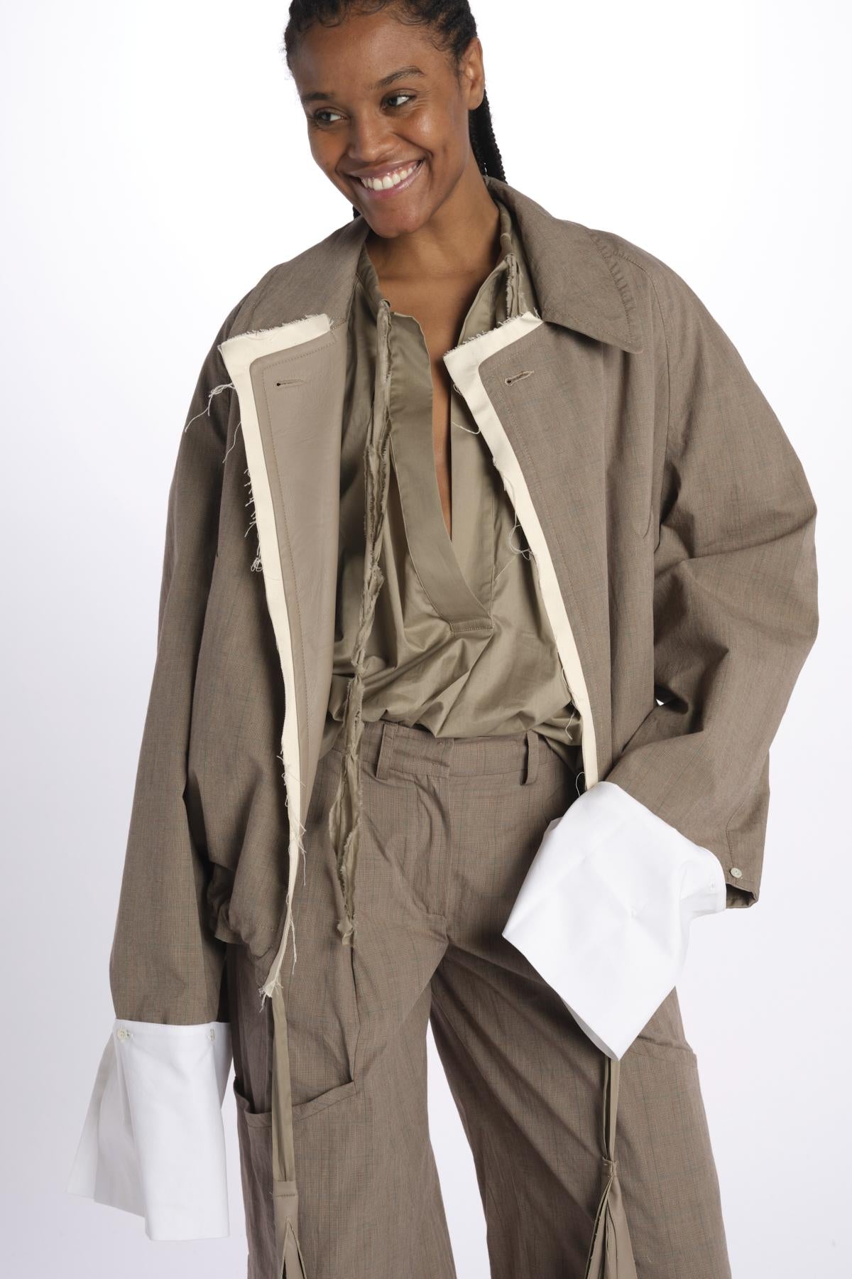 Bomber reversibile ecopelle e galles di cotone by jejia. La modella è alta 174 cm e indossa una taglia 38. Composizione: 55% viscosa, 45% poliuretano.