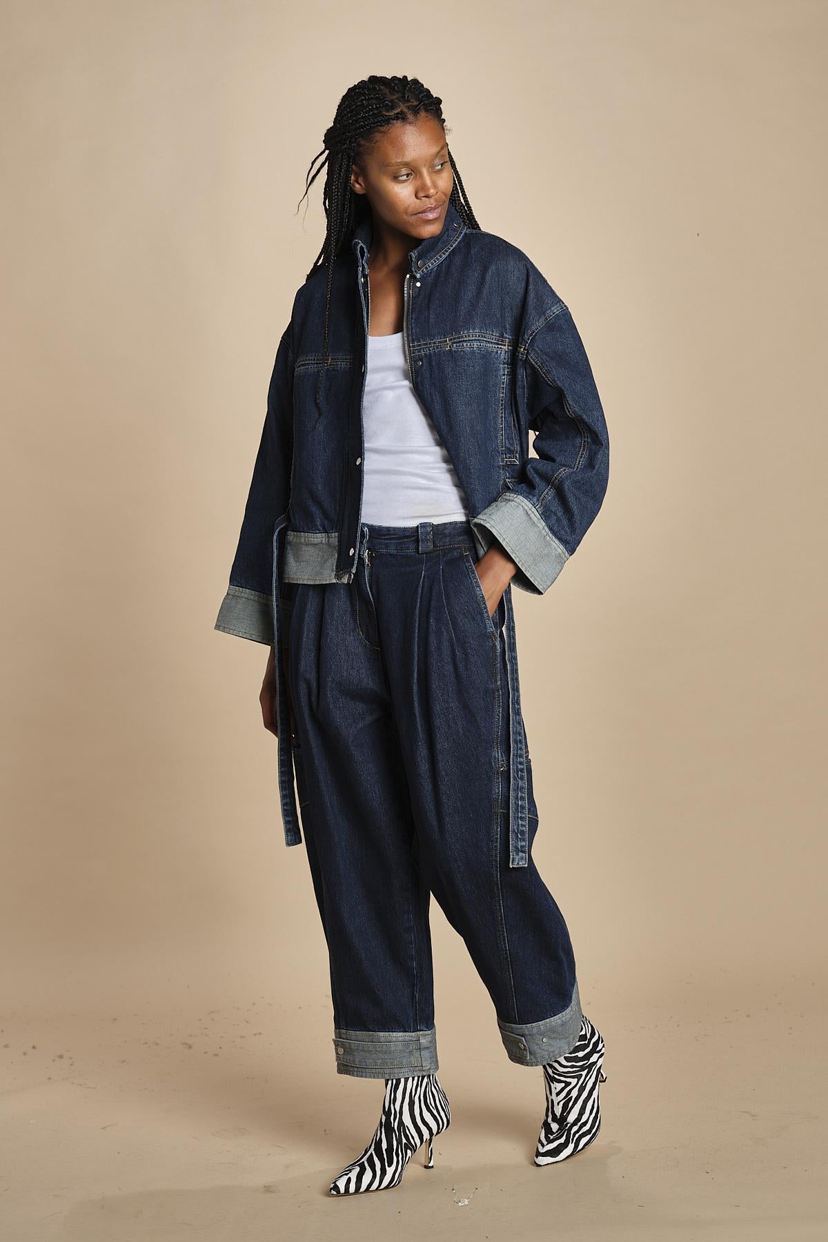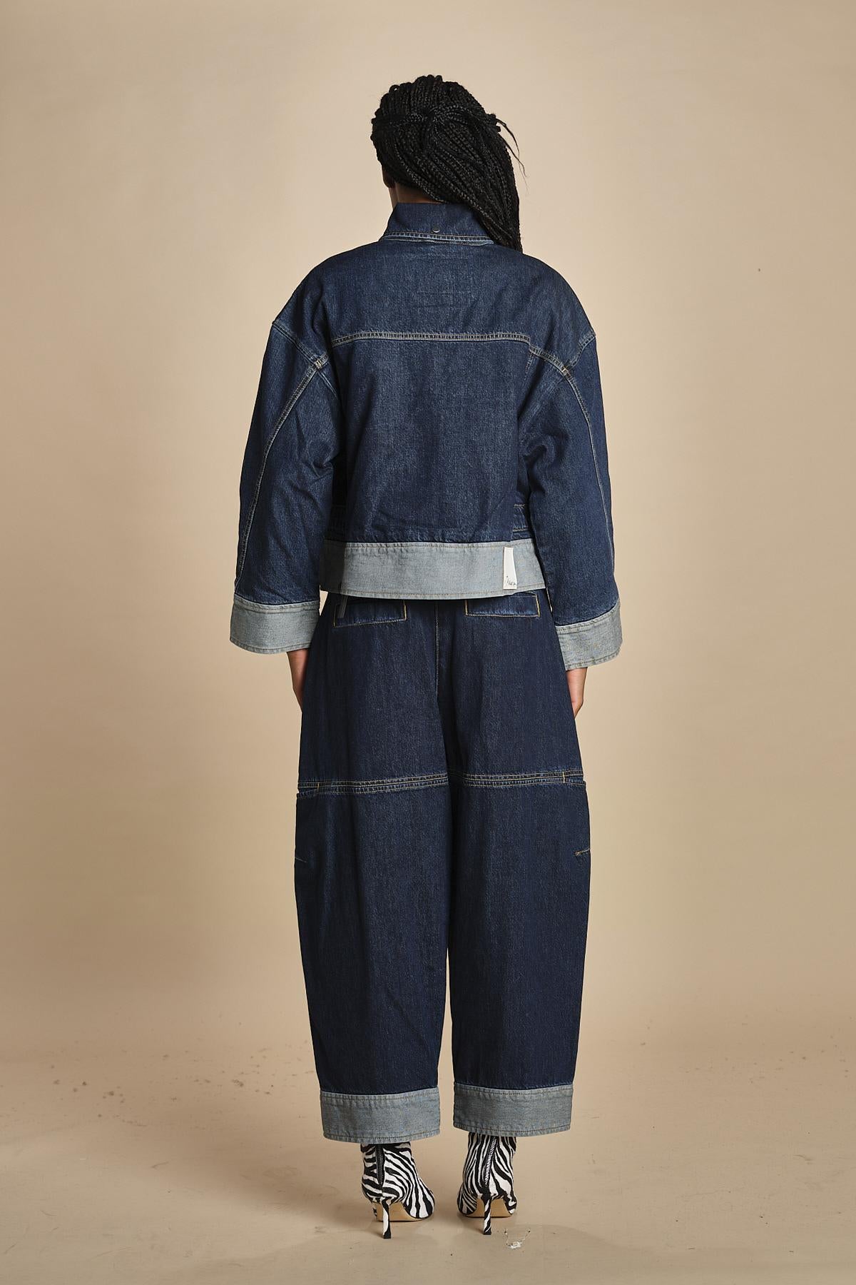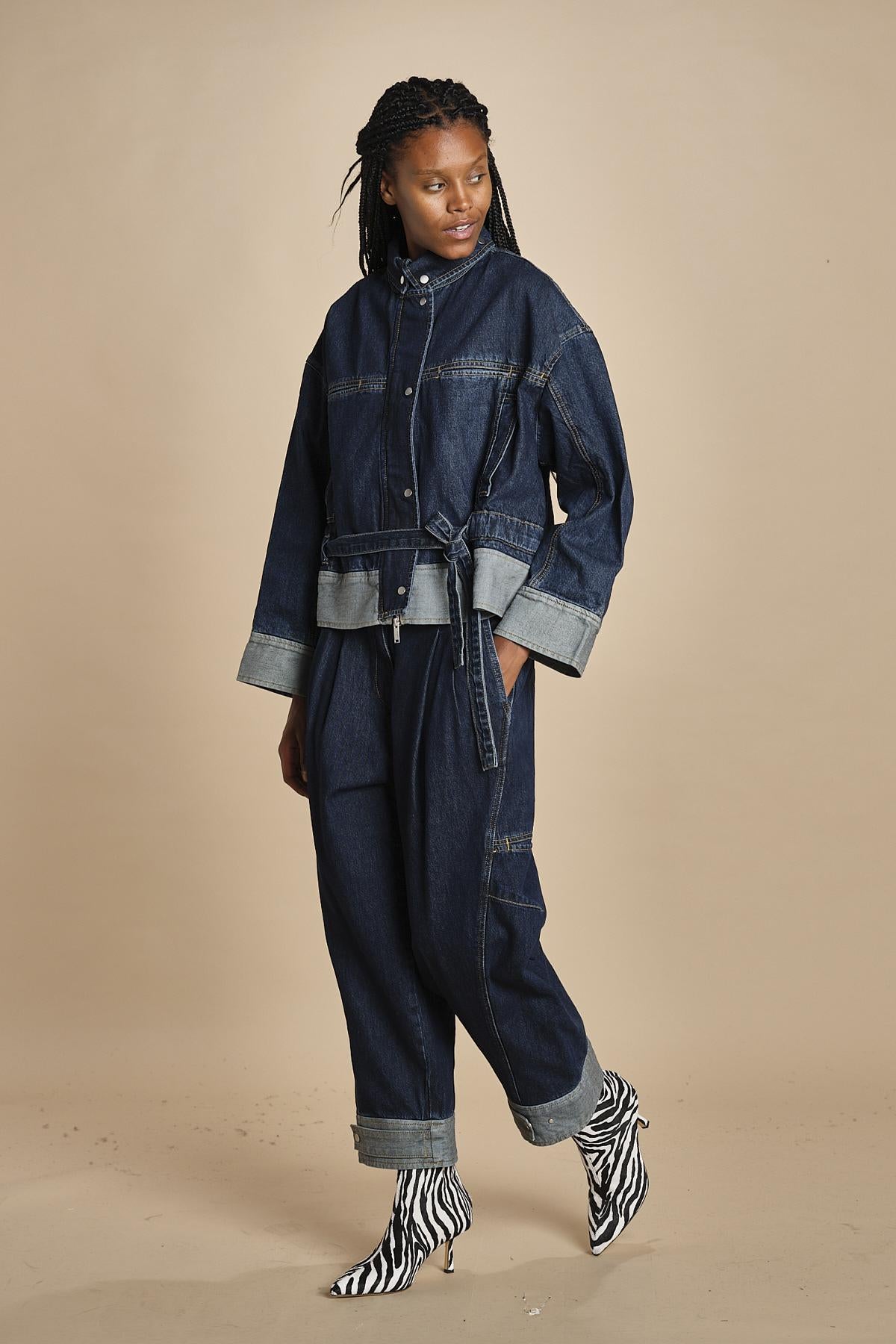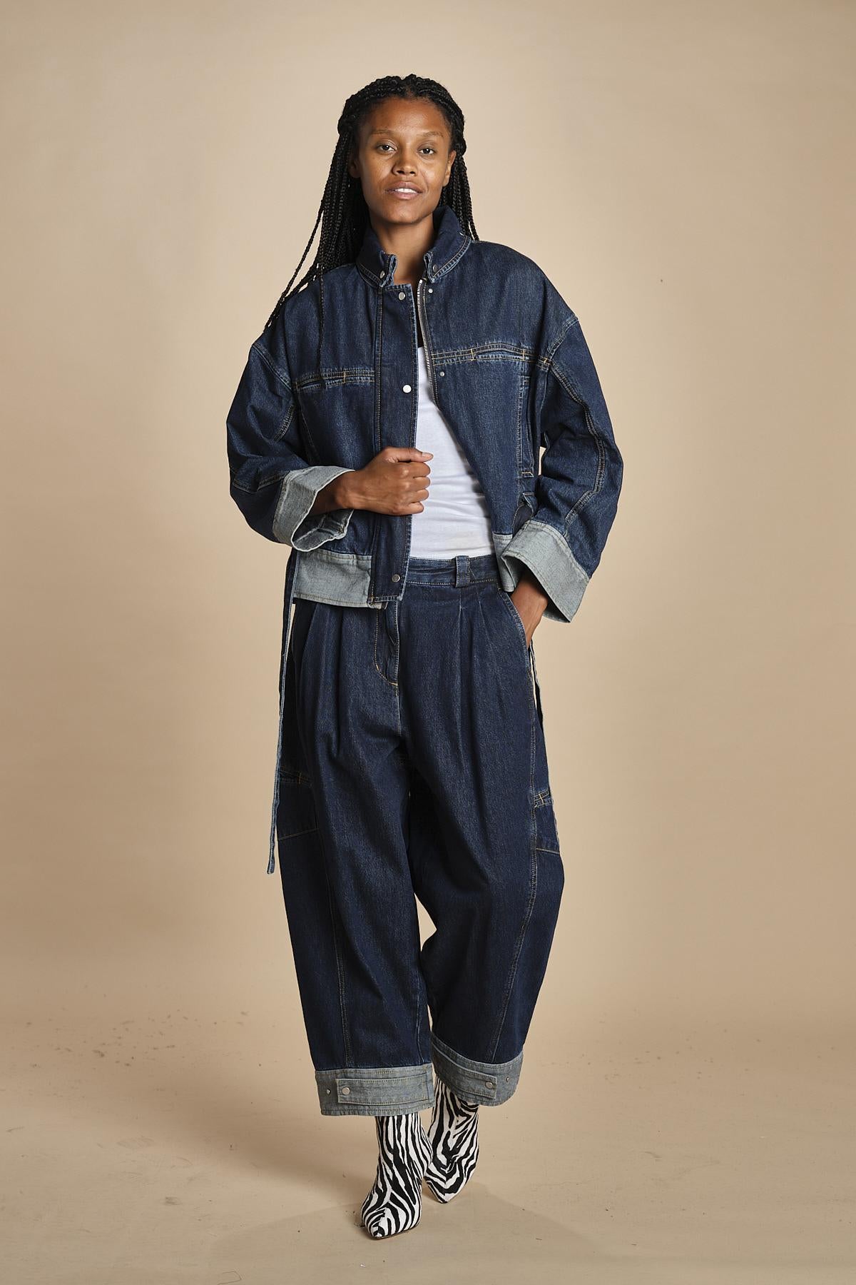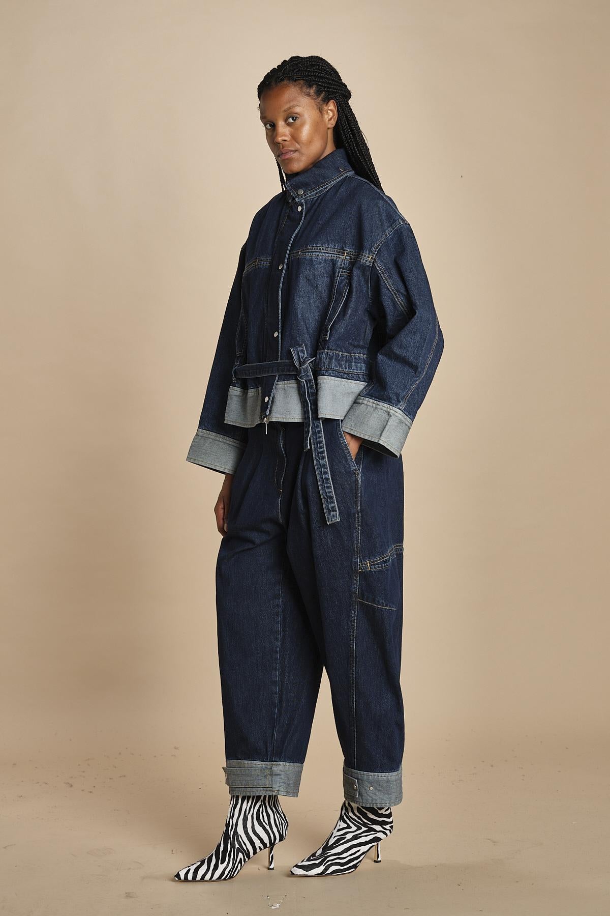 giubbotto over in denim by phillip lim. La modella è alta 174 cm e indossa una taglia S. Composizione: 100% cotone.