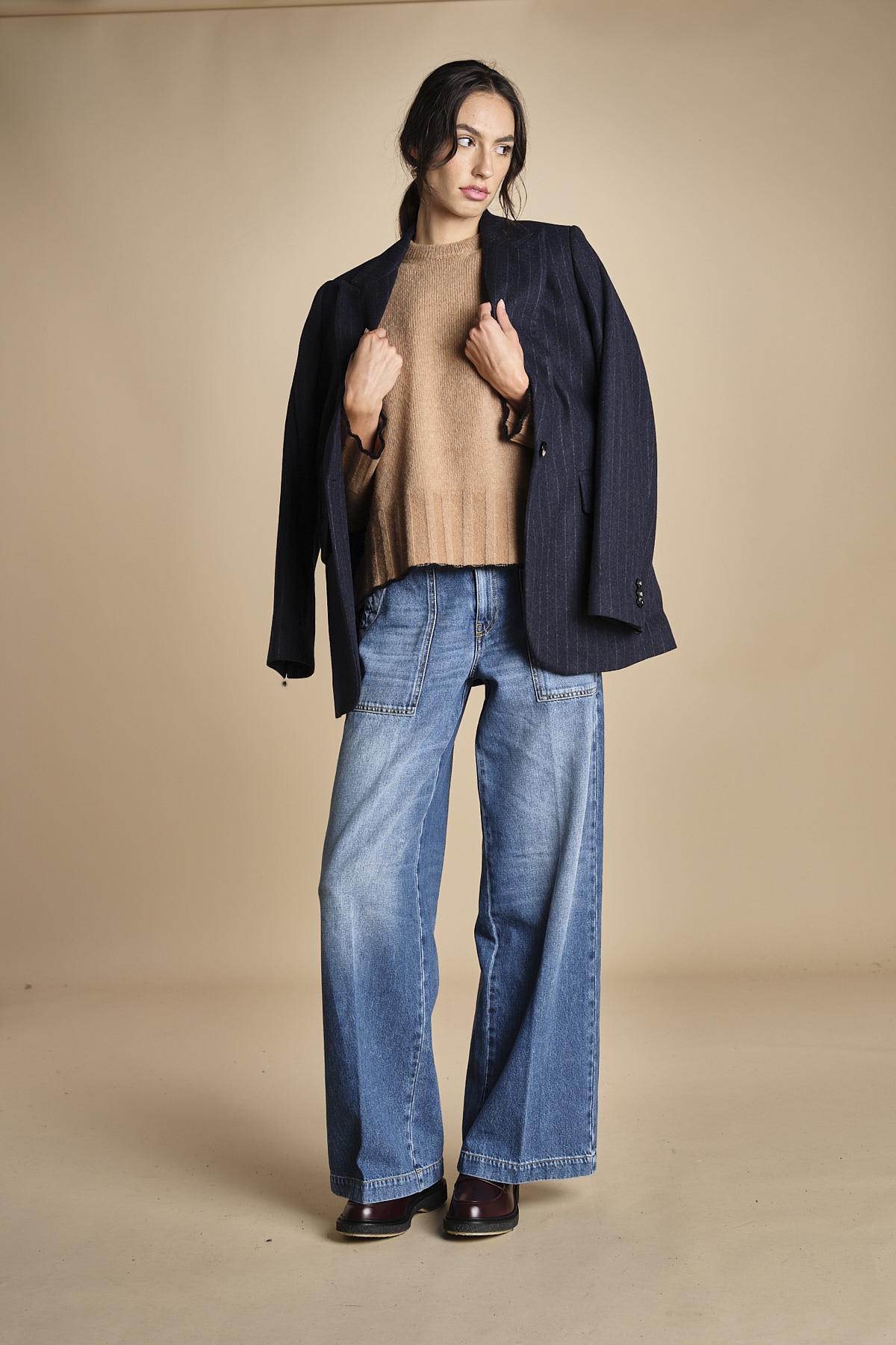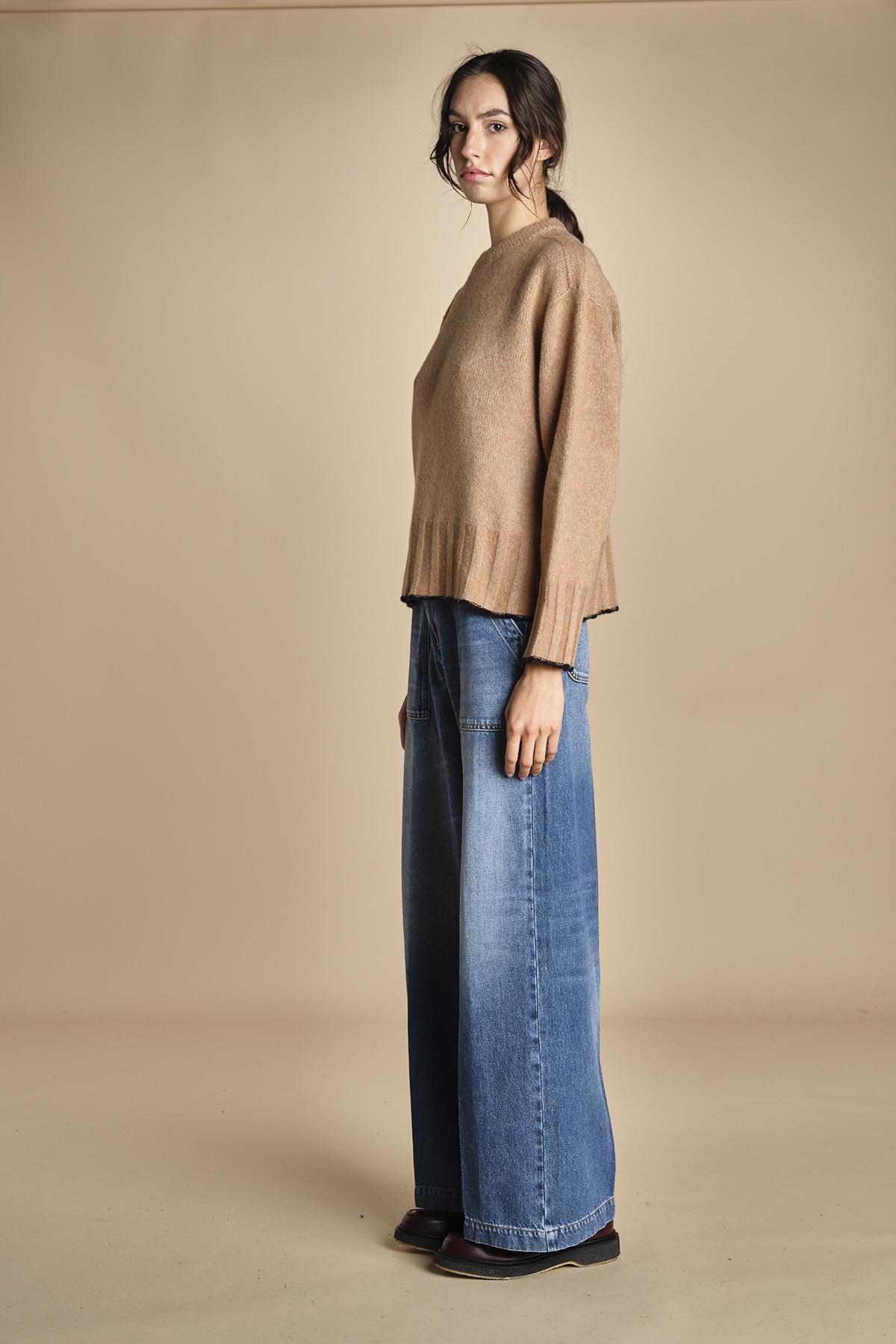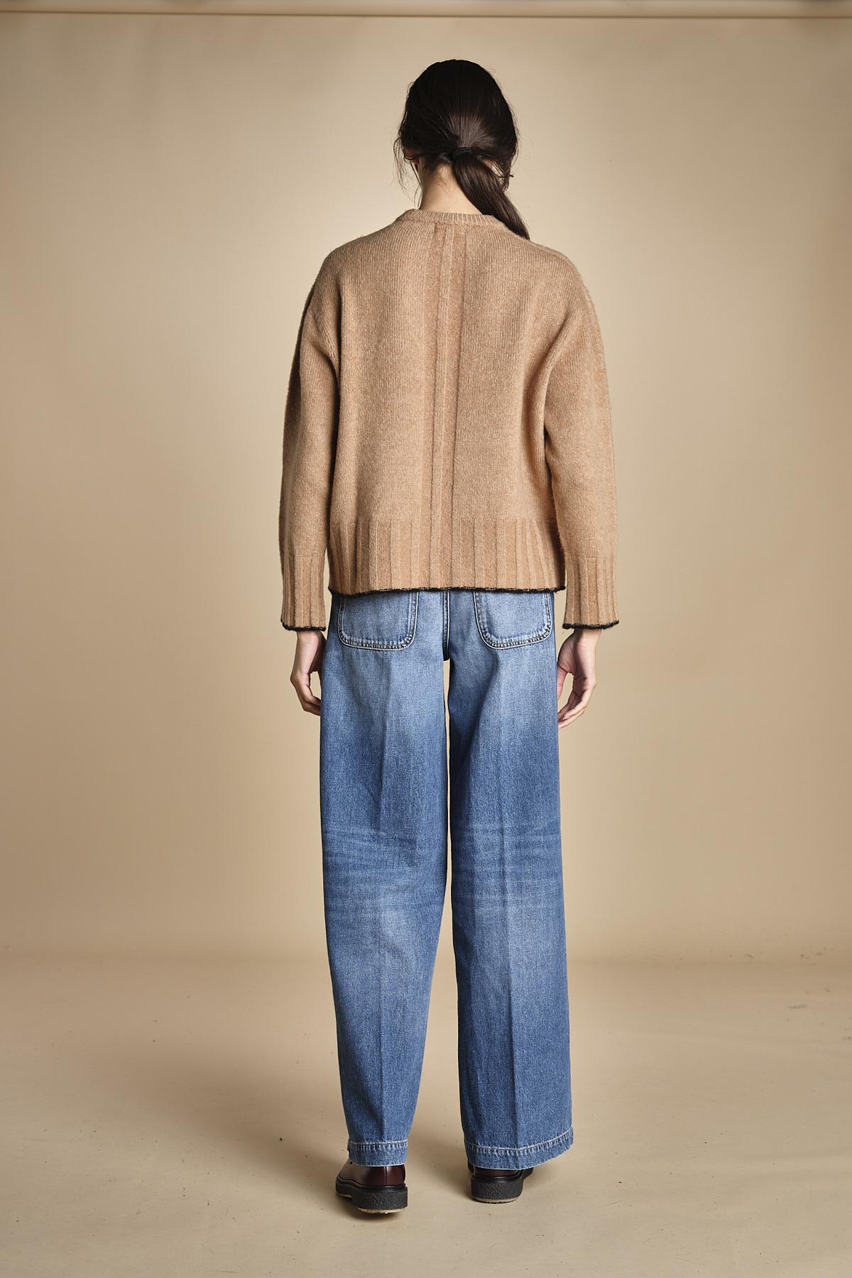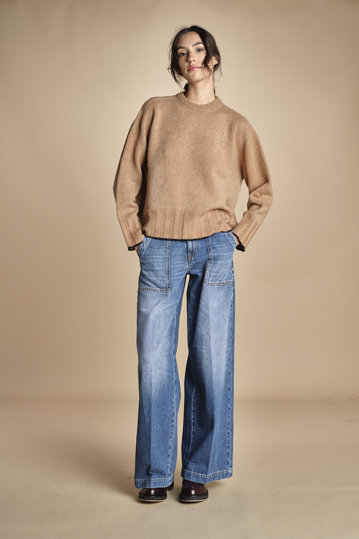 maglia girocollo over. La modella è alta 180 cm e indossa una taglia s. 75% LANA 25% POLIAMMIDE