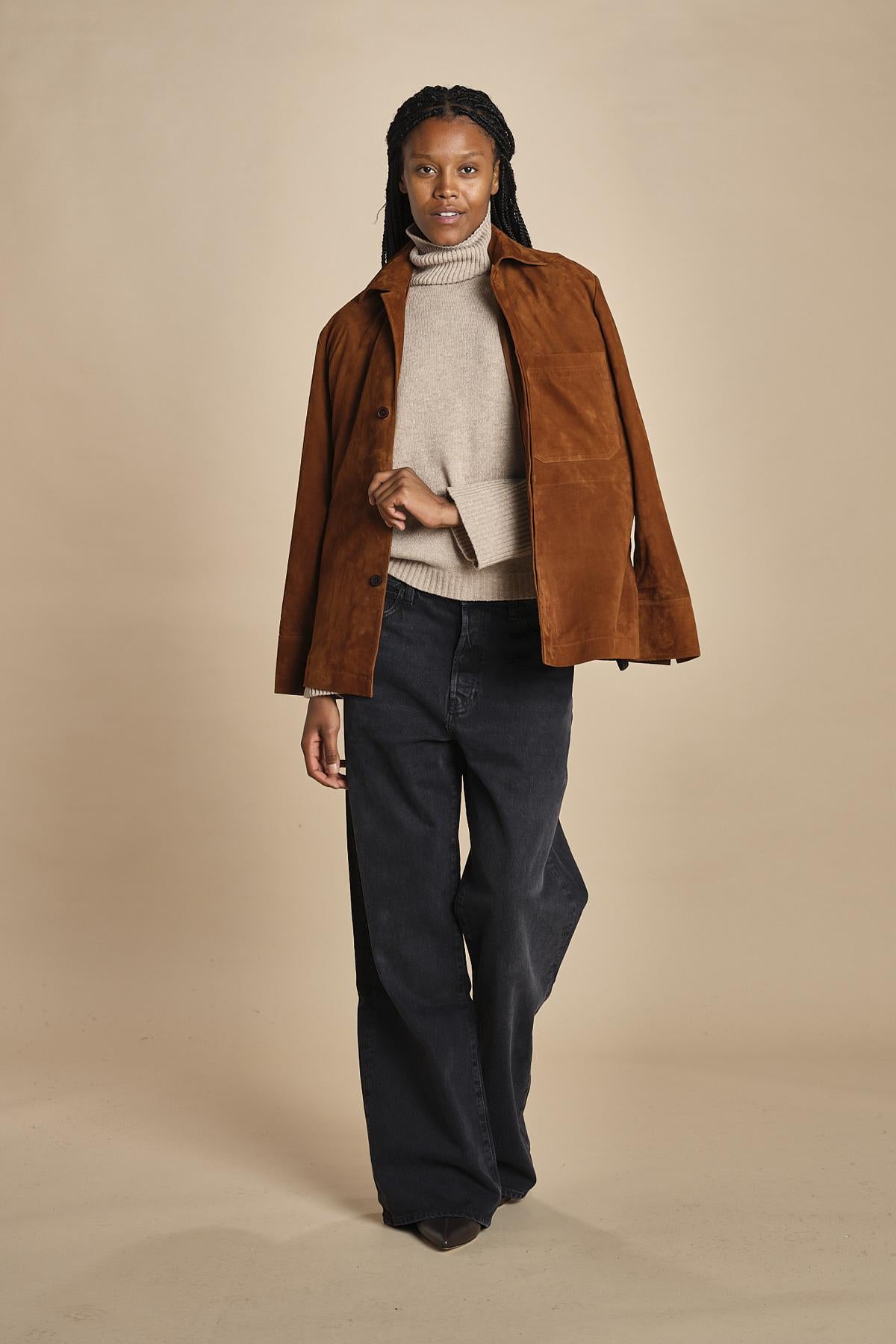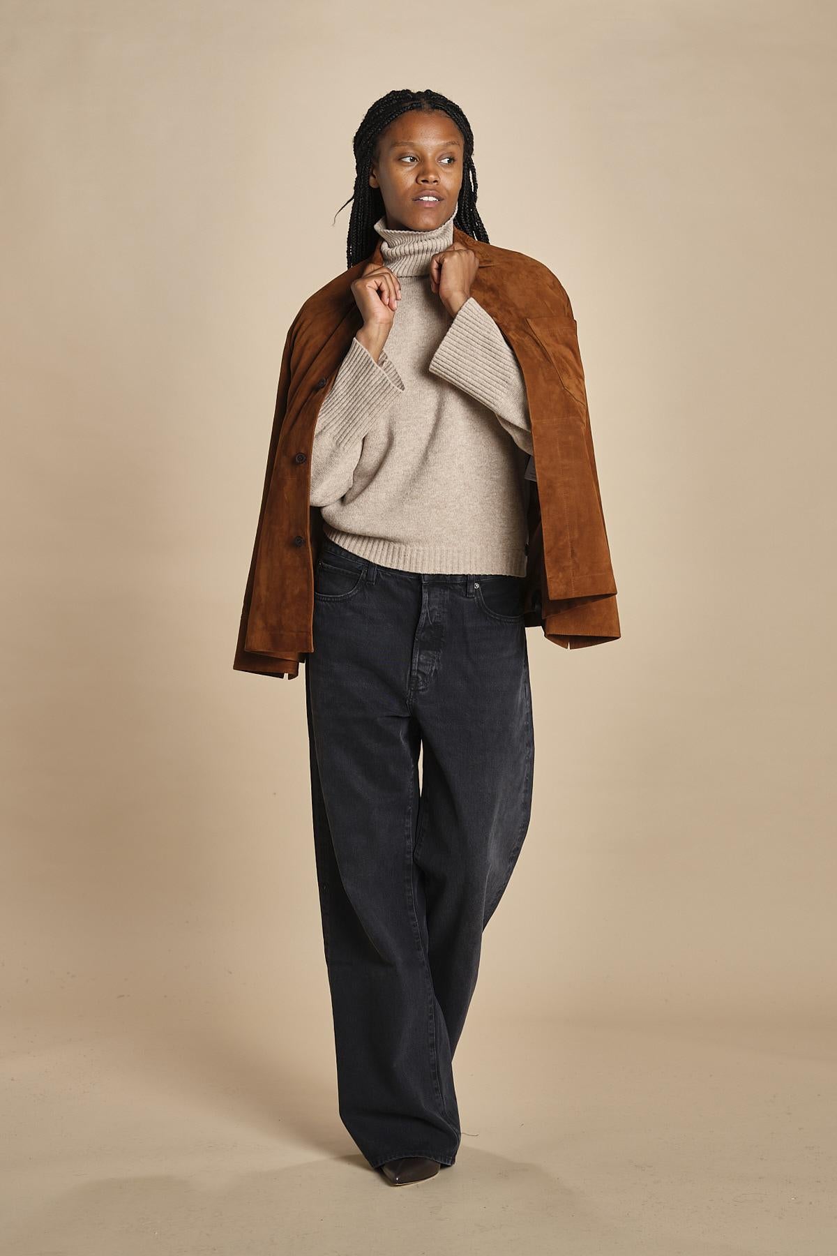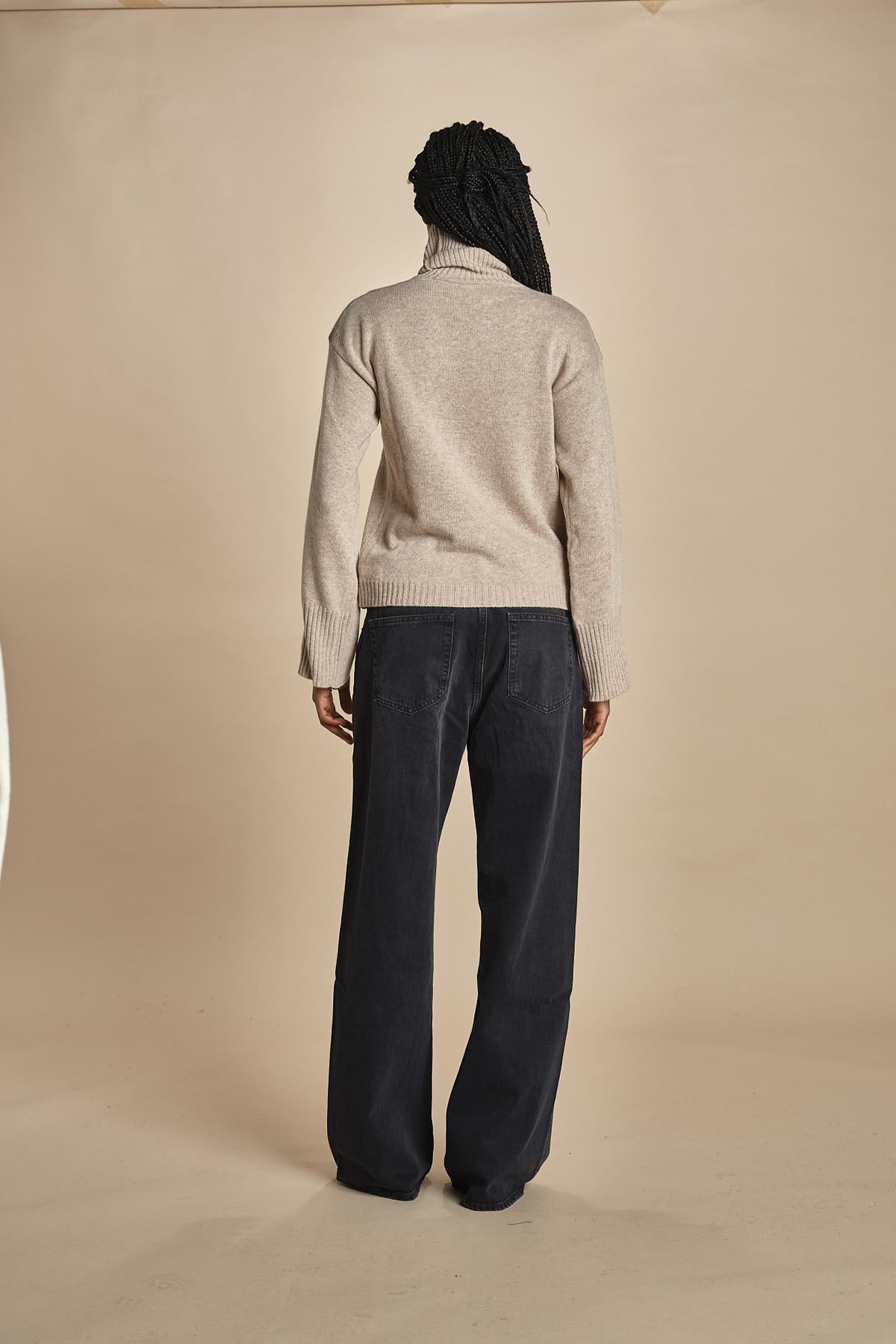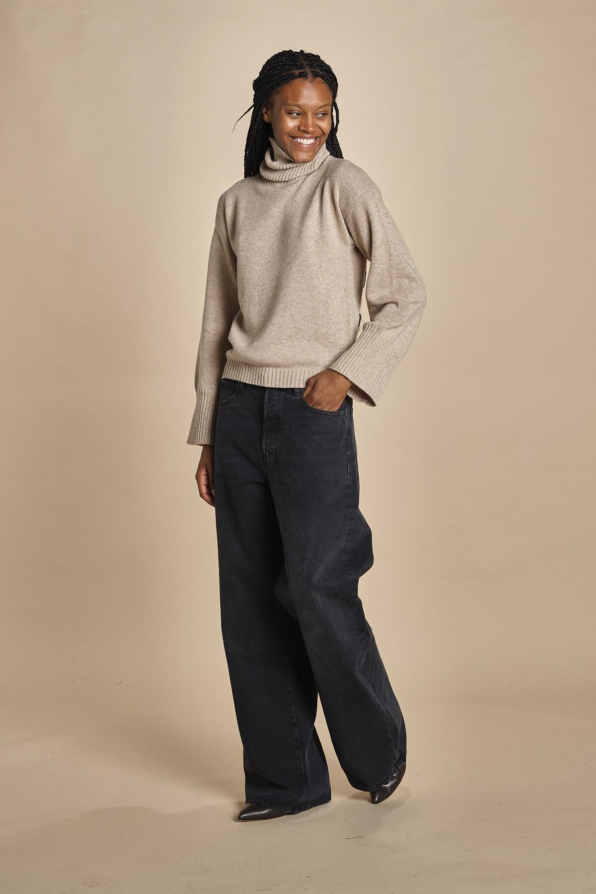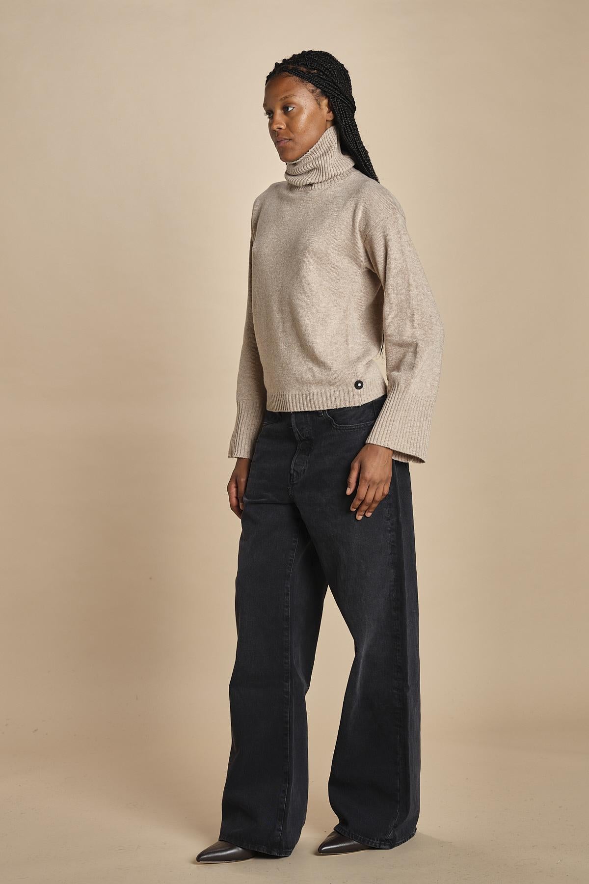 dolcevita con manica a campana by milaura. La modella è alta 174 cm e indossa una taglia S. Composizione: 40%lana, 30% viscosa, 20% polliammide, 10% cashmere.