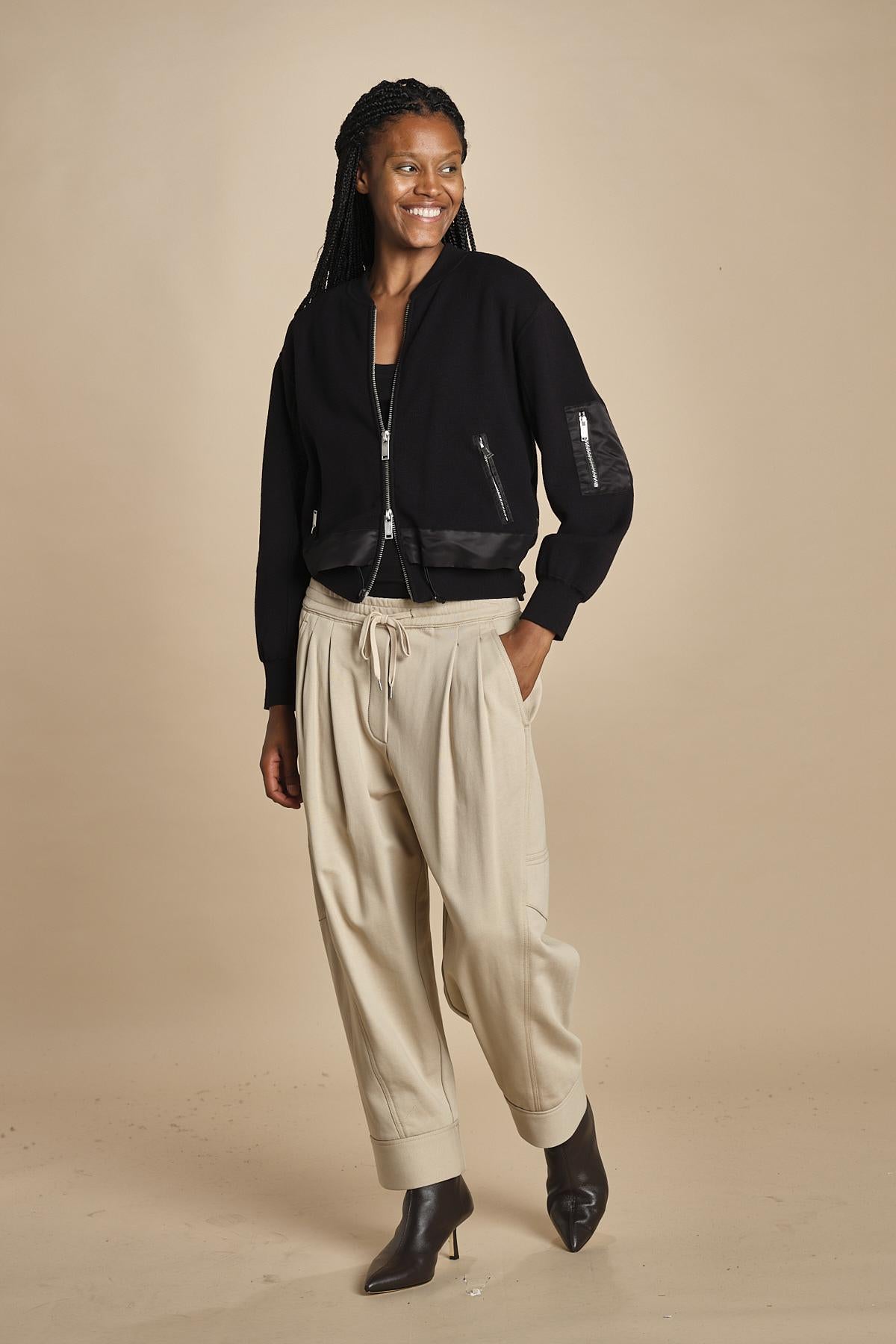 DBL LAYER BOMBER in maglia con zip by phillip lim. La modella è alta 174 cm e indossa una taglia S. Composizione: 51% cotone, 49% lino.