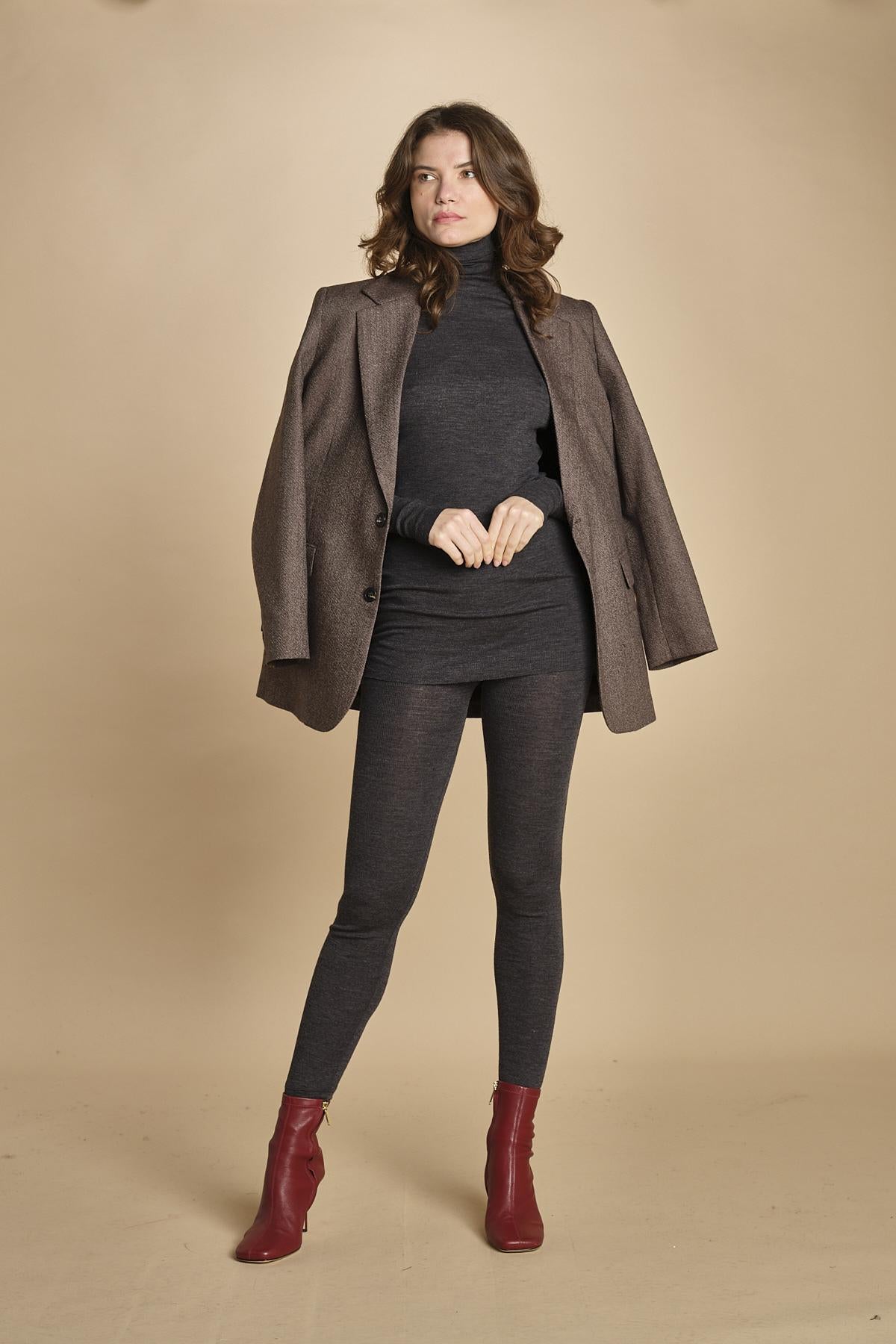 dolcevita a costine. La modella è alta 174 cm e indossa una taglia 34. 100% lana