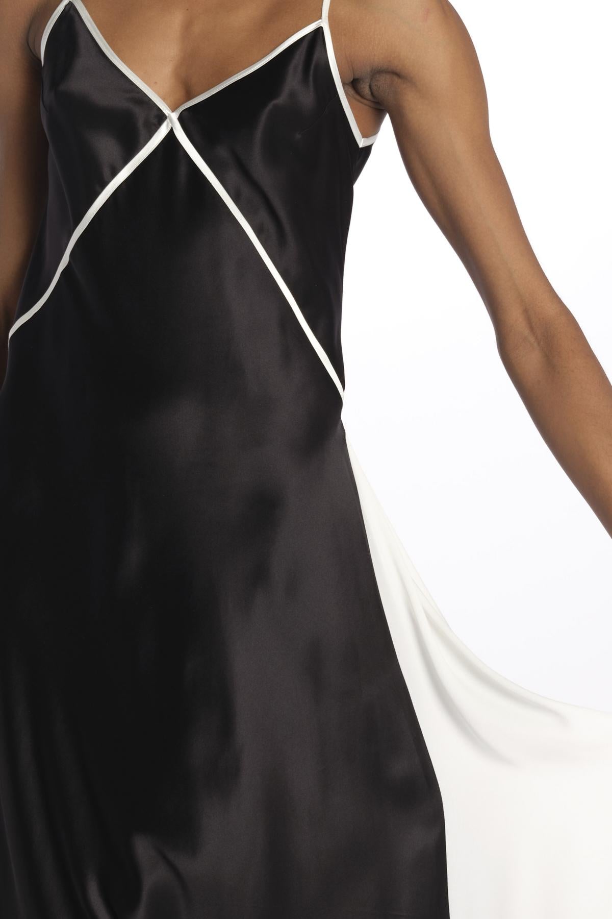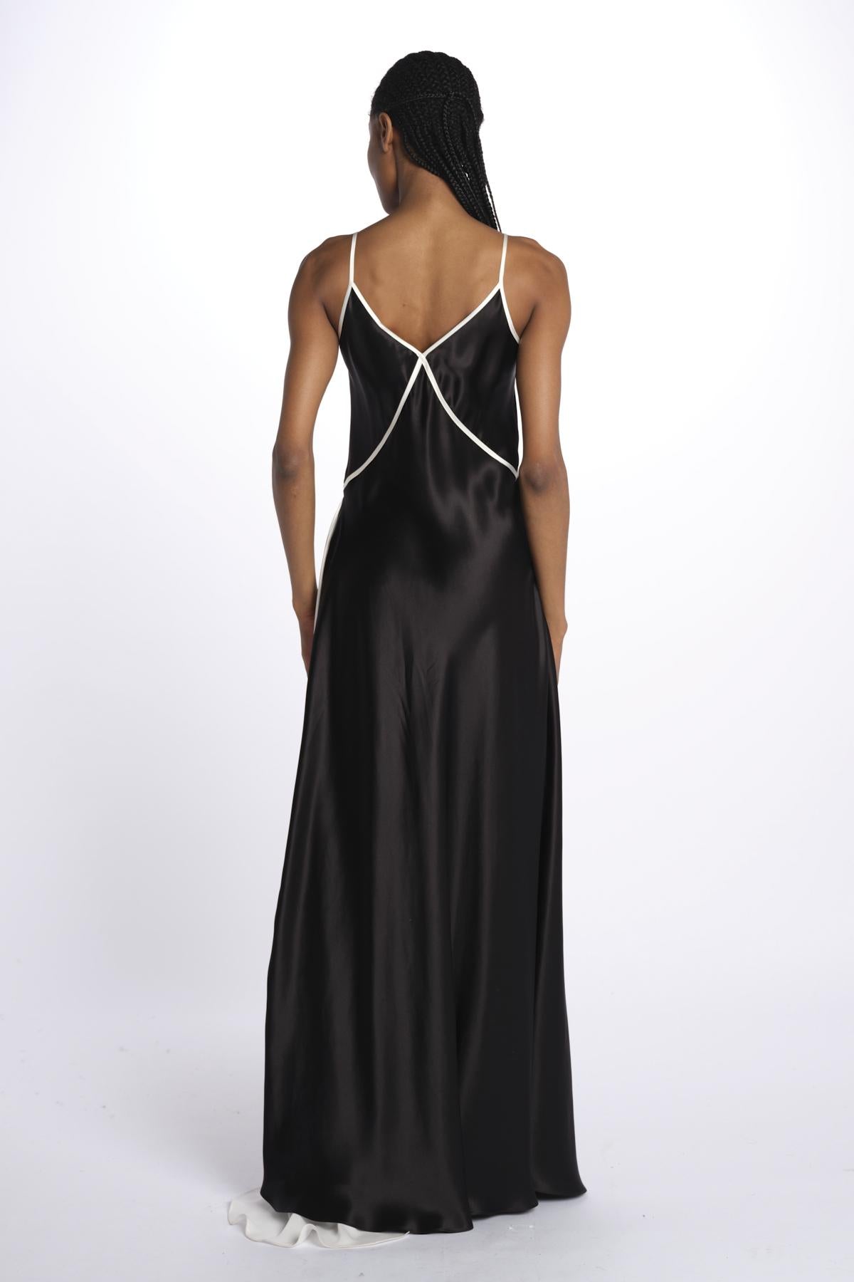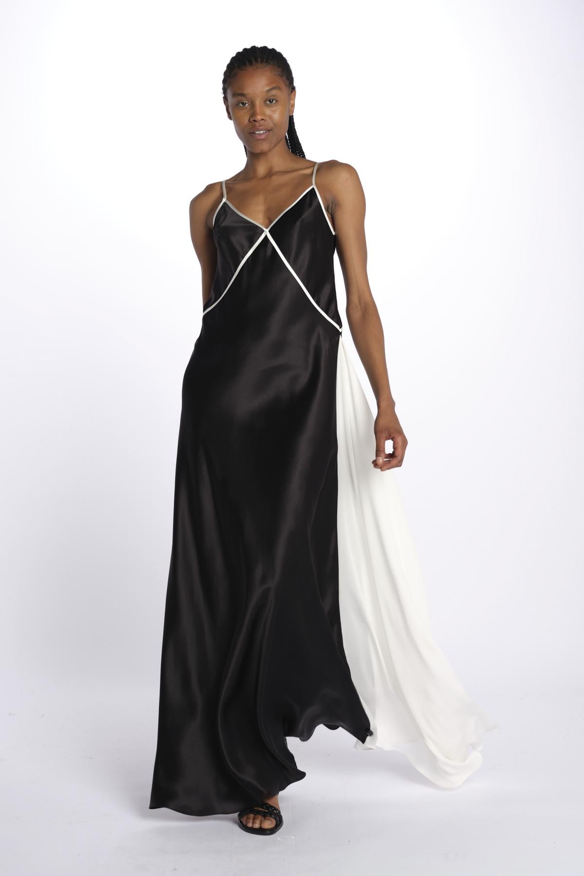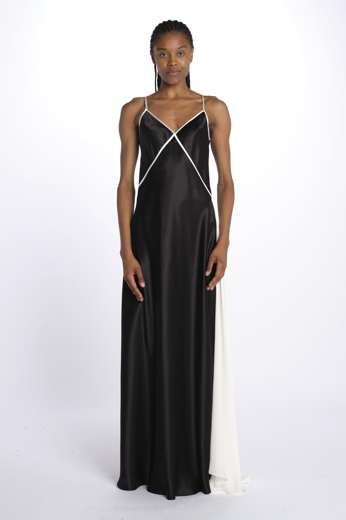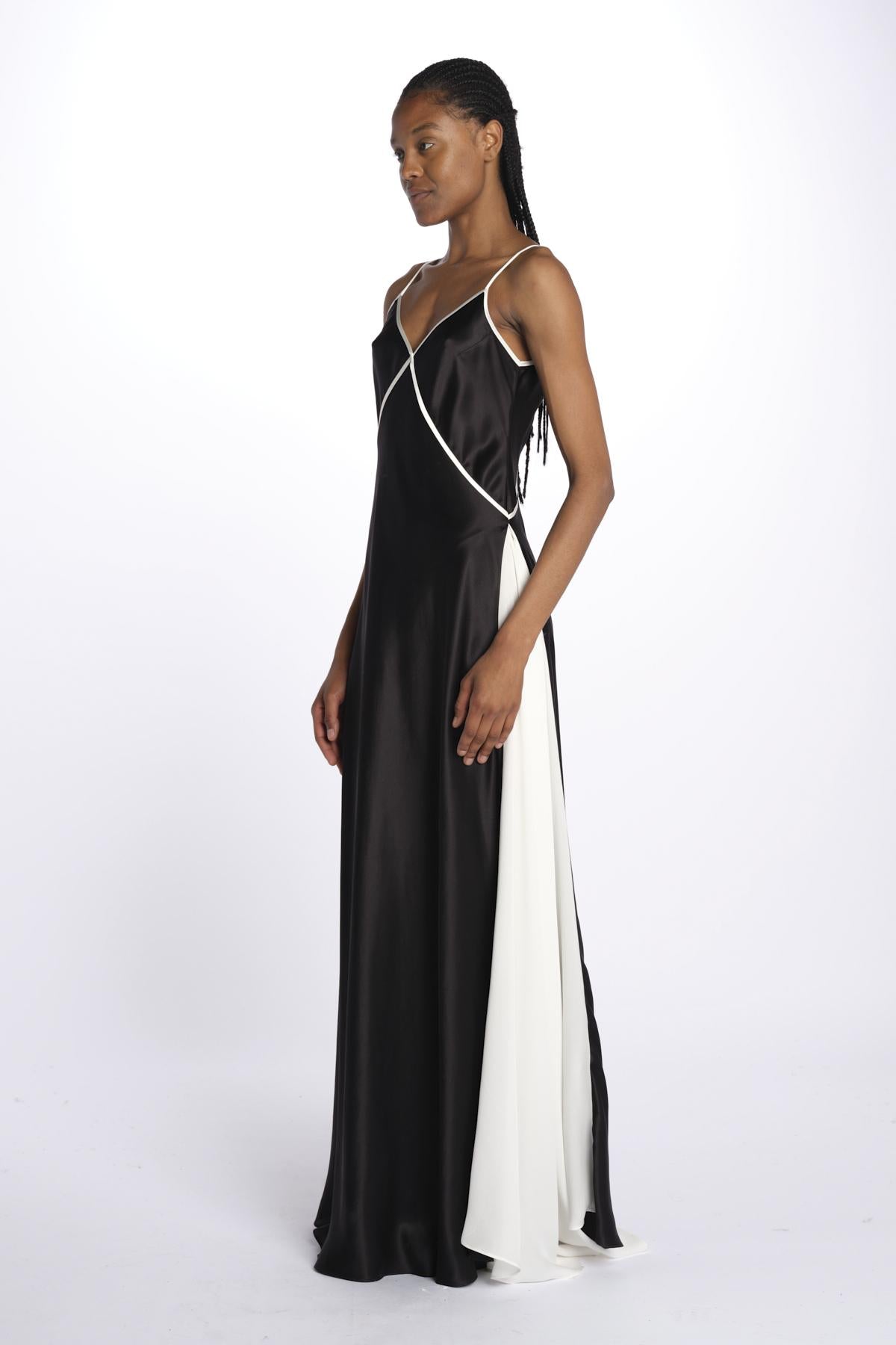 ELBA two-tone long dress by crida. The model is 174 cm tall and wears a size 0 (IT38/40). Composition: 100% silk satin.