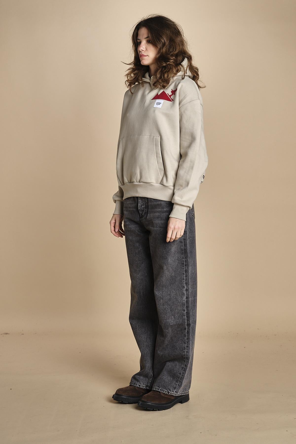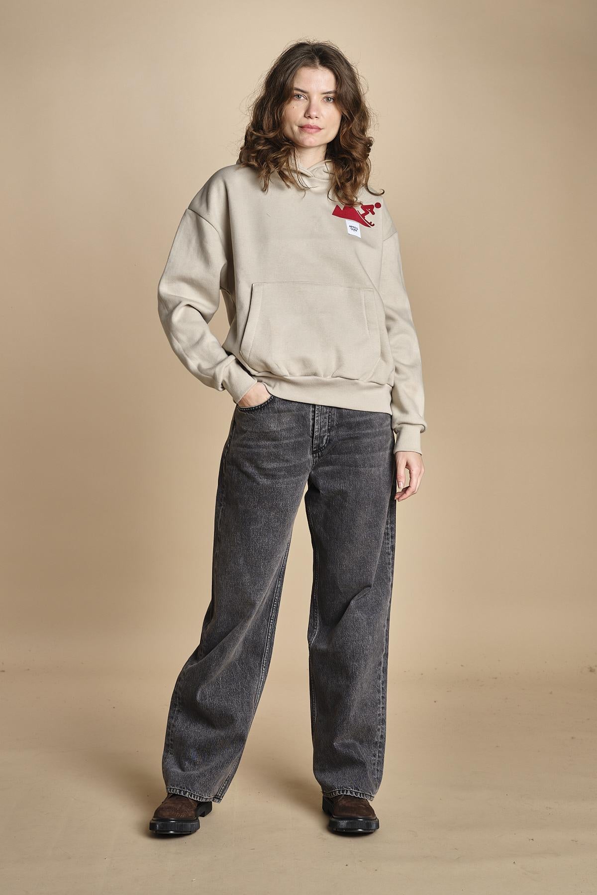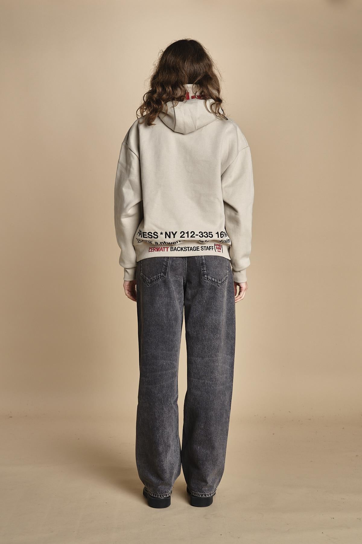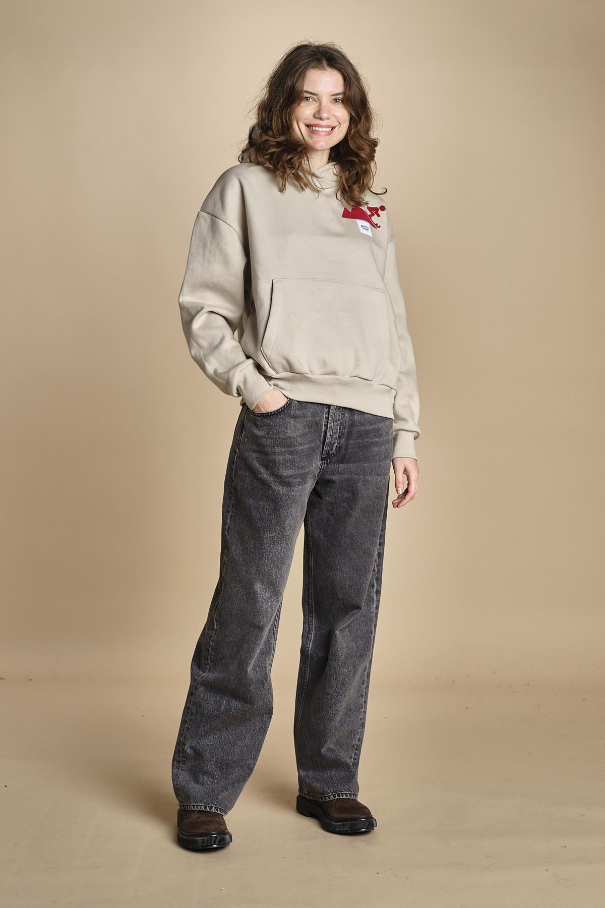 felpa con cappuccio.La modella è alta 176 cm e indossa una taglia M. 80% COTONE 20% POLIESTERE