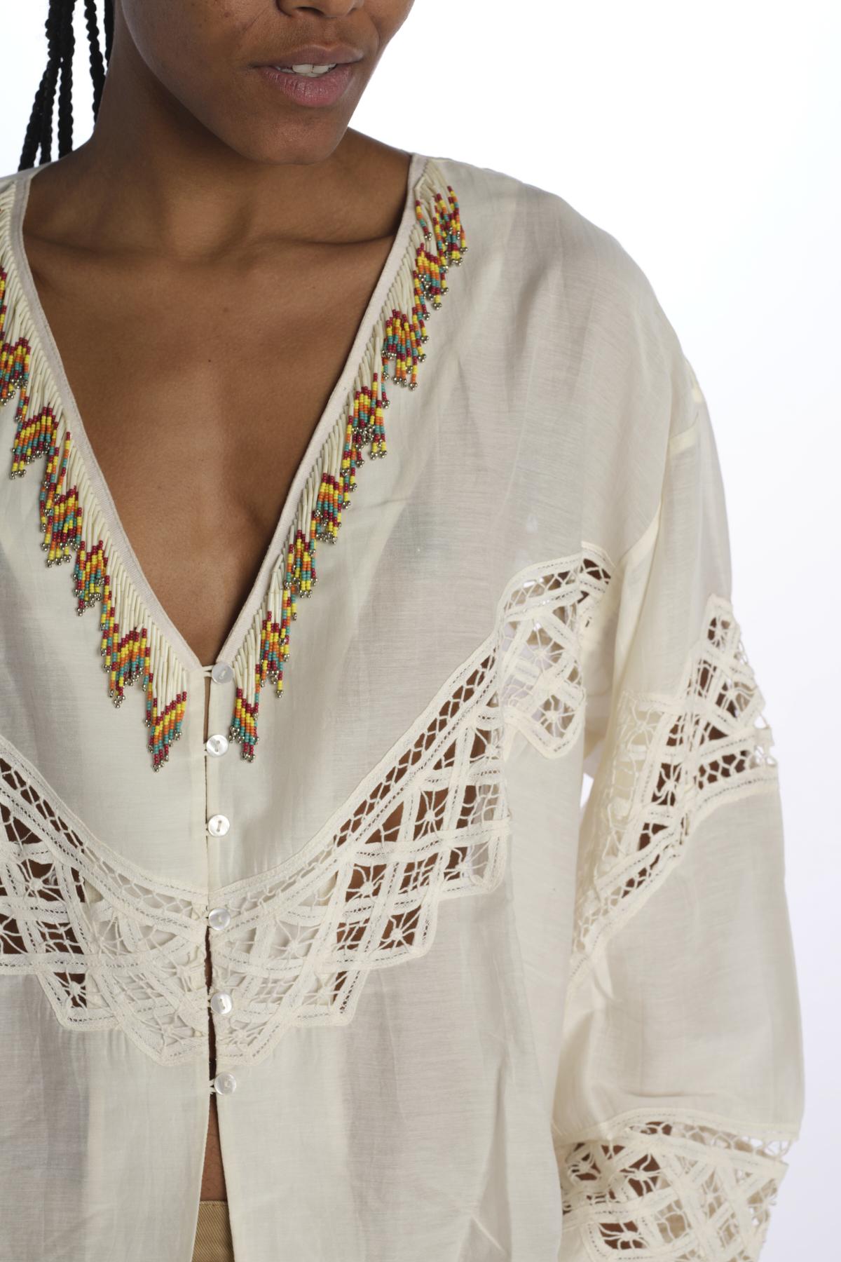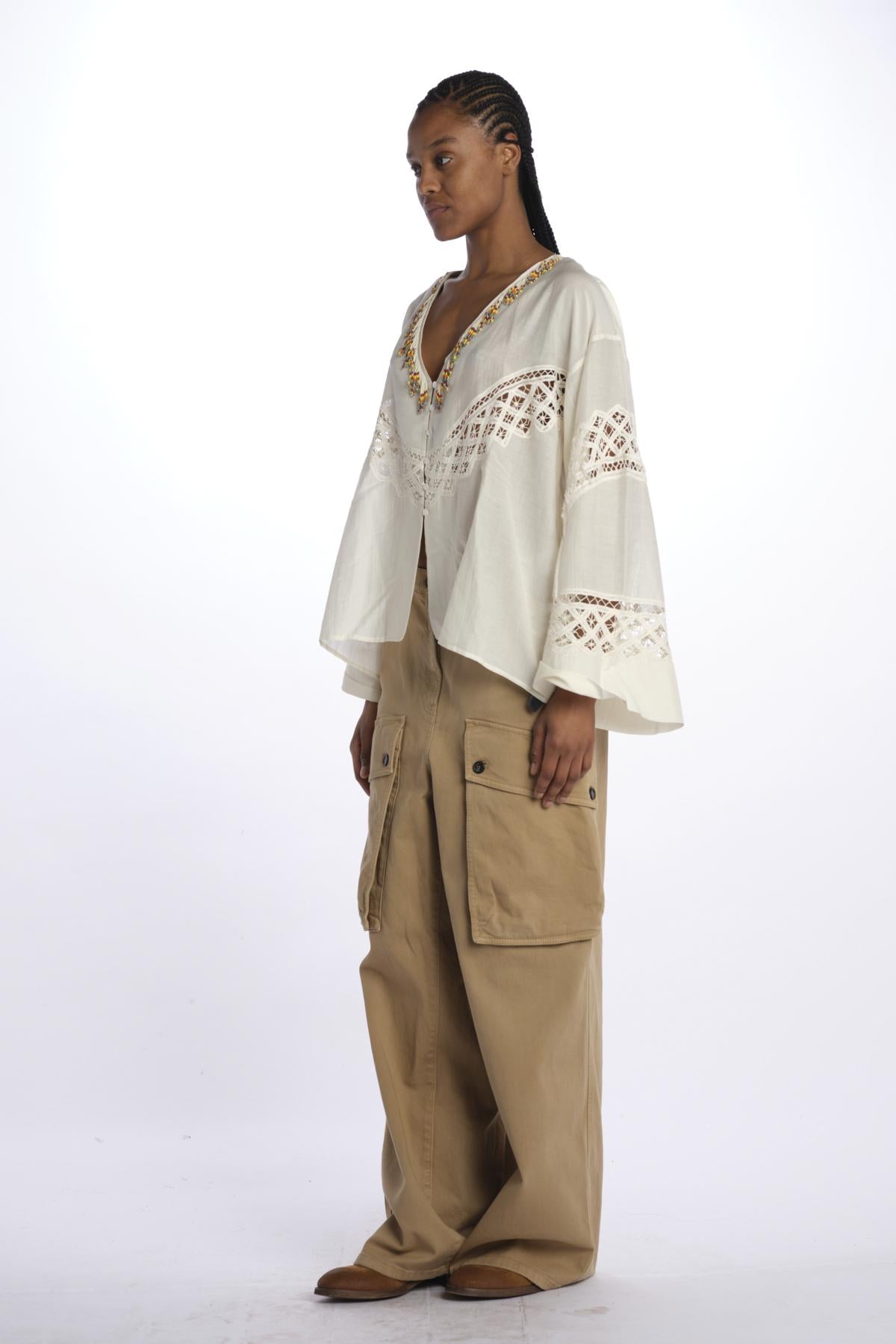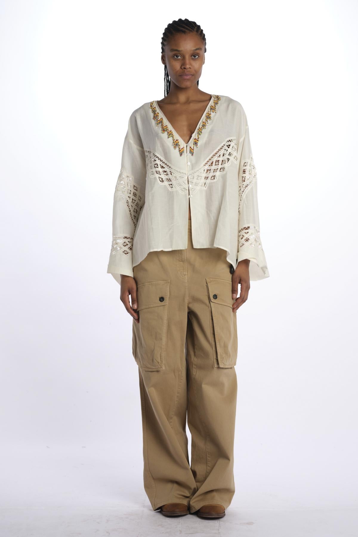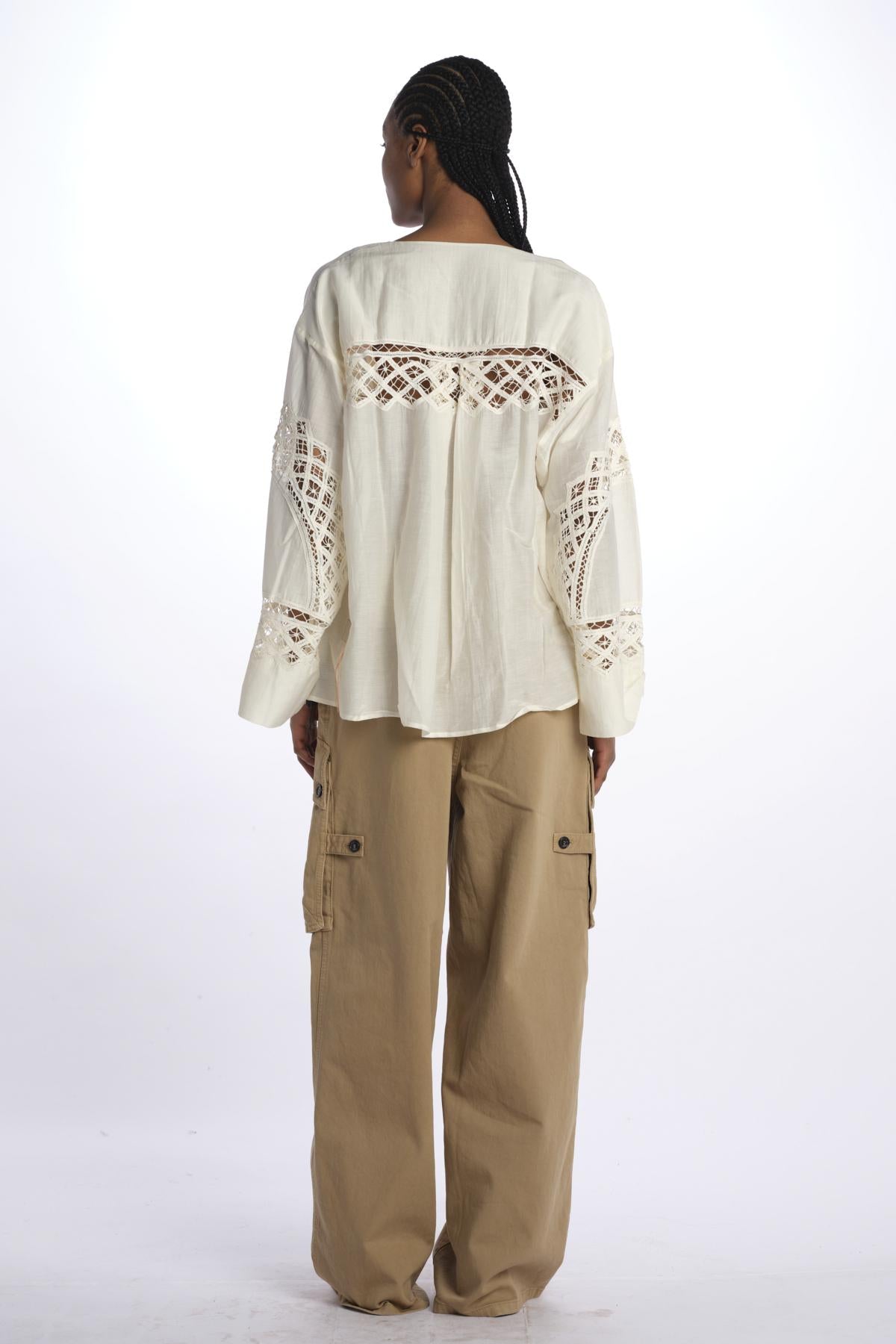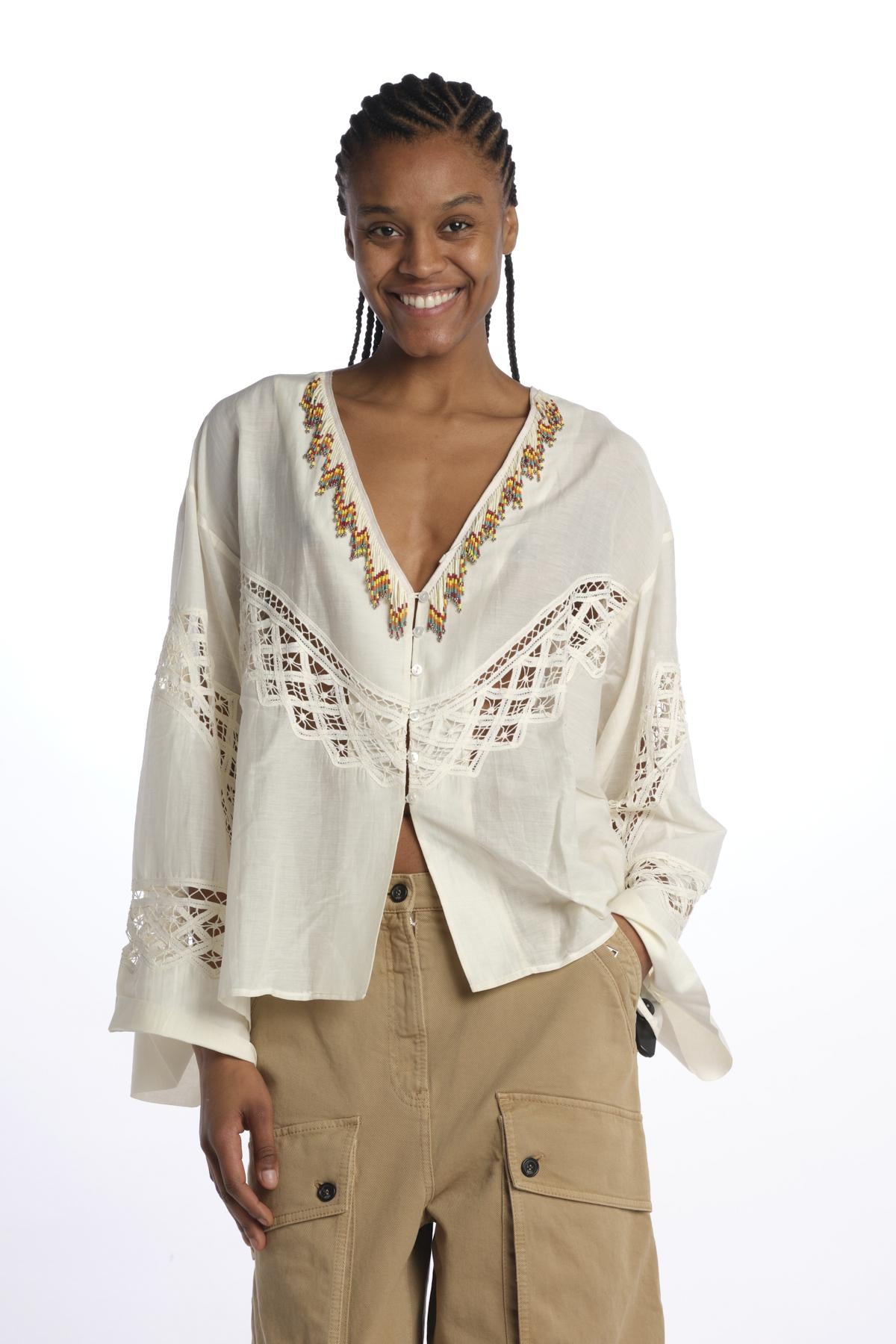CLEIDE shirt with embroidery and lace inlays by fortela. The model is 174 cm tall and wears a size 38. Composition: 70% cotton, 30% silk.
