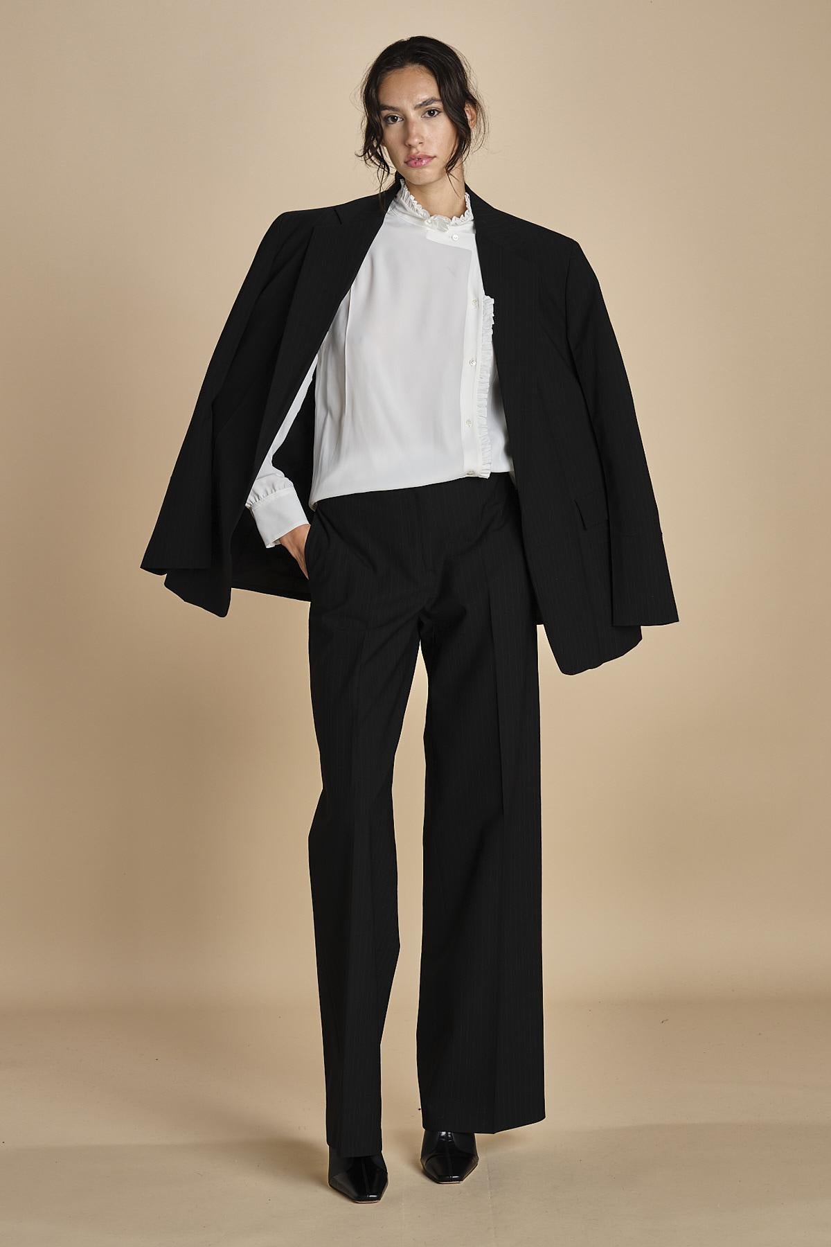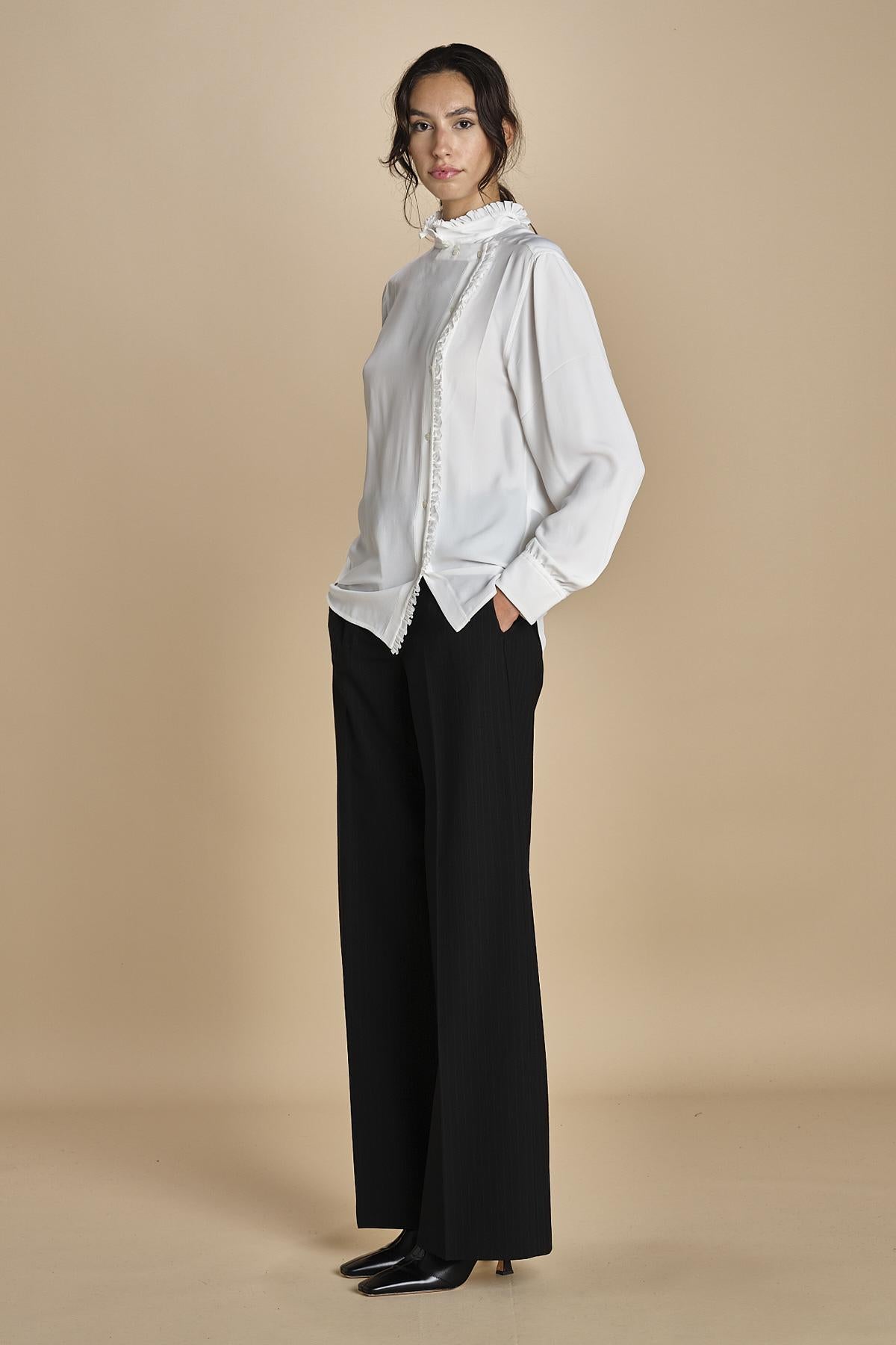 camicia in seta con rouches. La modella è alta 180 cm e indossa una taglia 38. 31% SETA 69% ACETATO