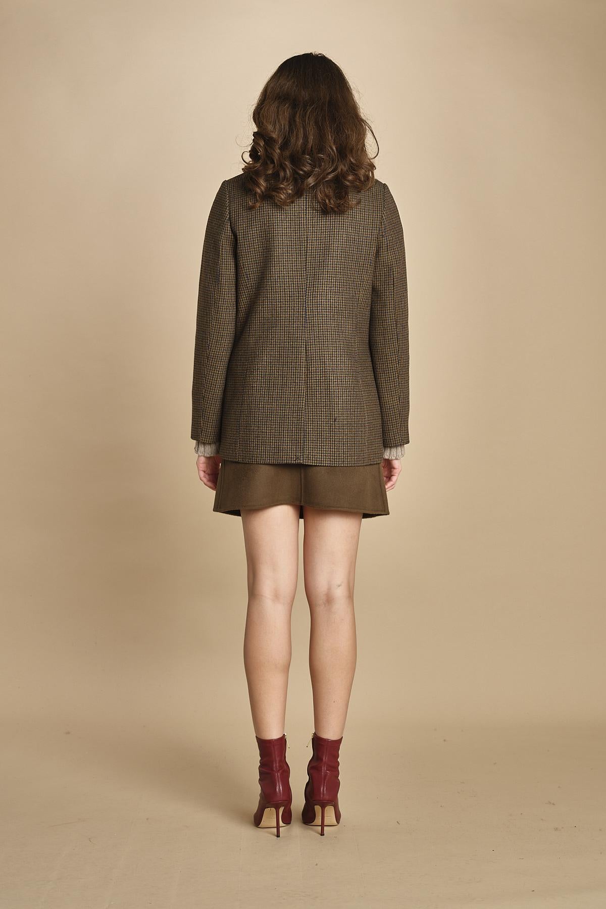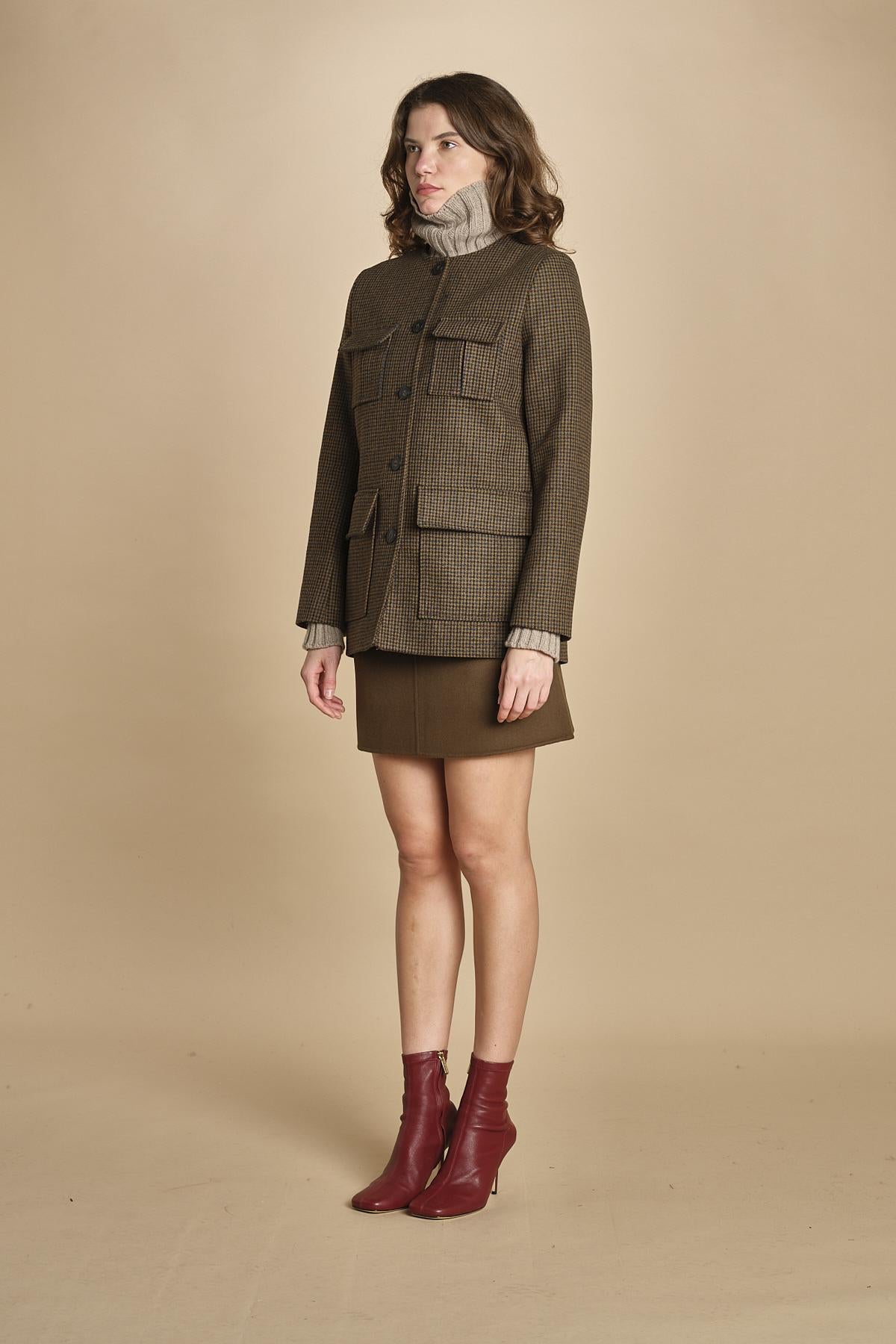 giacca a quadretti girocollo con quattro tasche. La modella è alta 174 cm e indossa una taglia 34. 25% lana 75% poliammide