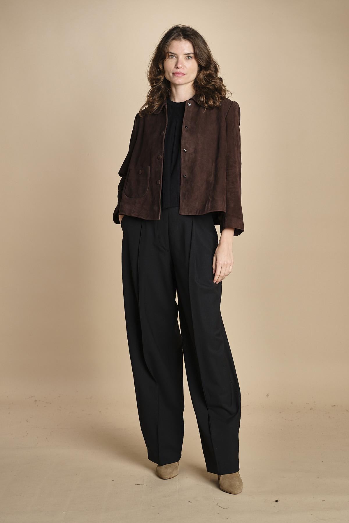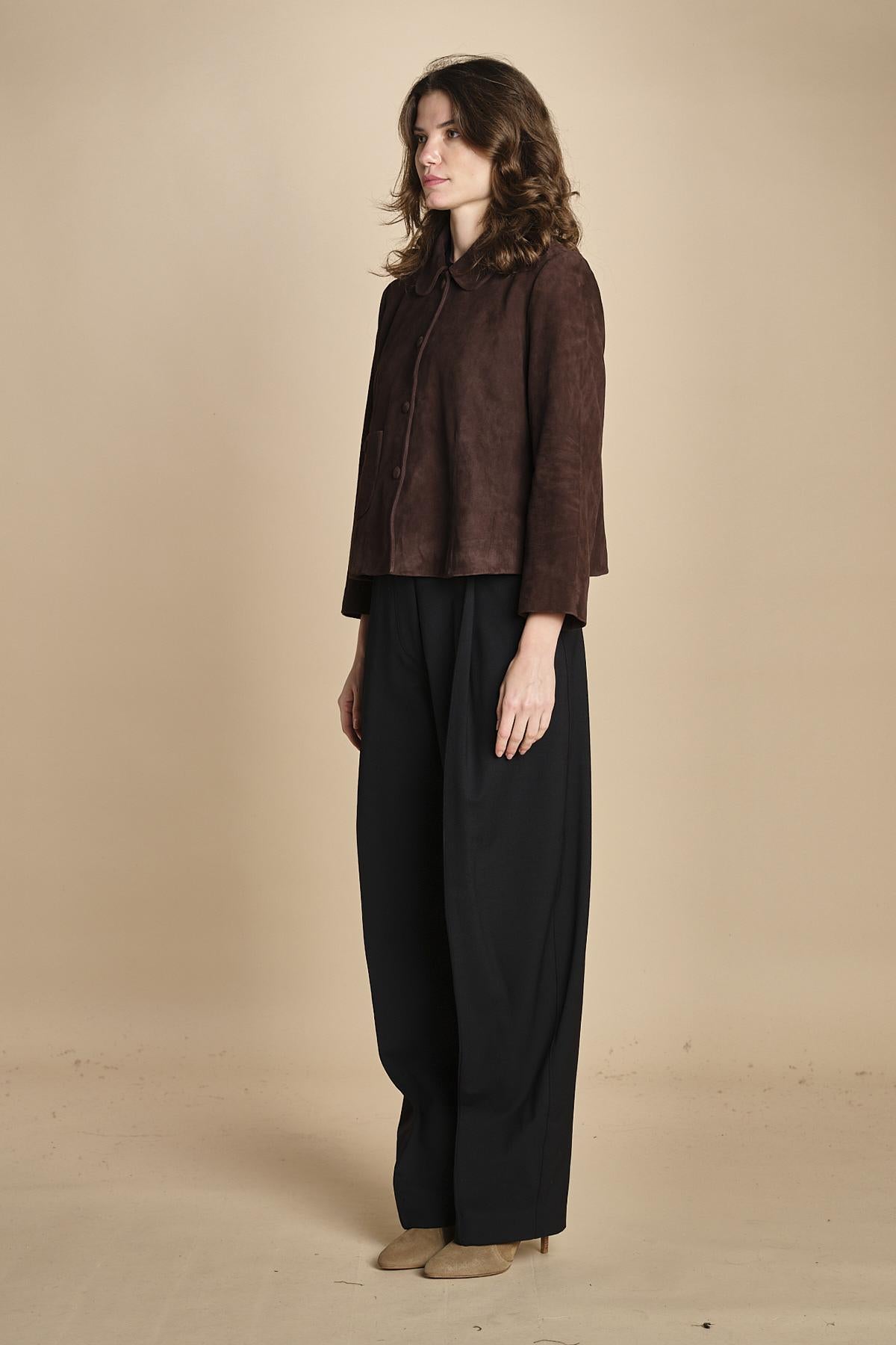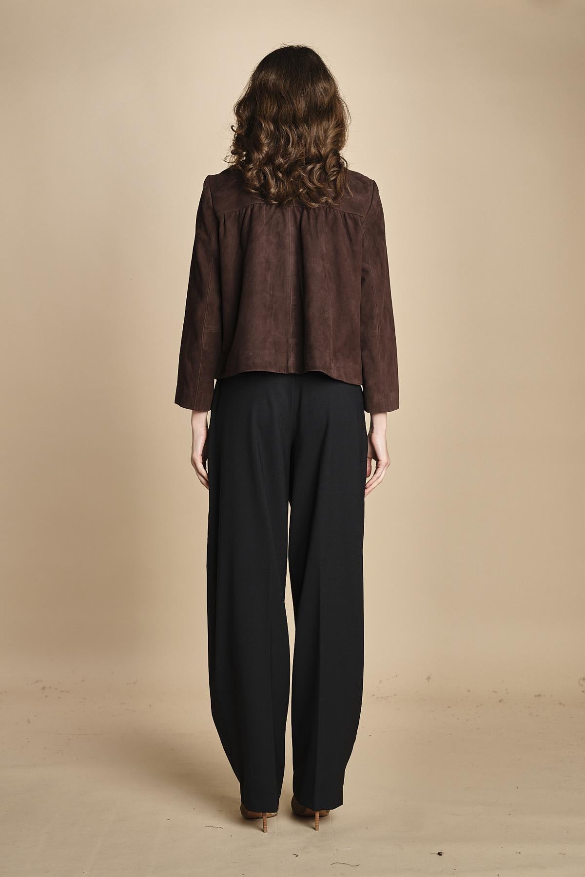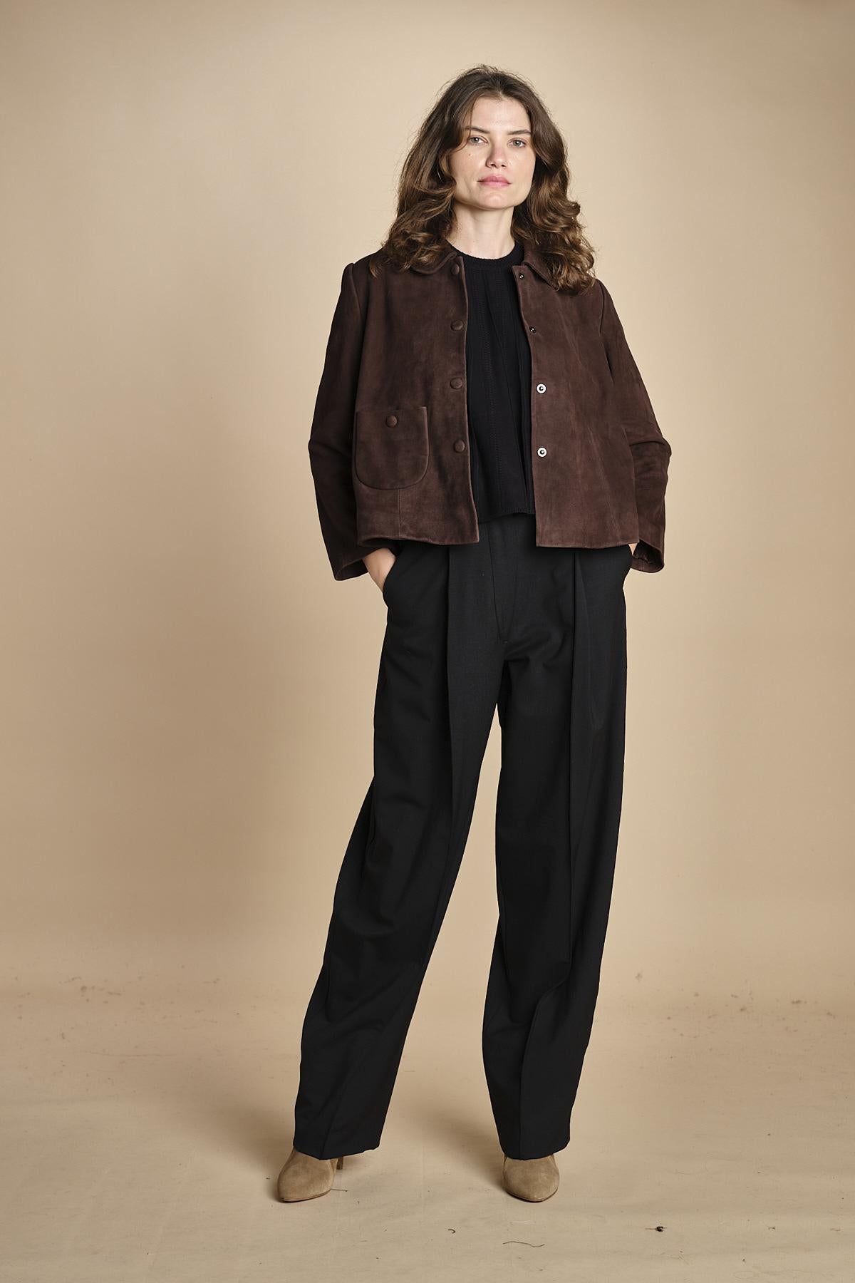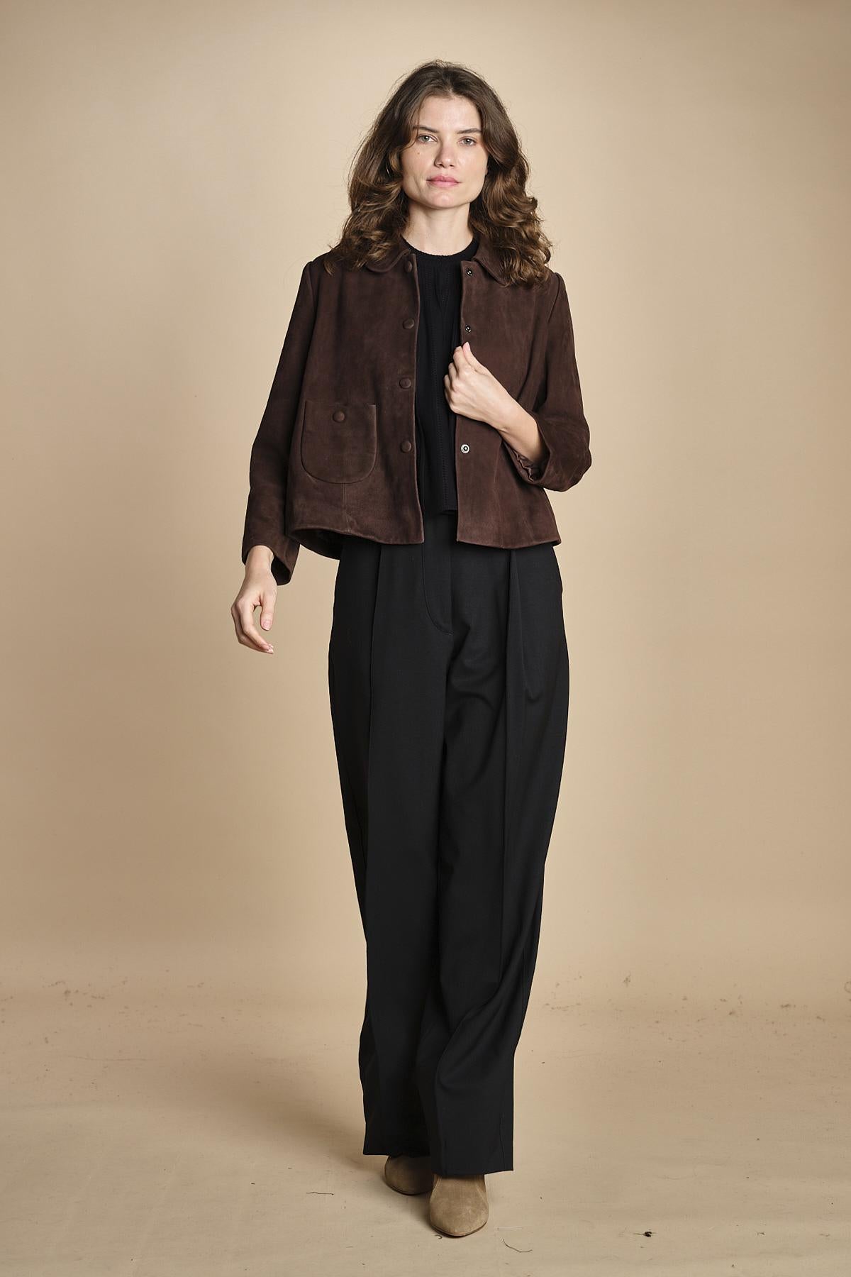 giacchina in camoscio con collo rotondo. La modella è alta 176 cm e indossa una taglia 2. 100% pelle
