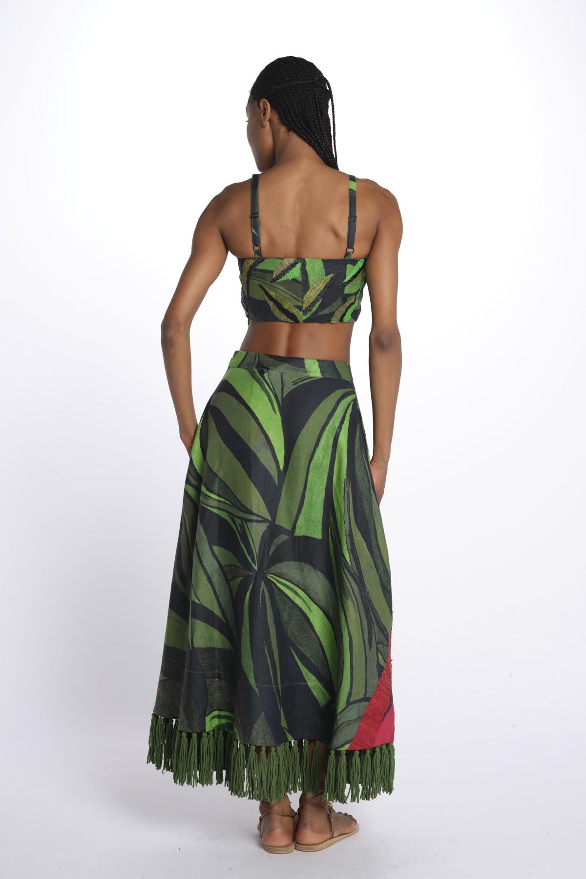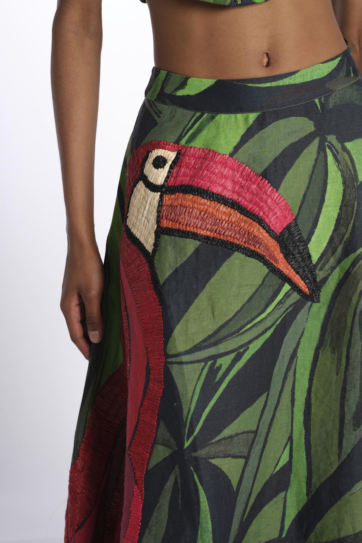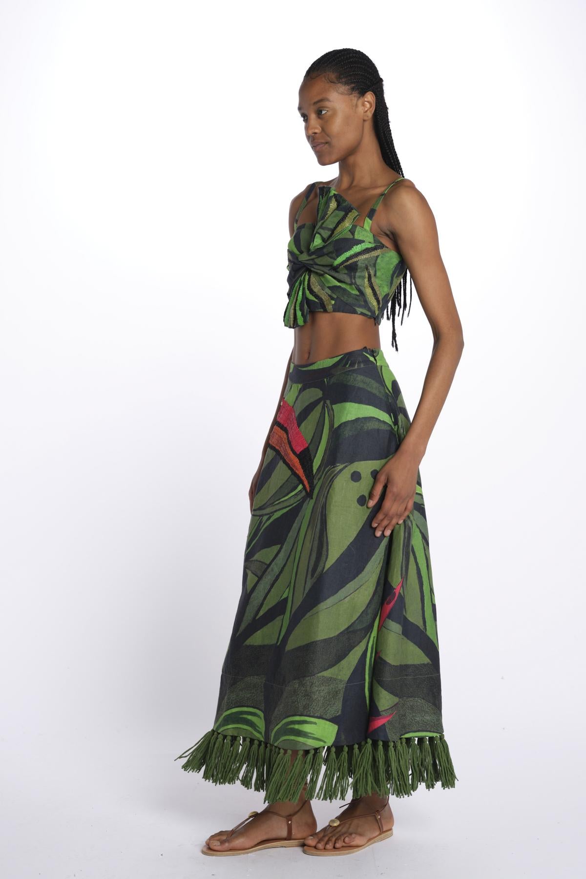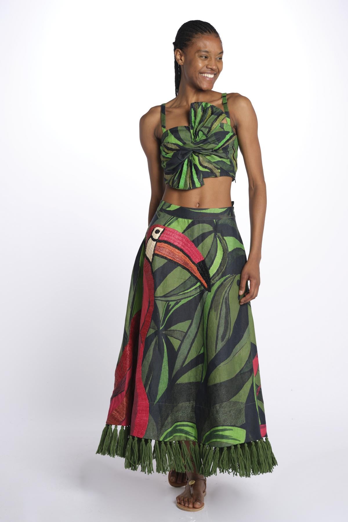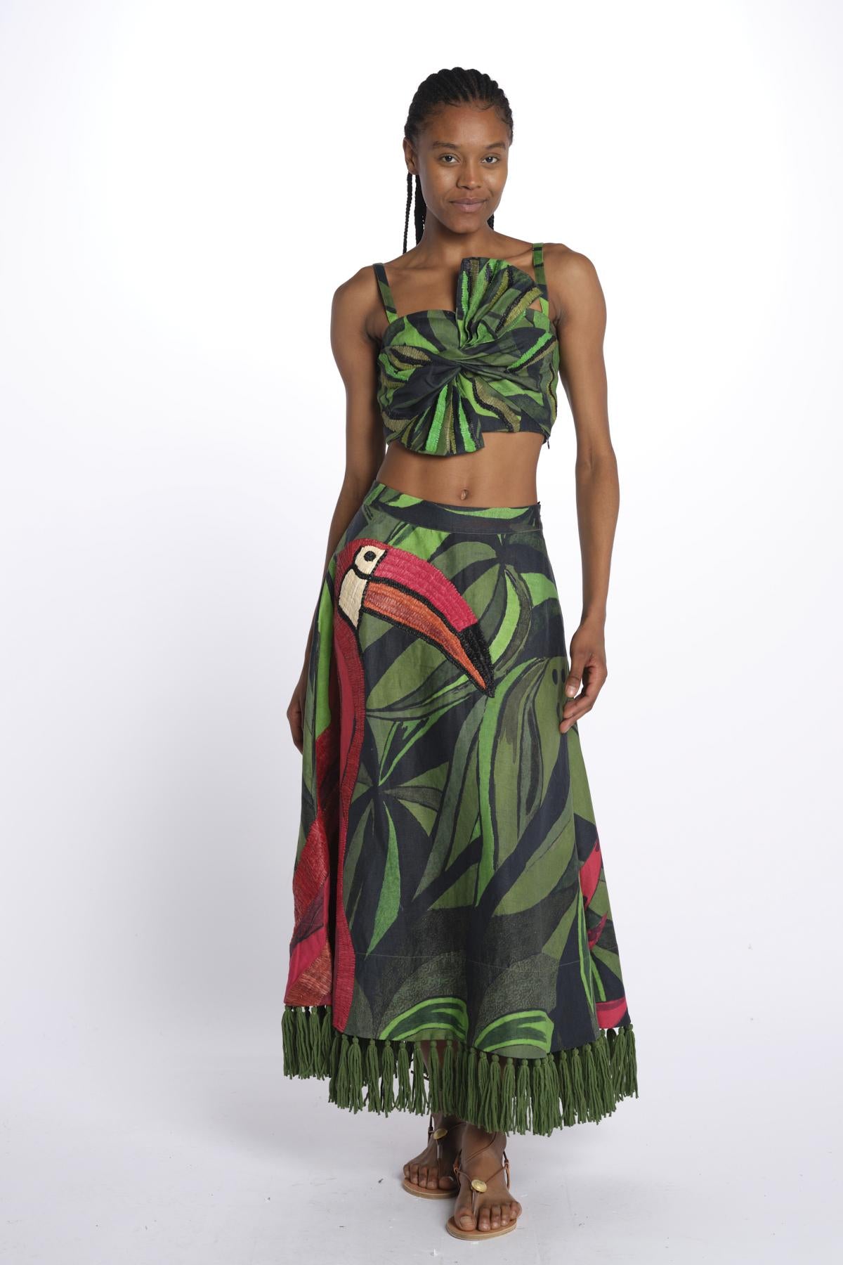 COCONUT TREE FLOW parrot skirt by farm rio. The model is 174 cm tall and wears a size S. Composition: 55% linen, 45% viscose.