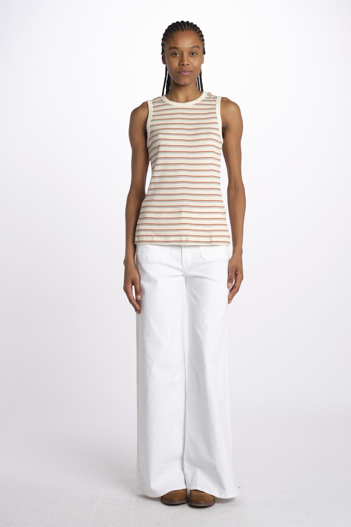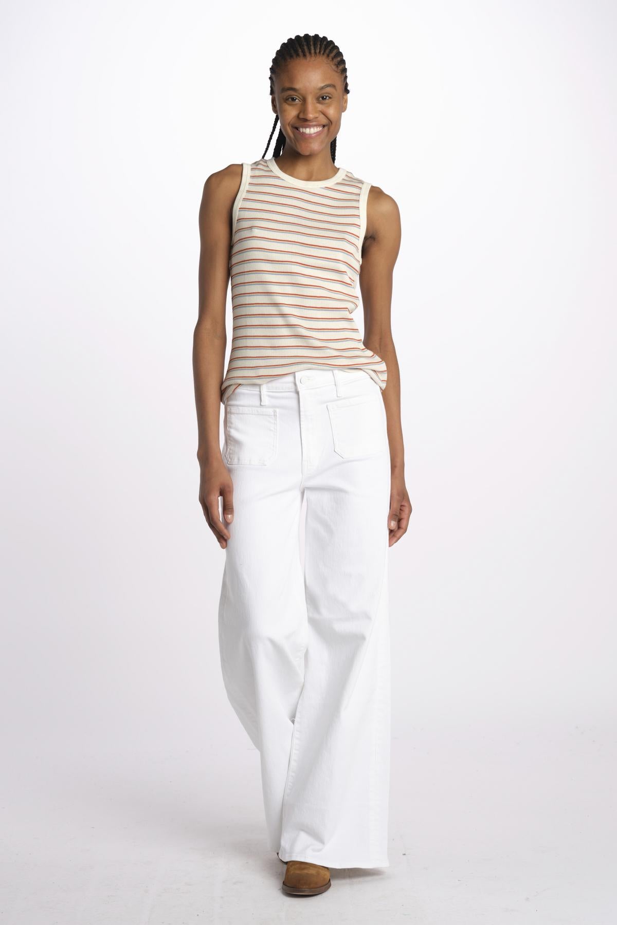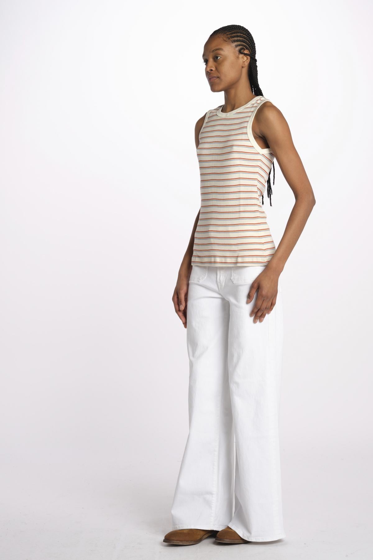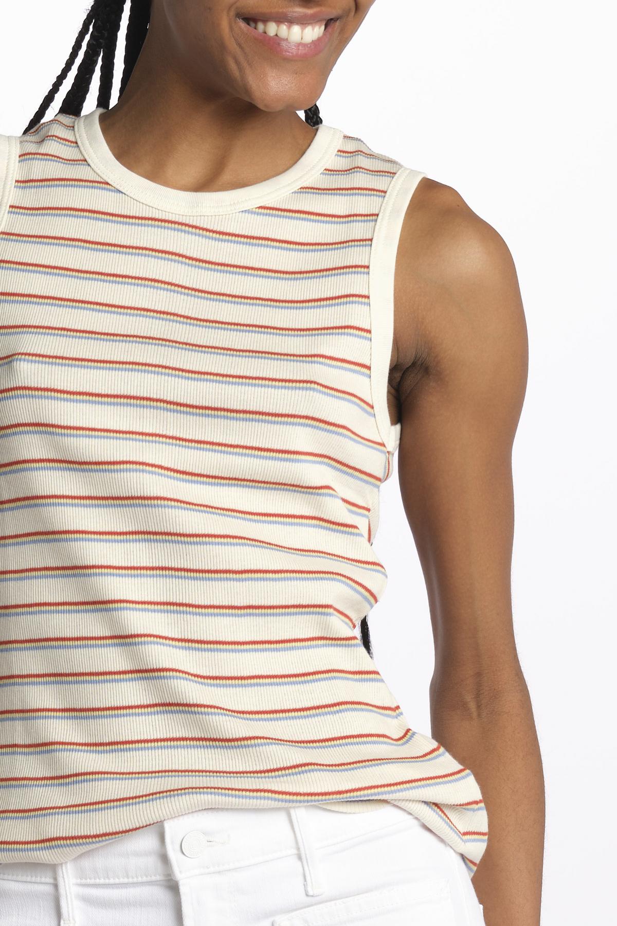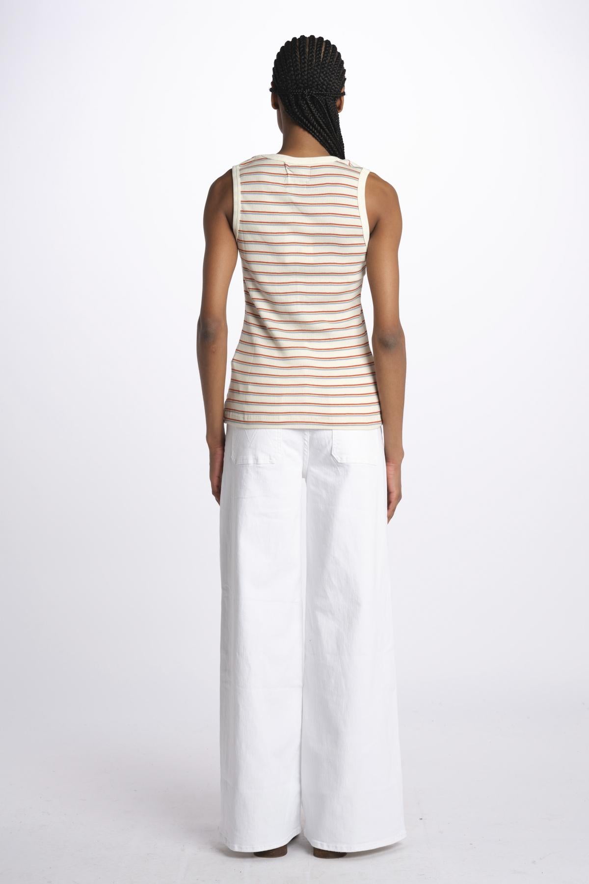 Ribbed striped tank top by howlin'. The model is 174 cm tall and wears an XS. Composition: 100% cotton.