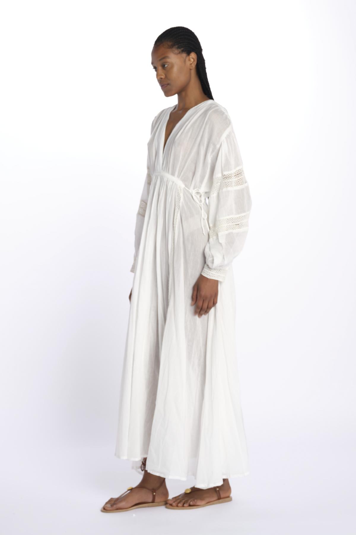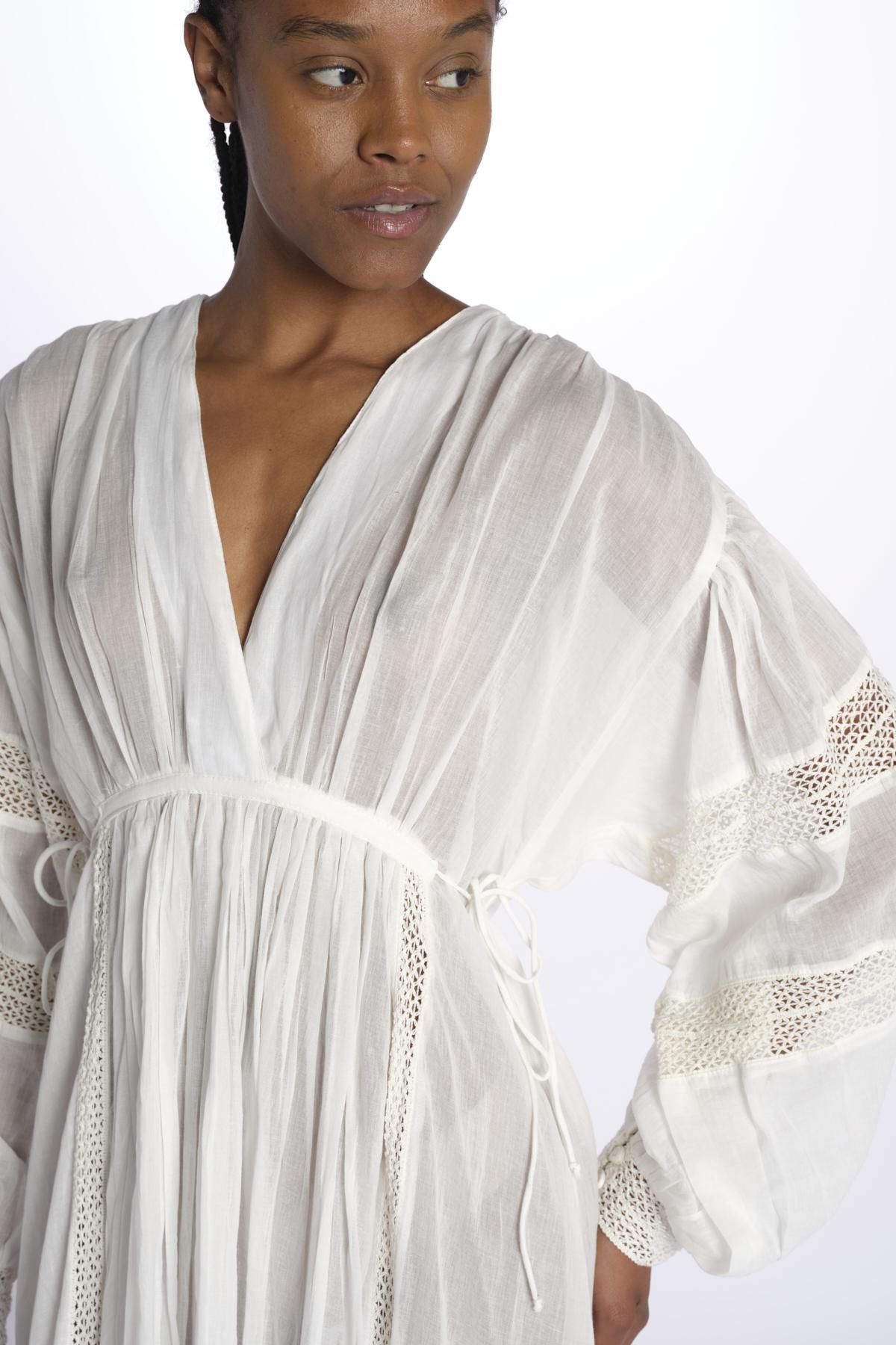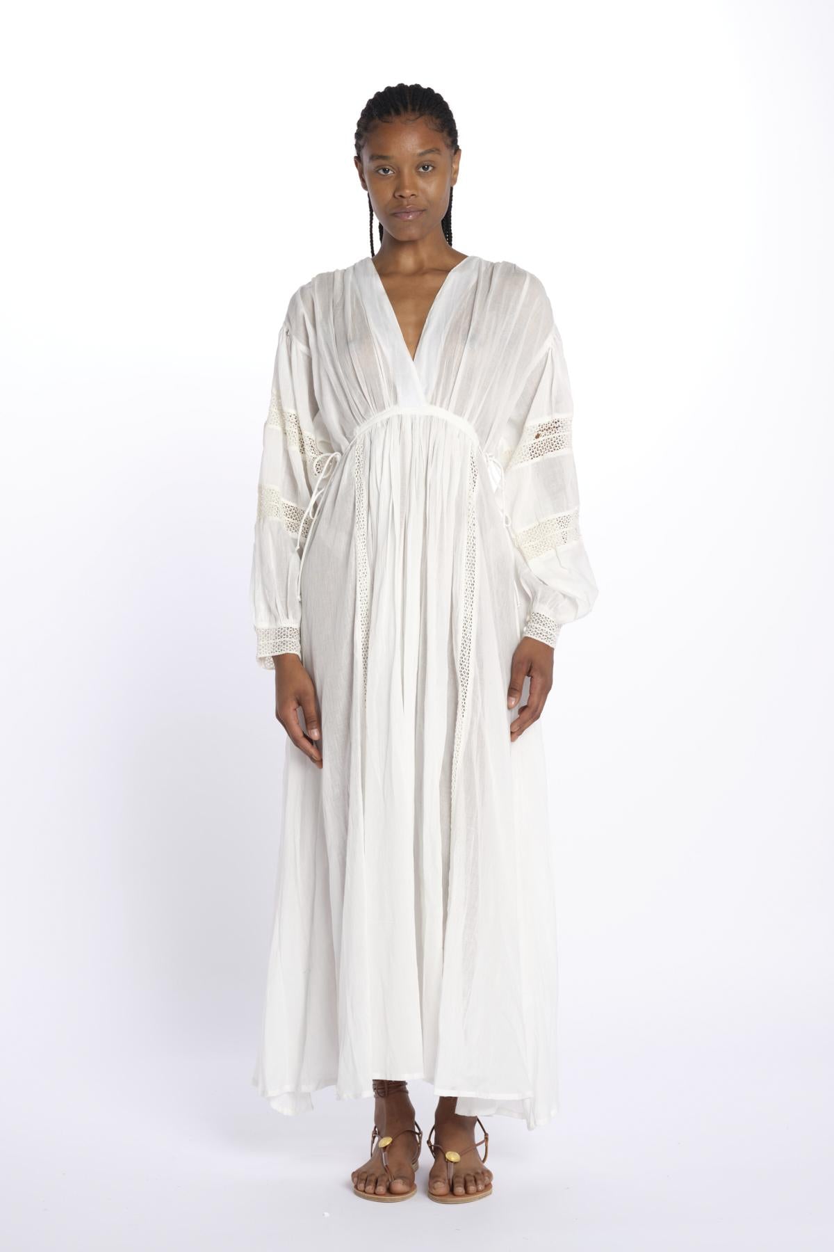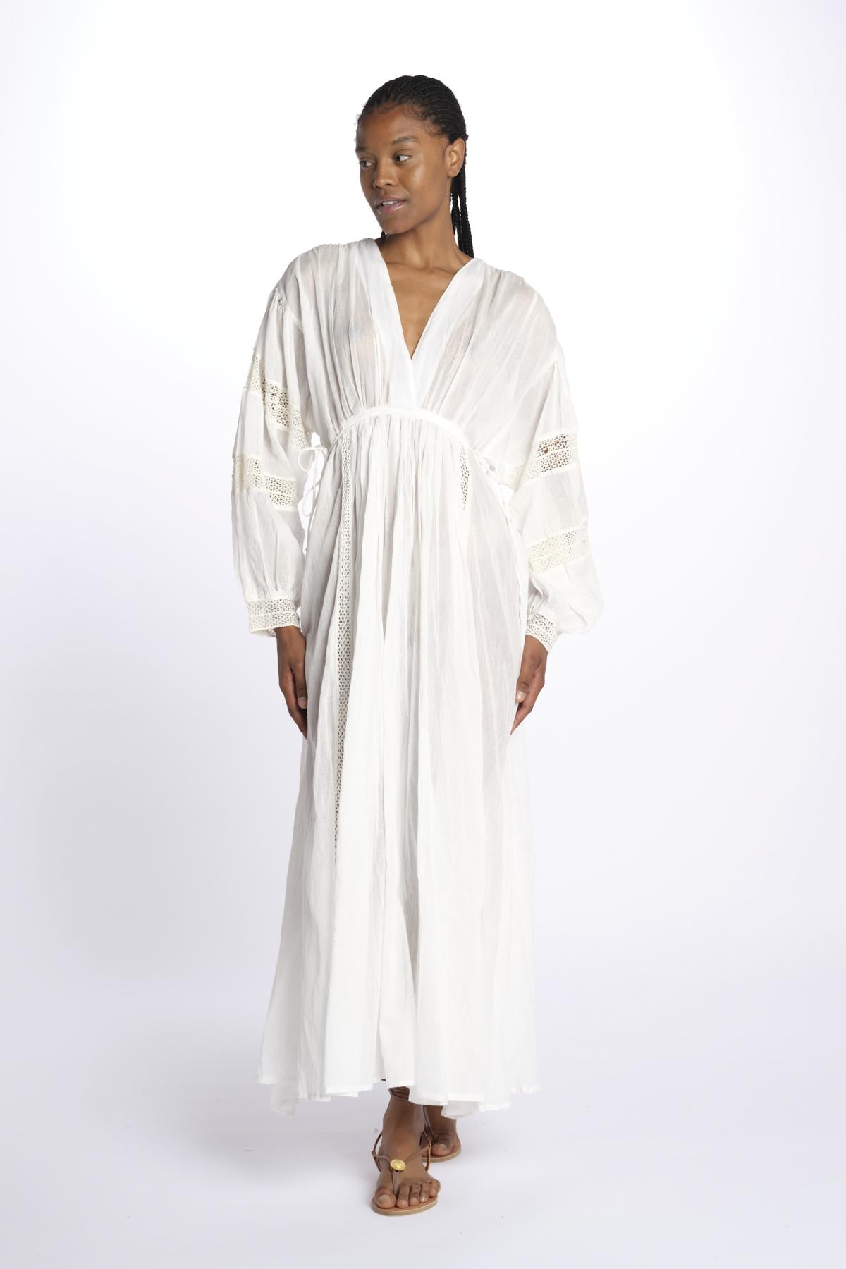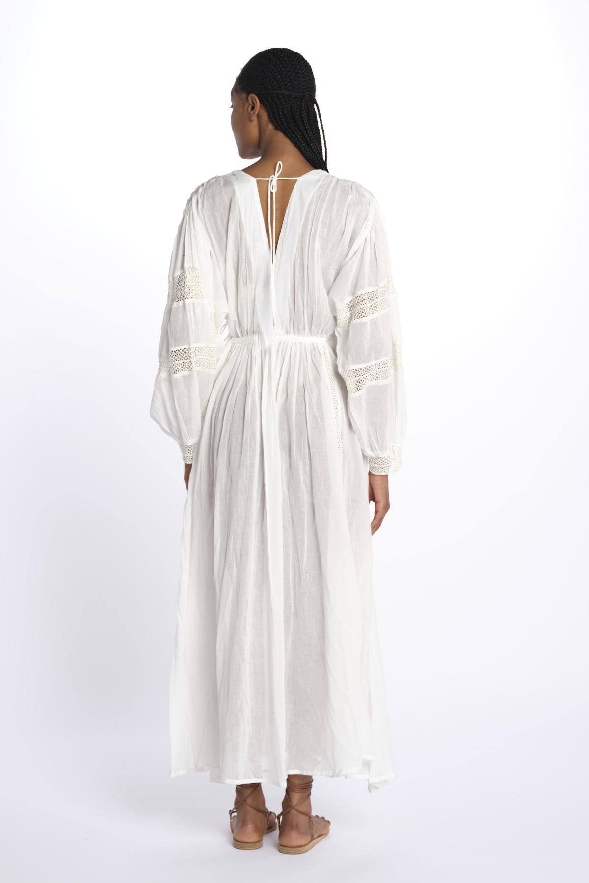IBIZA maxi dress with neckline and long sleeves by laraethnics. The model is 174 cm tall and wears a ONE size. Composition: 82% viscose, 18% nylon.