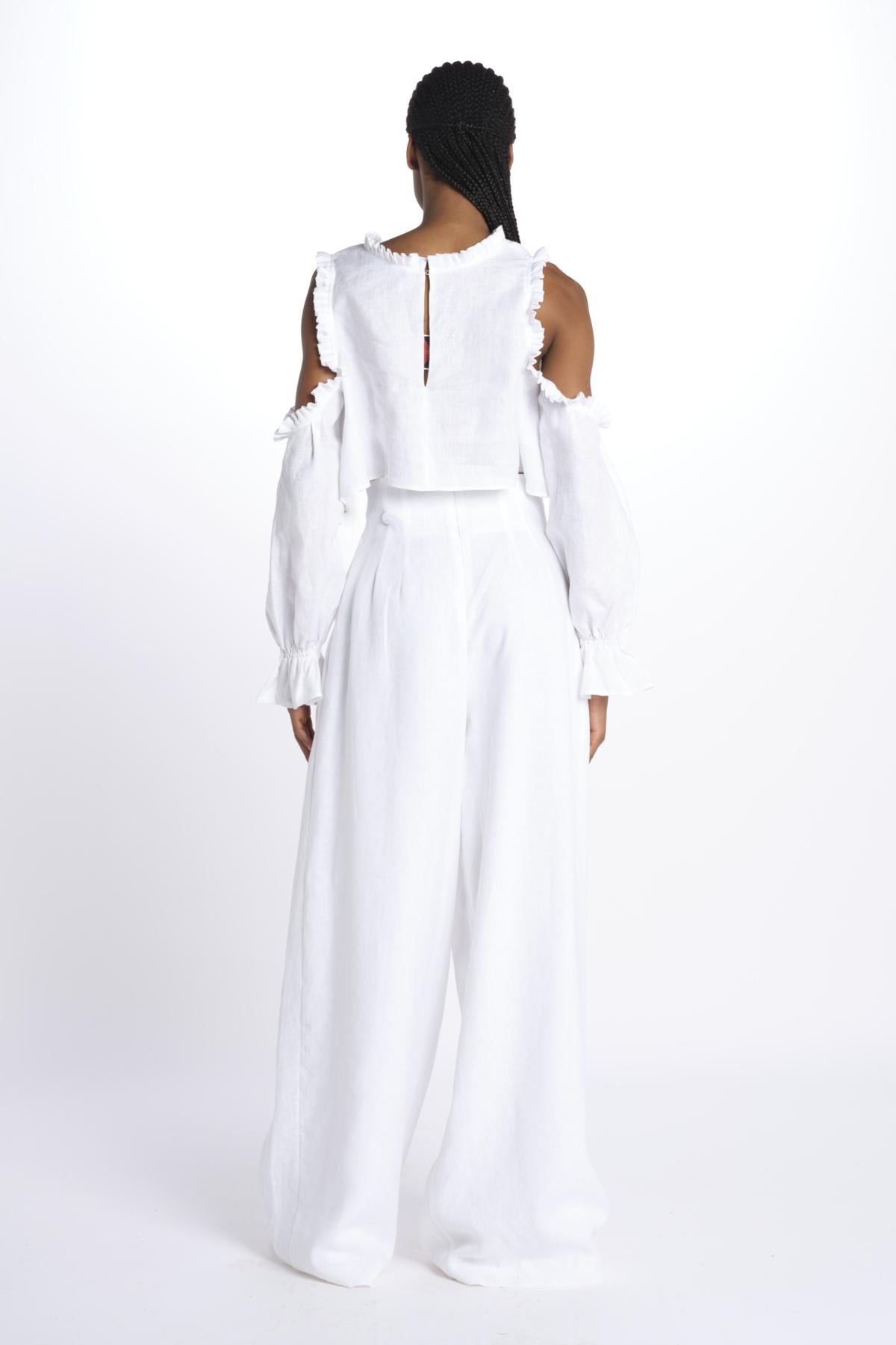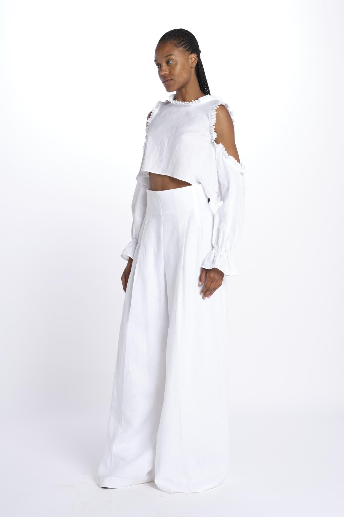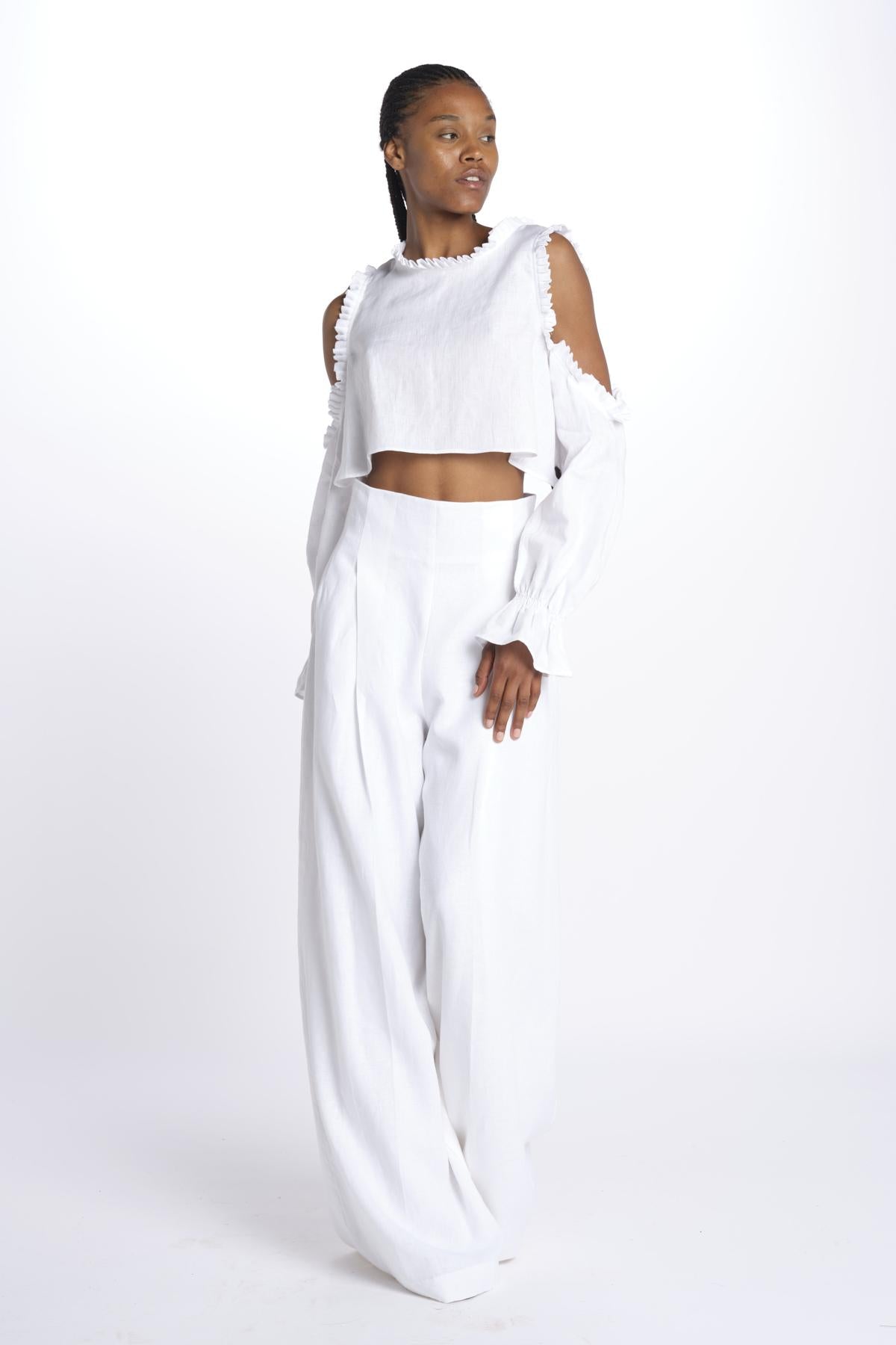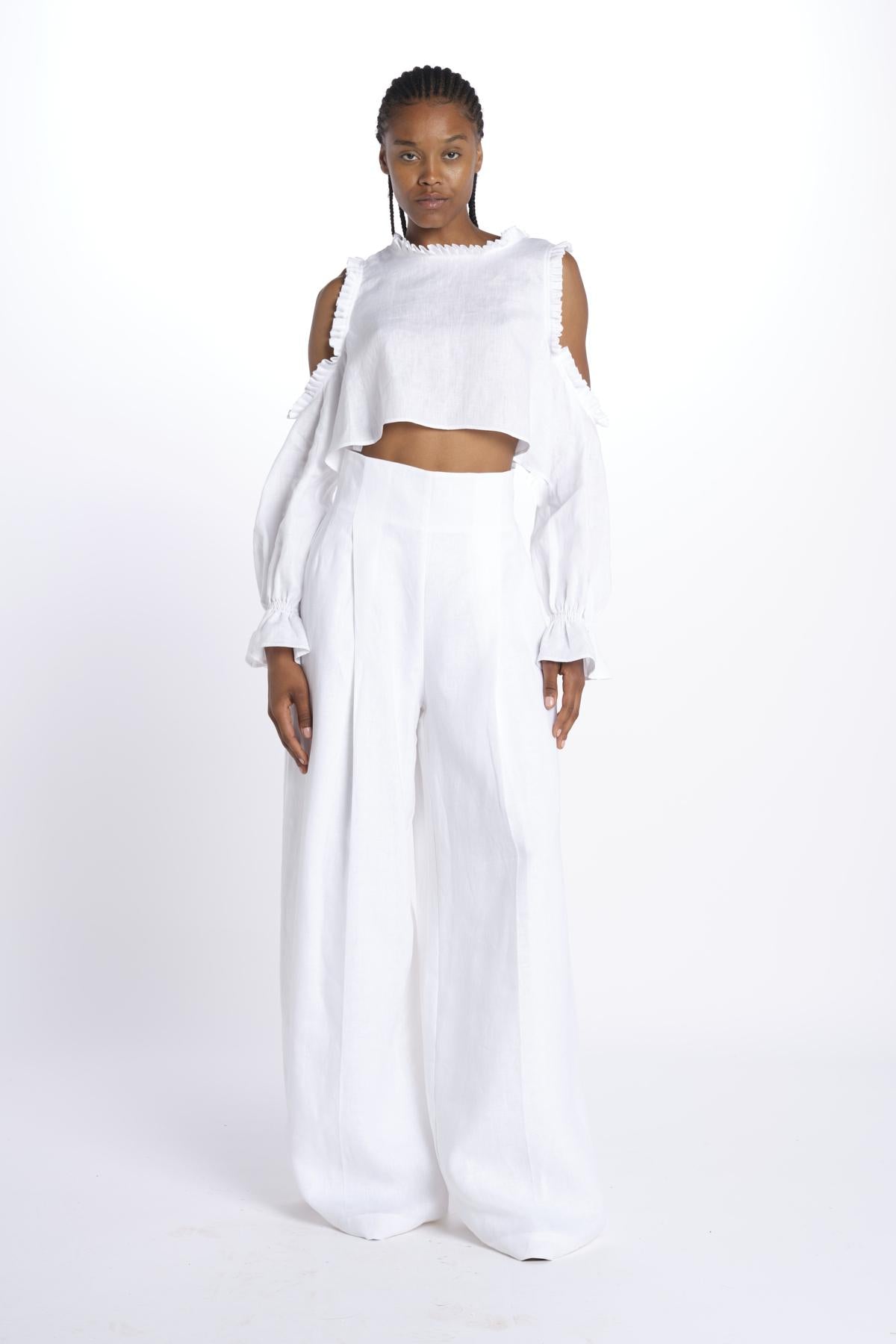 IRKA top by inasami. The model is 174 cm tall and wears a size 1. Composition: 100% linen.