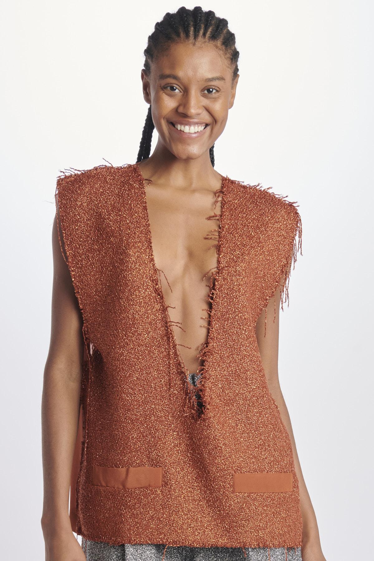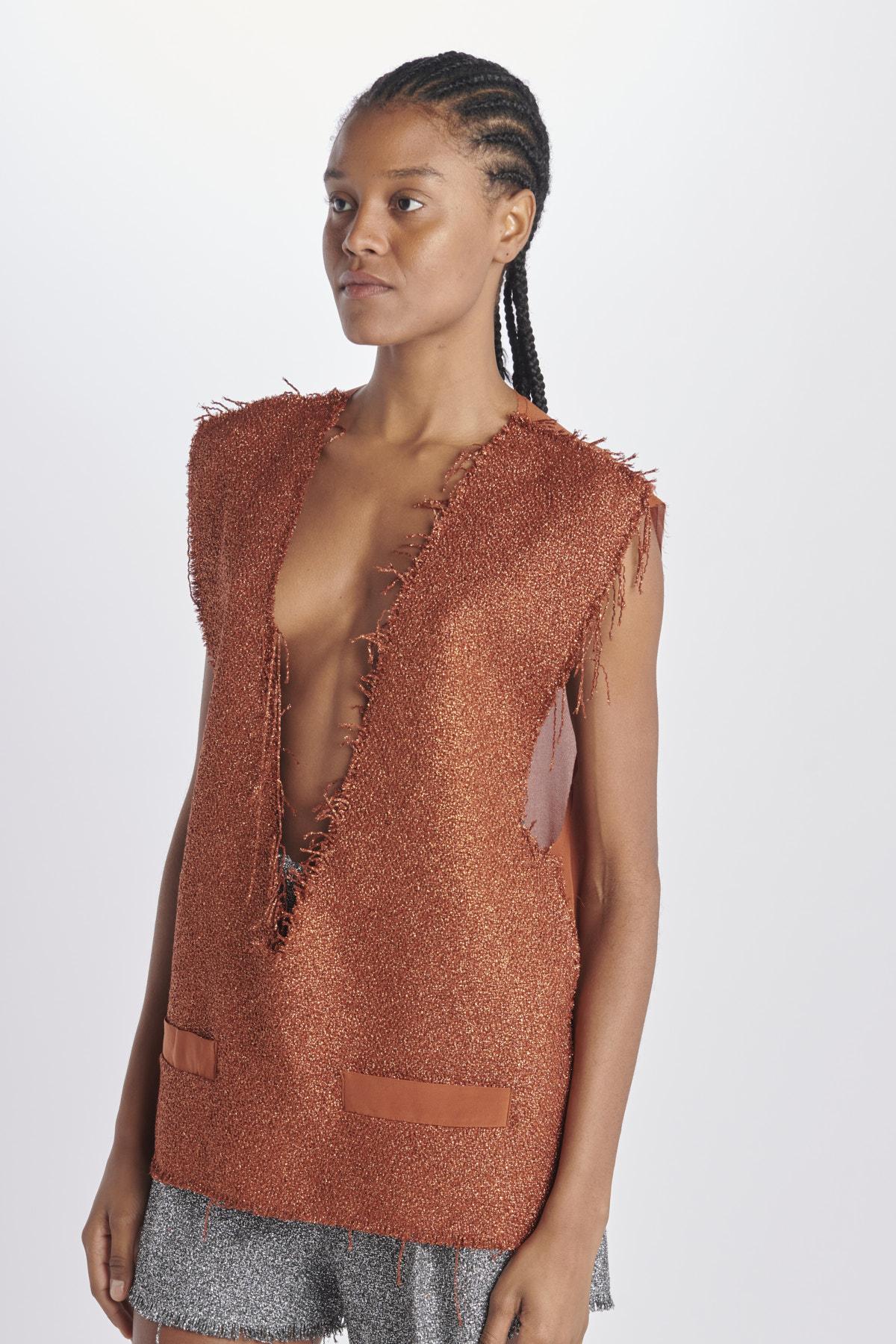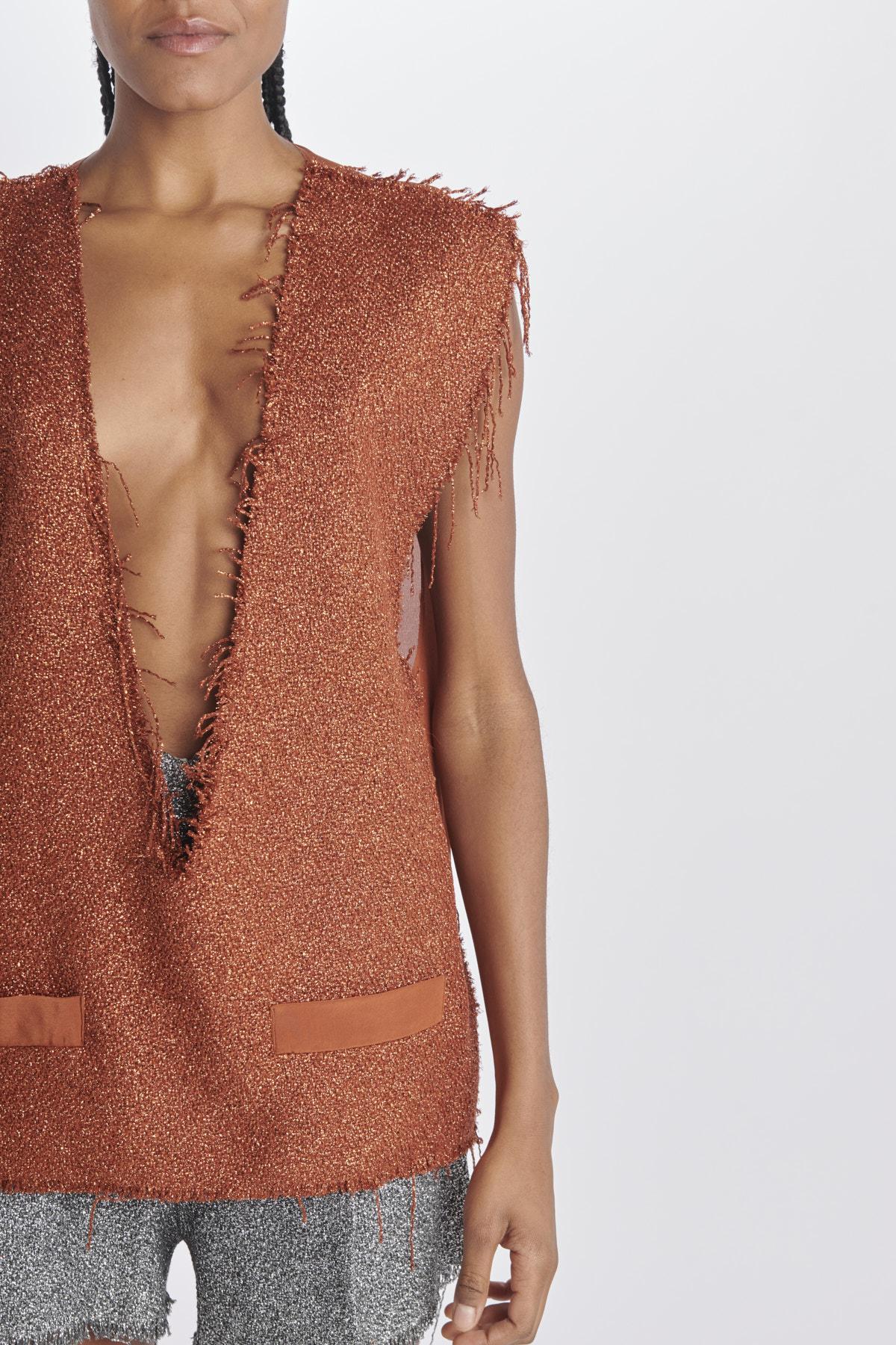 Gilet by Jejia di lurex. The model is 174 cm tall and wears size 38. Composition: 65% Viscose, 22% Polyester, 13% Polyamide.
