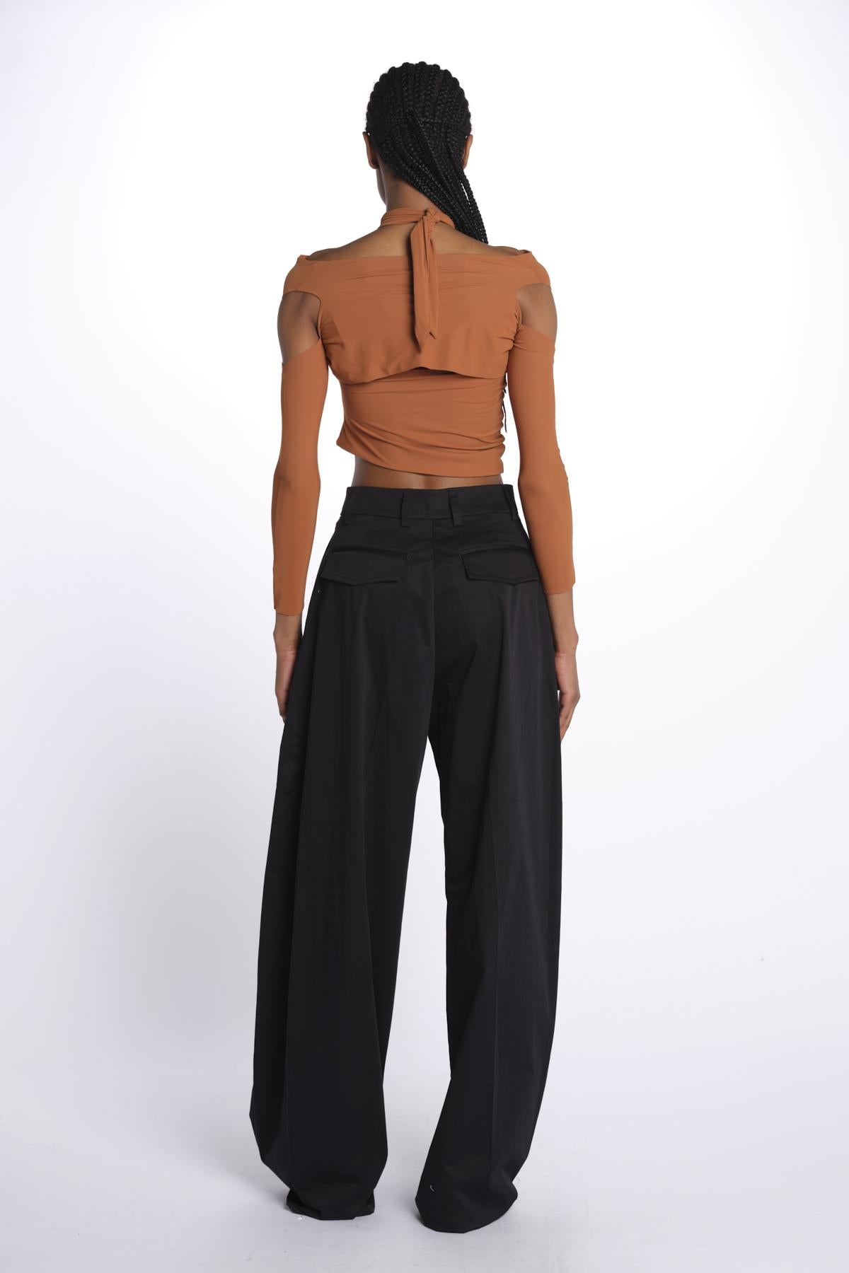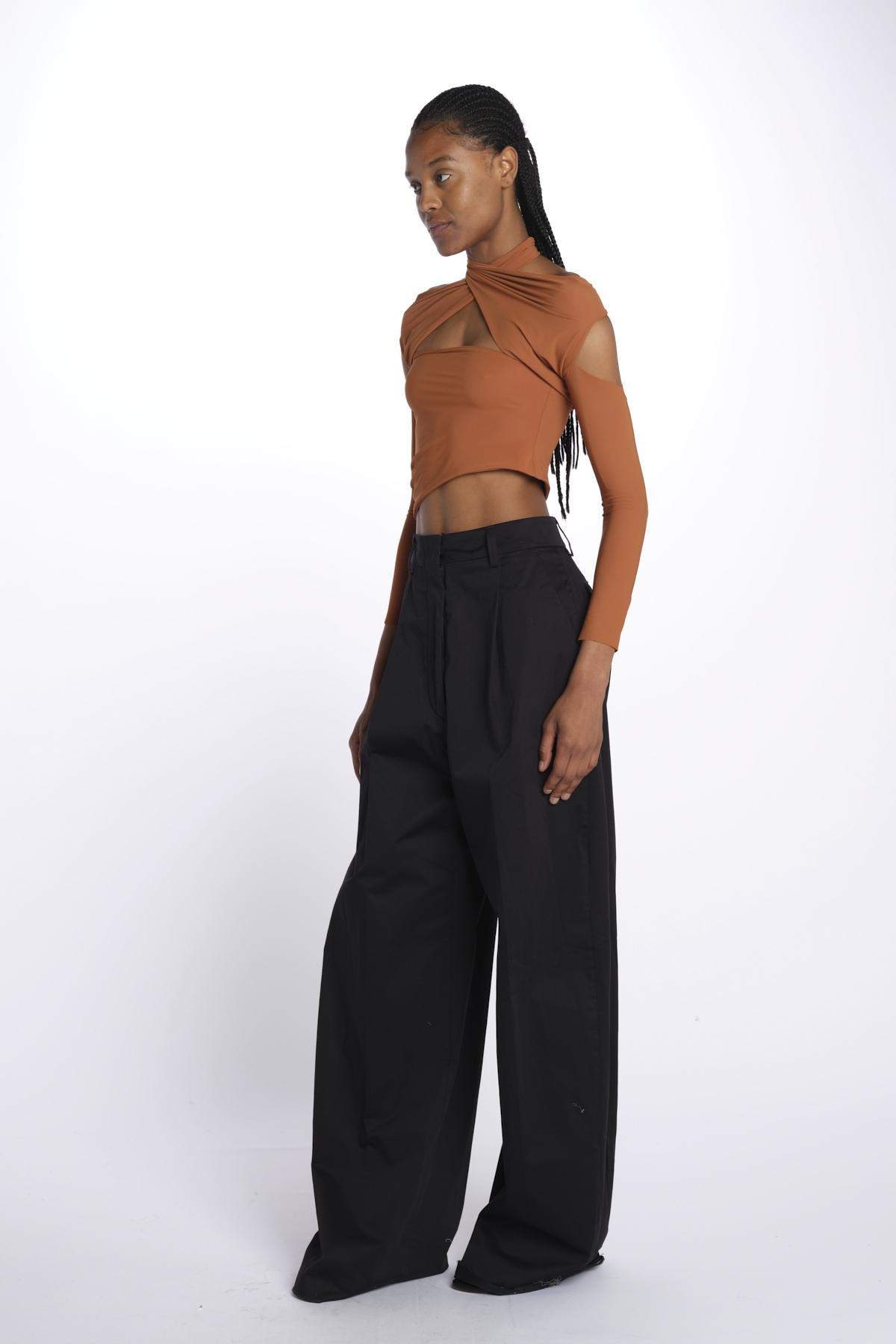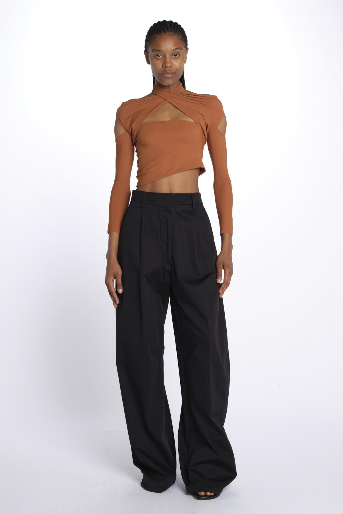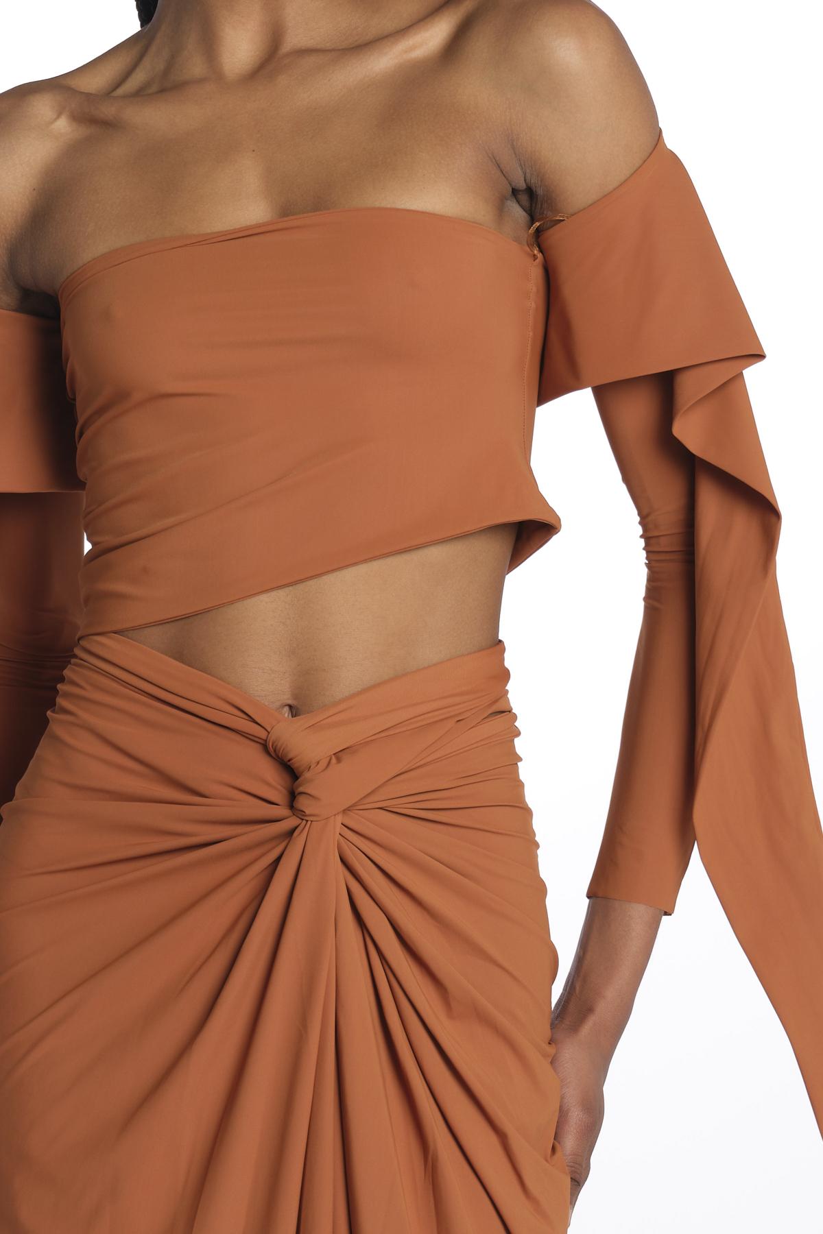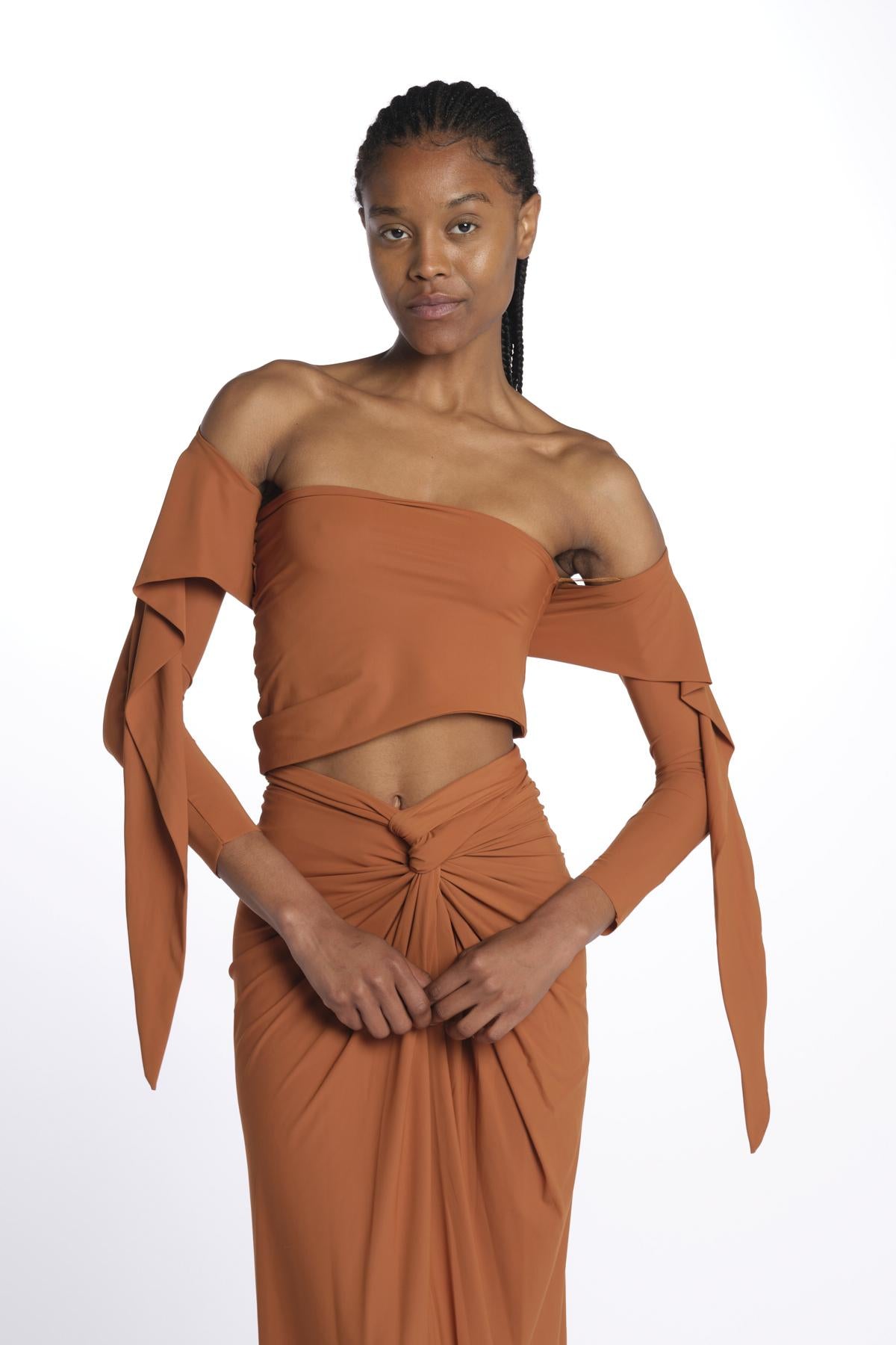 JOSIE top incrociato con spalla nuda by amazuìn. la modella è alta 174 cm e indossa ua taglia unica. Composizione: 100% nylon.