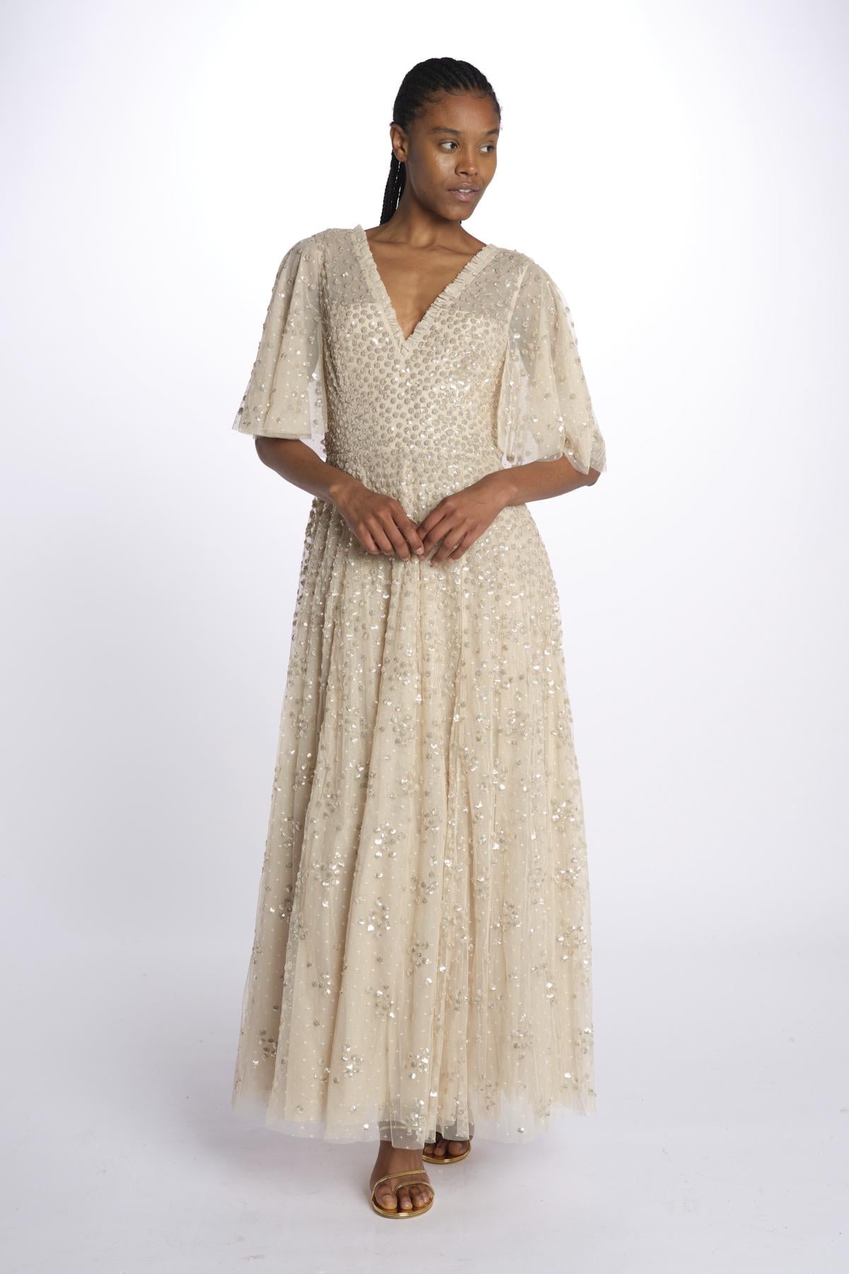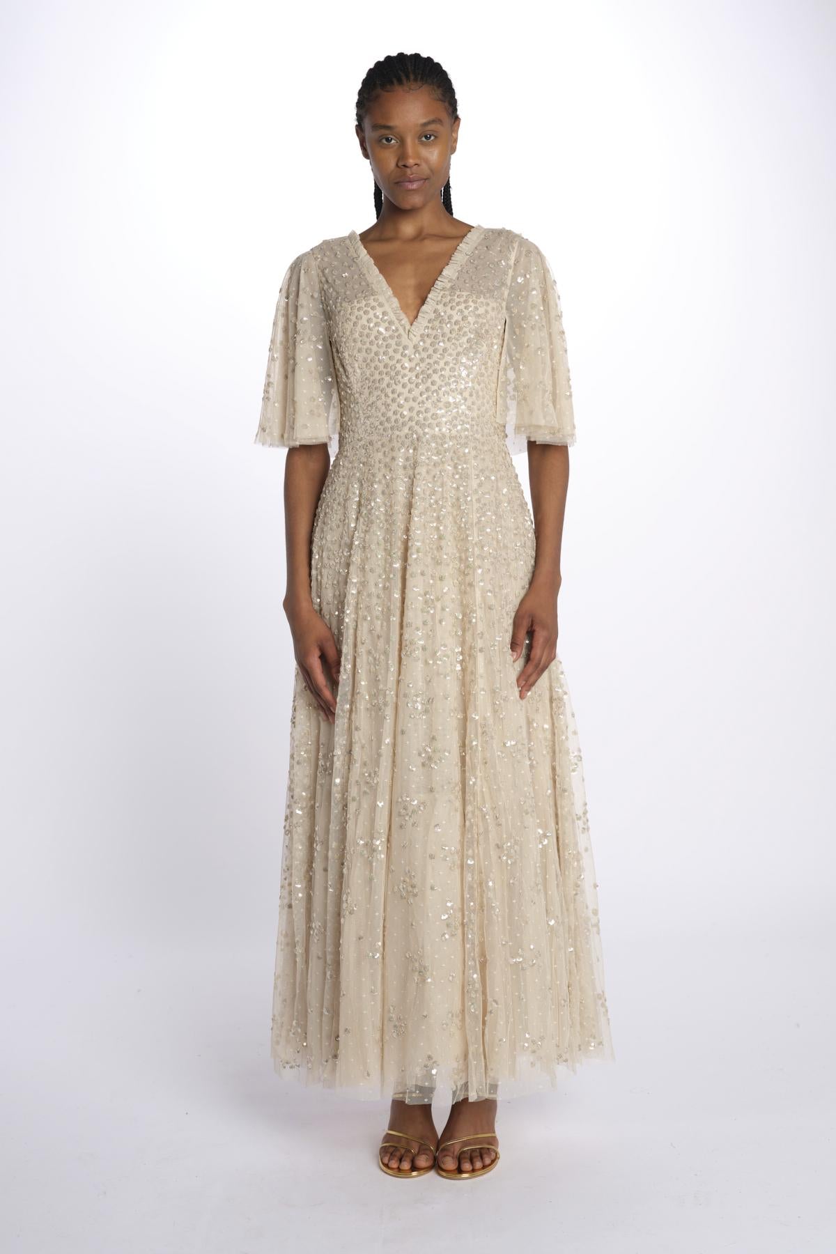 LEILA DOT VNECK m/c sequin dress by needle & tread. The model is 174 cm tall and wears a size 8. Composition: 100% recycled polyester.