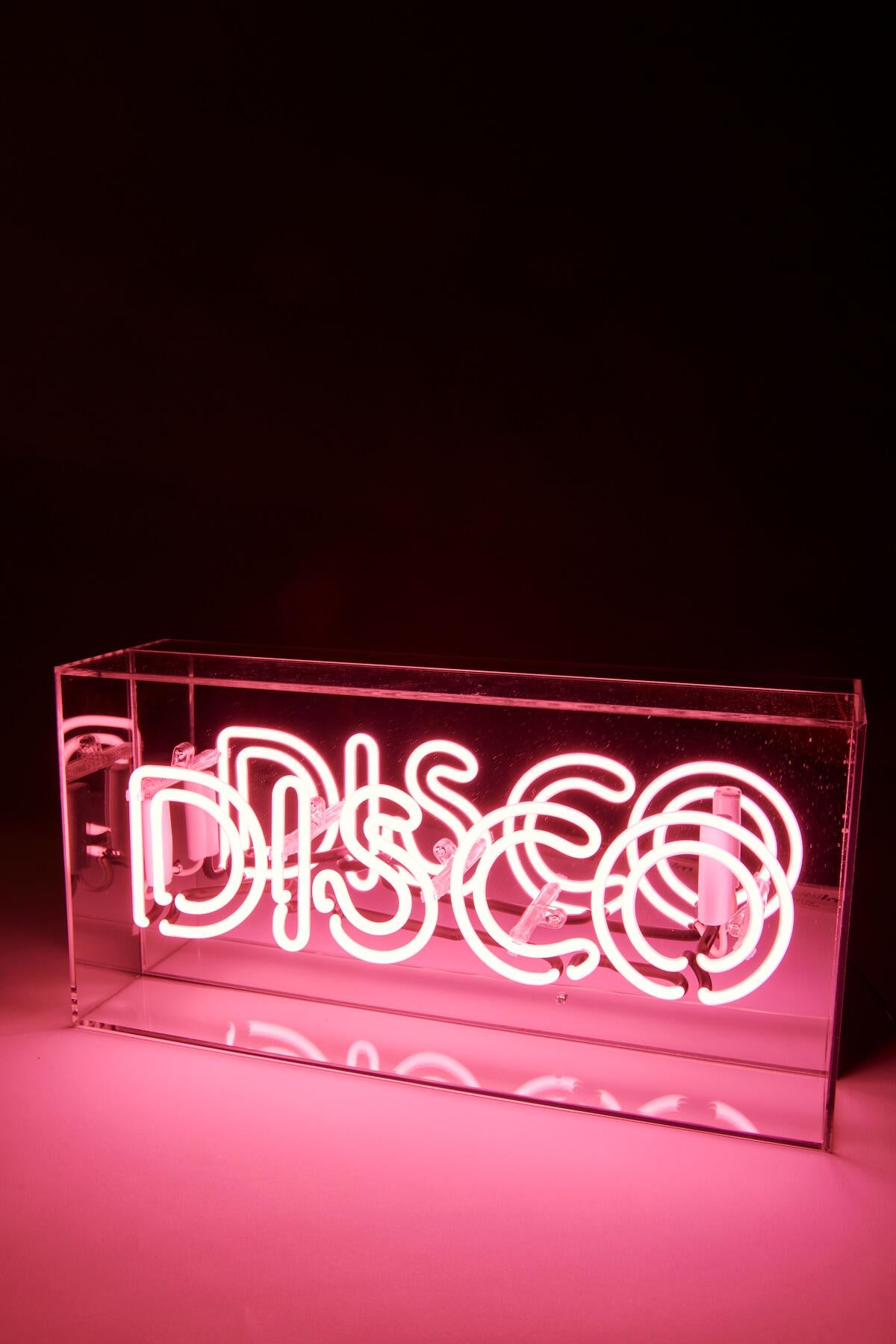 Pink Disco Neon Light by Locomocean. The neon is housed in a glossy acrylic box with a mirrored back. Adapter plug included 12V DC UK and EU Dimensions: 38 x 19 x 10.5 cm / 15 x 7.5 x 4.1 inches.
