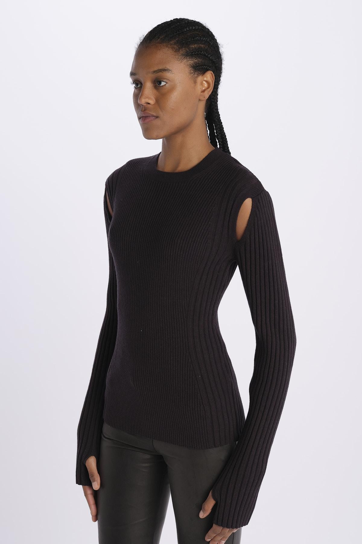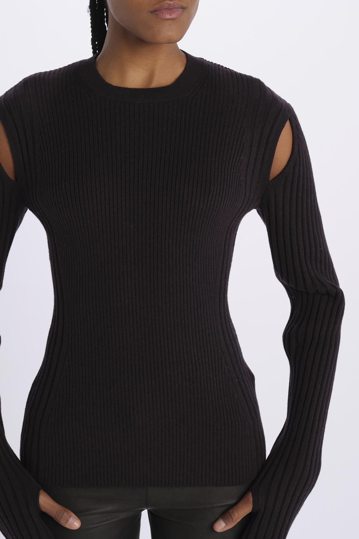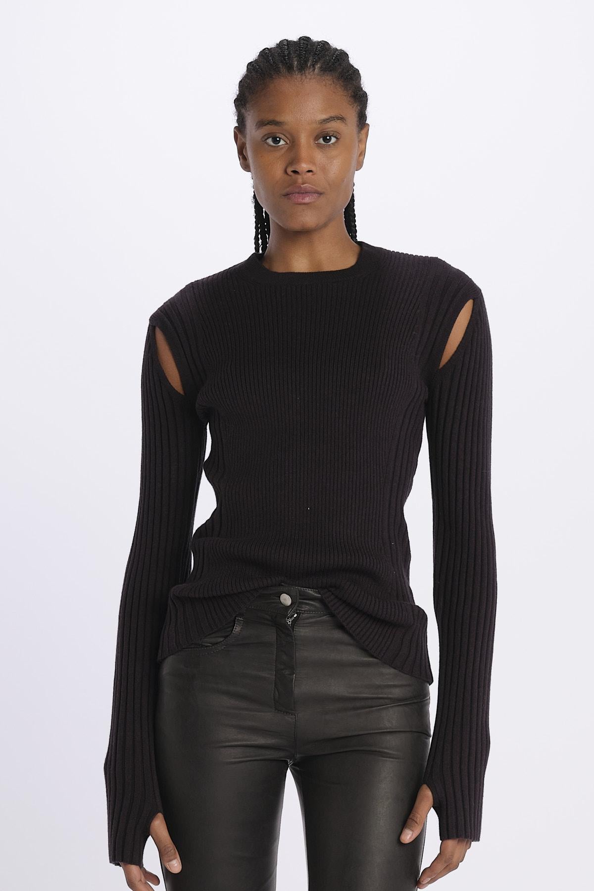 Sweater by Lvir crew neck open on the shoulders. The model is 174 cm tall and wears size S. Composition: 50% Acrylic, 30% Wool, 20% Polyester.