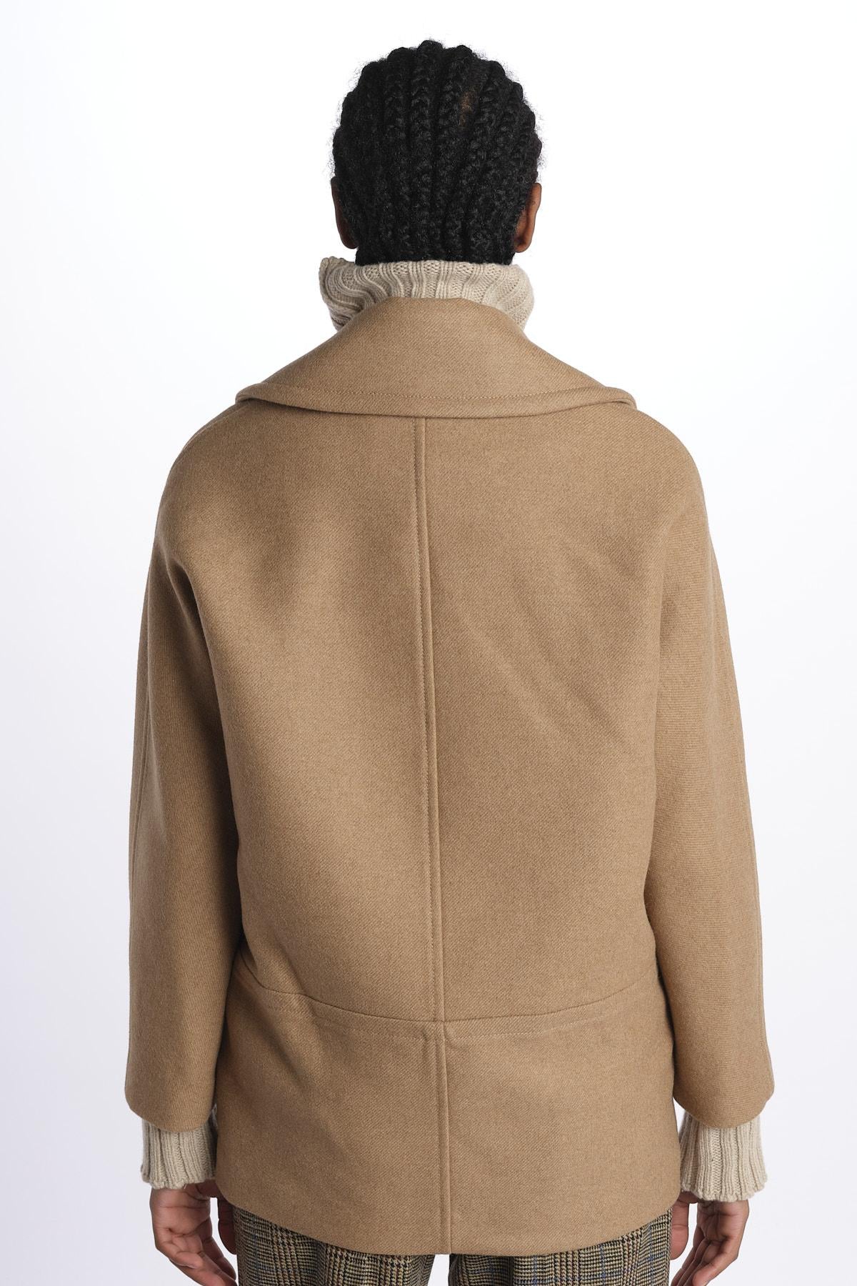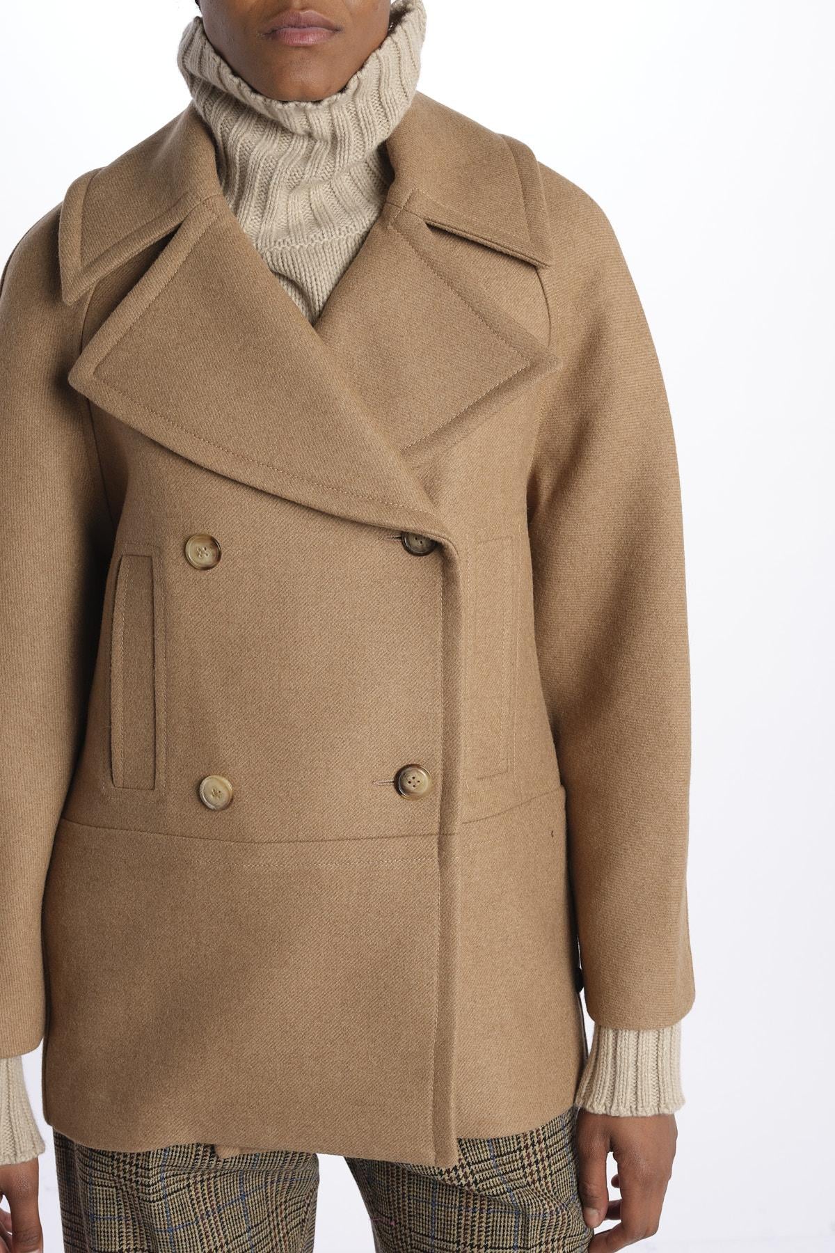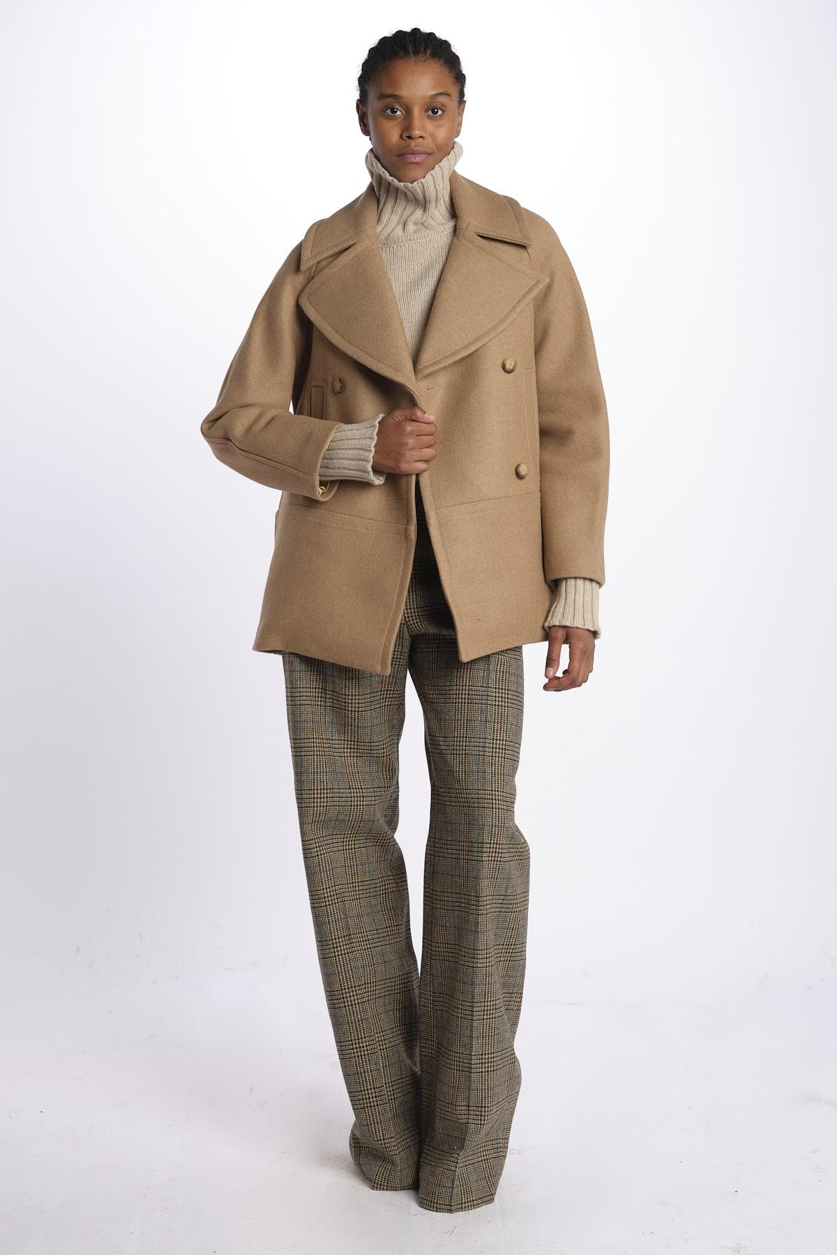 Coat by Martin Grant double breasted. The model is 174 cm tall and wears size 36. Composition: 100% Camel.