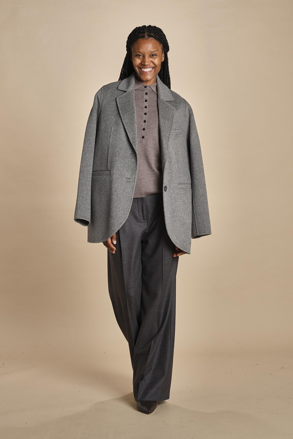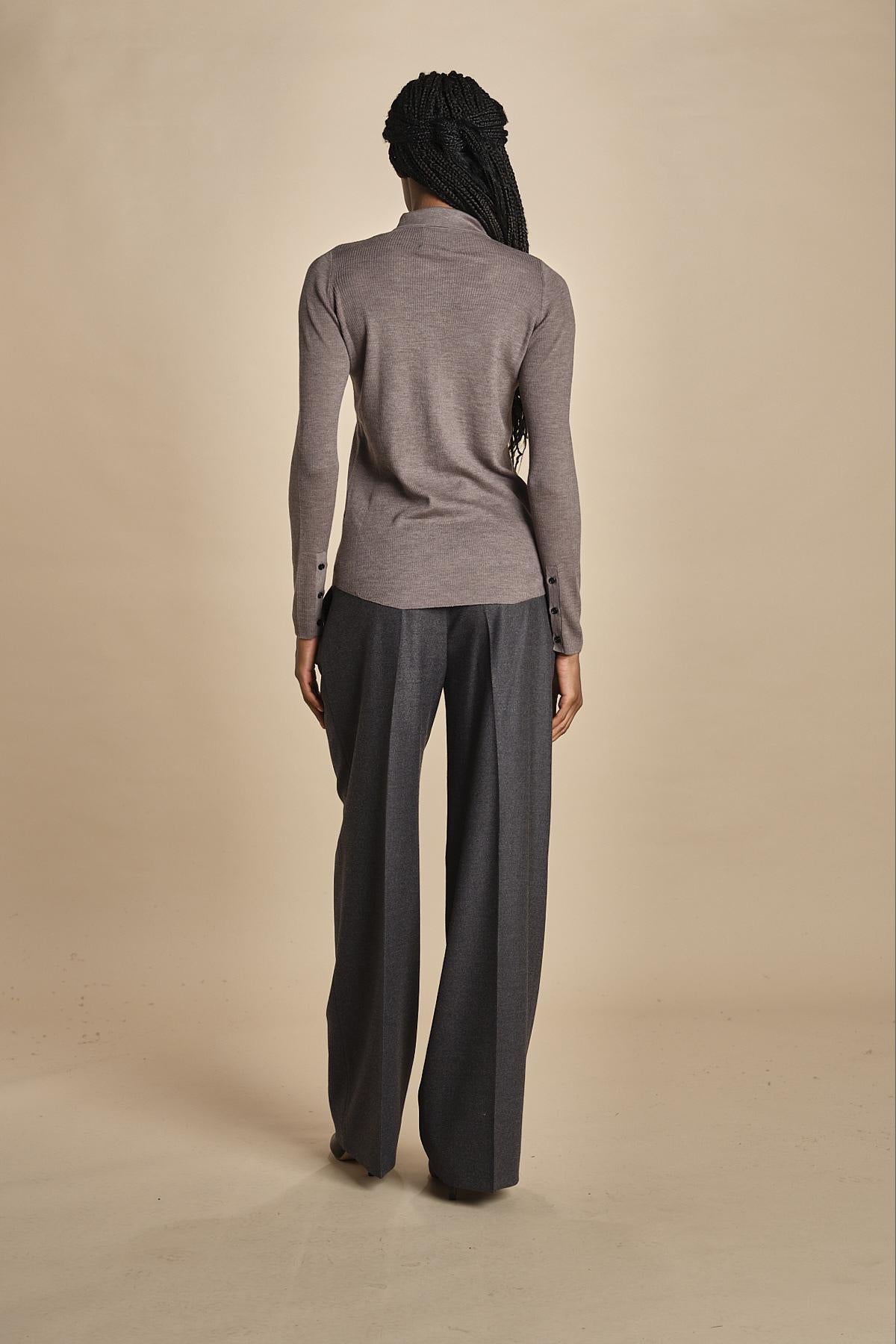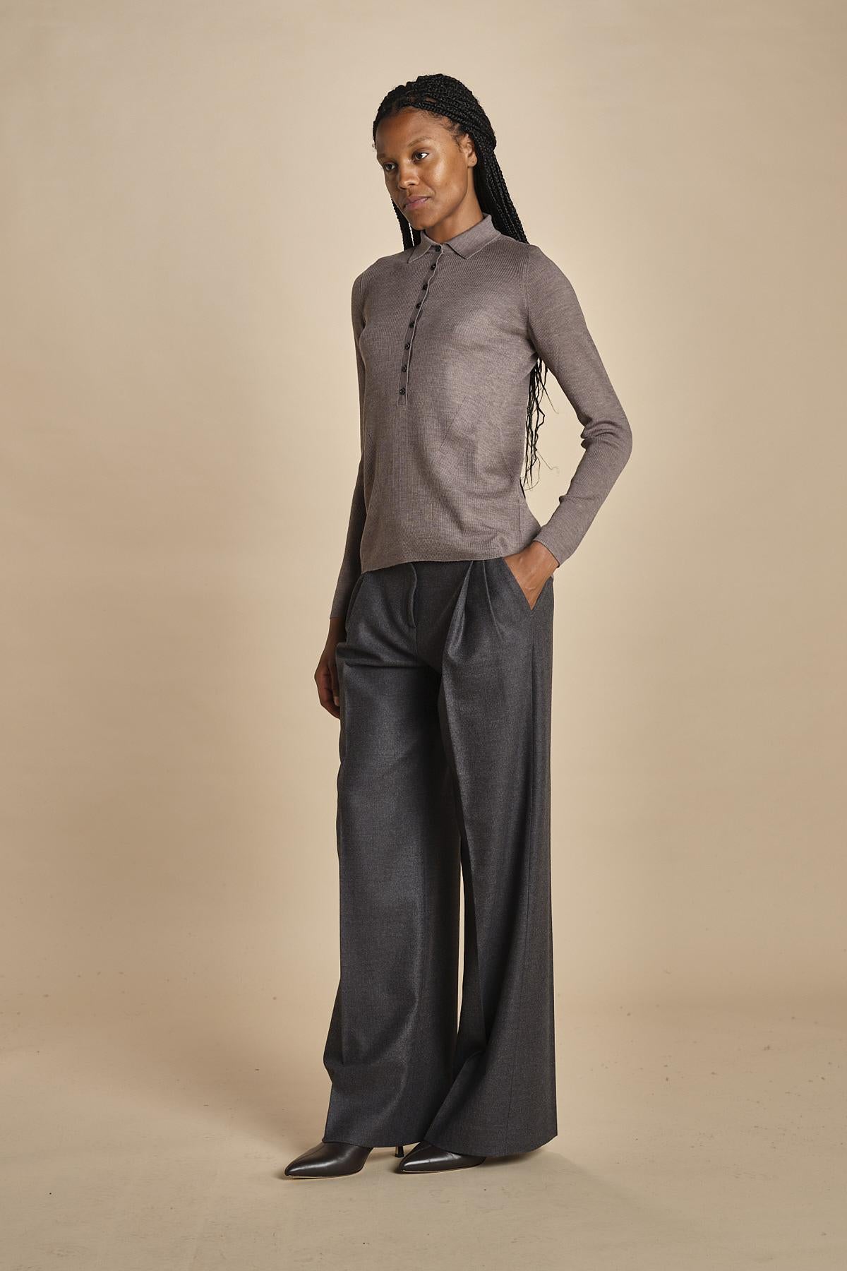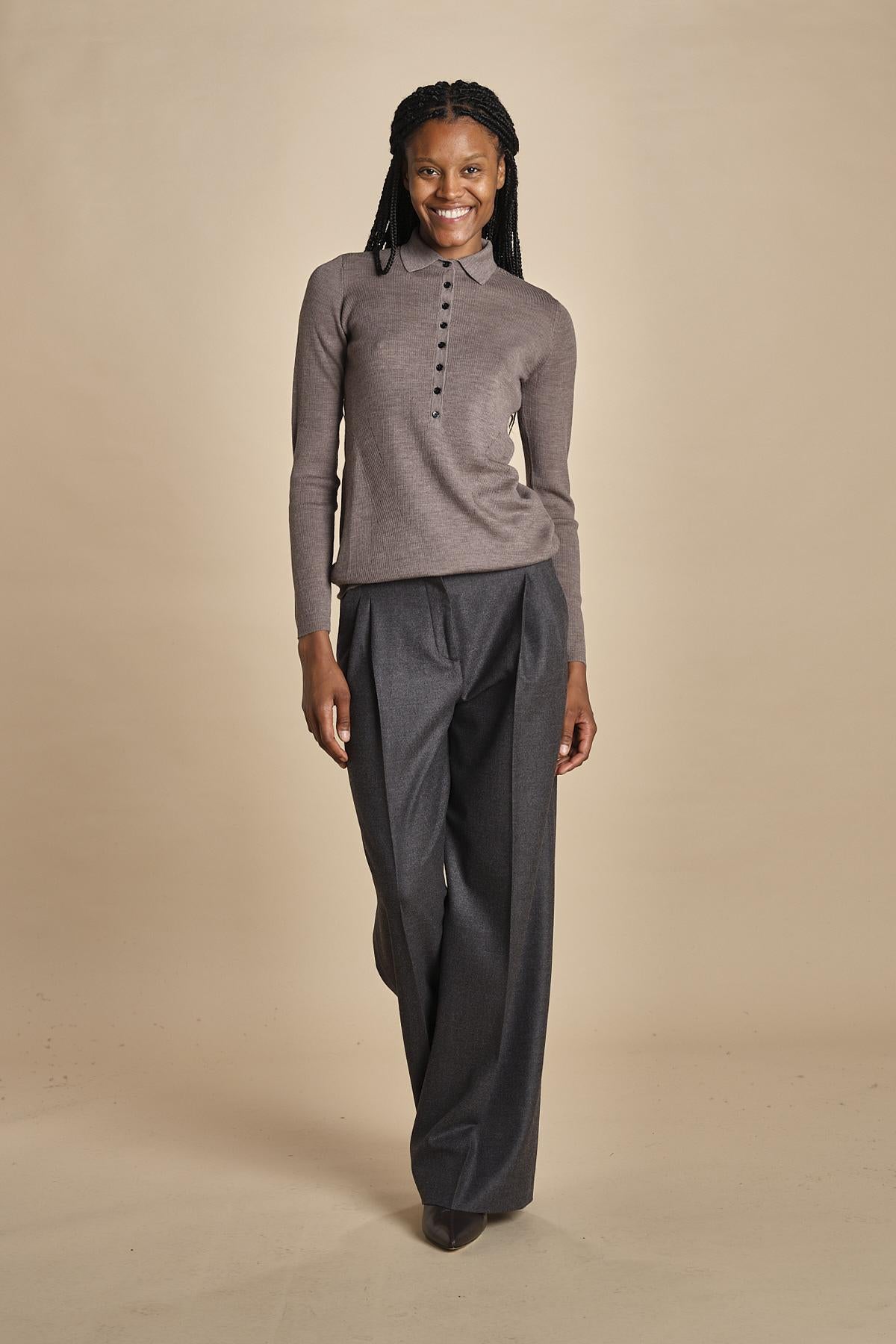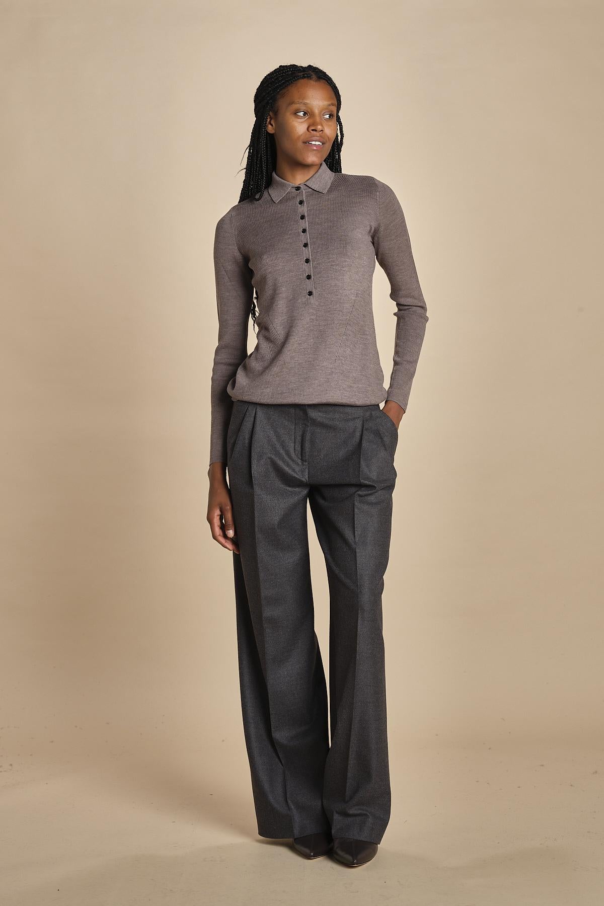 polo a costine in merino. La modella è alta 174 cm e indossa una taglia S. Composizione: 100% lana merino