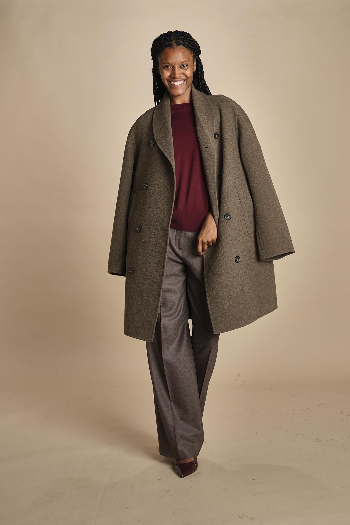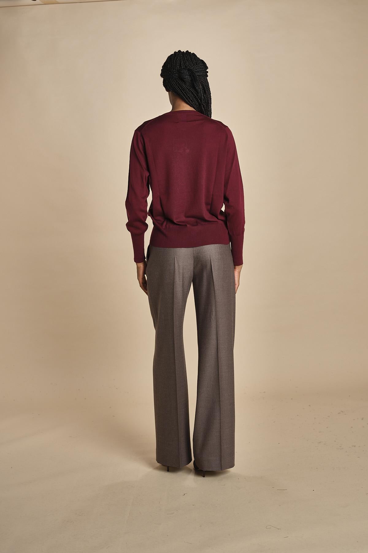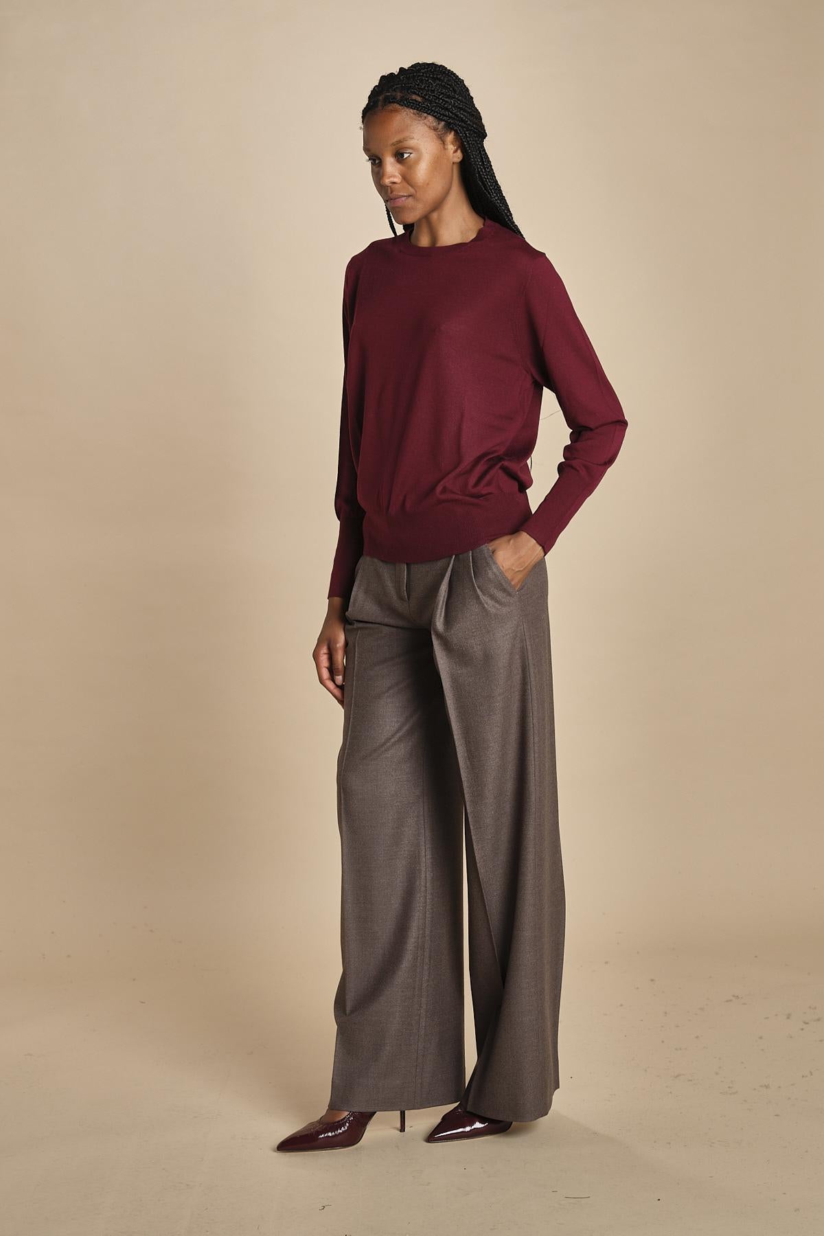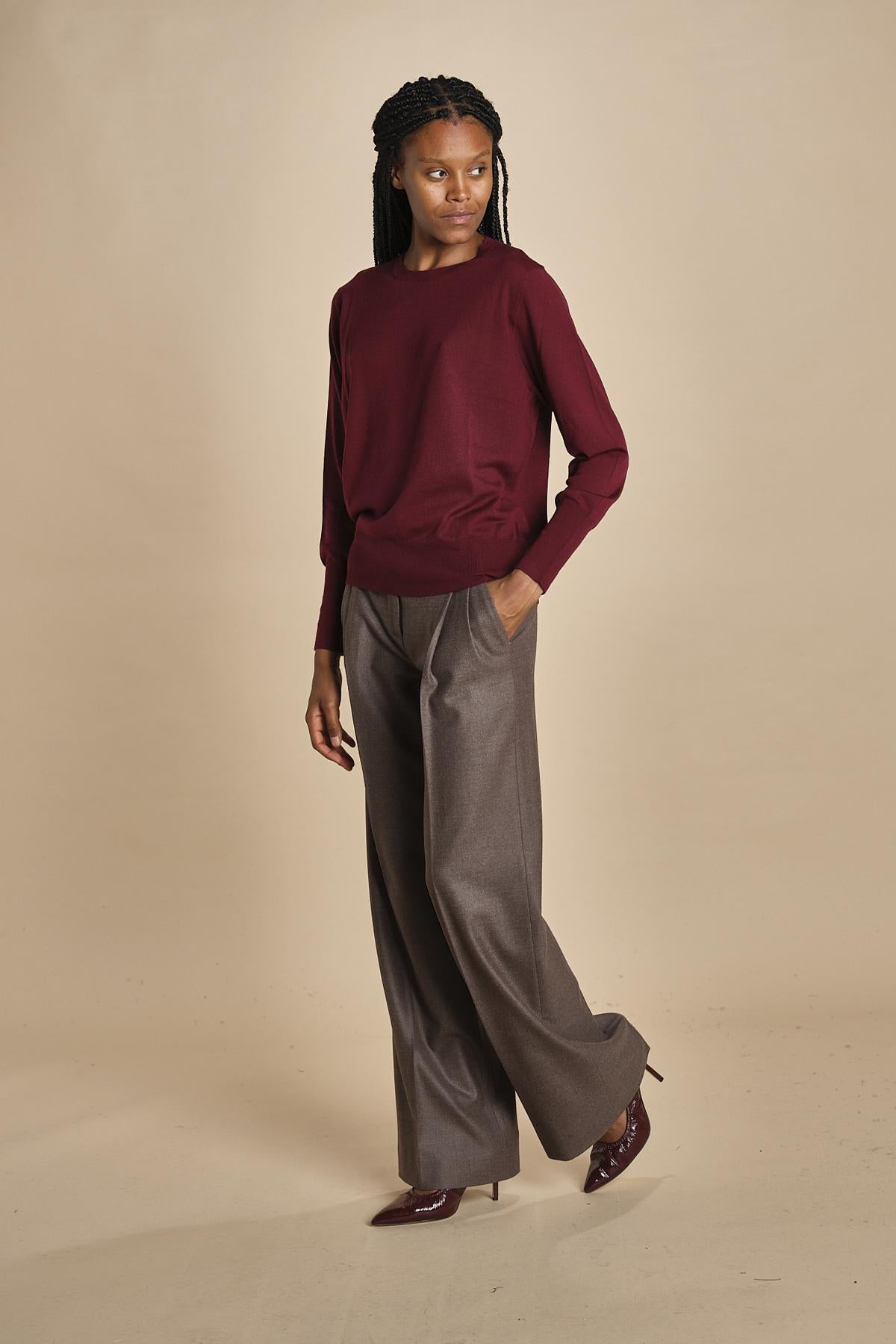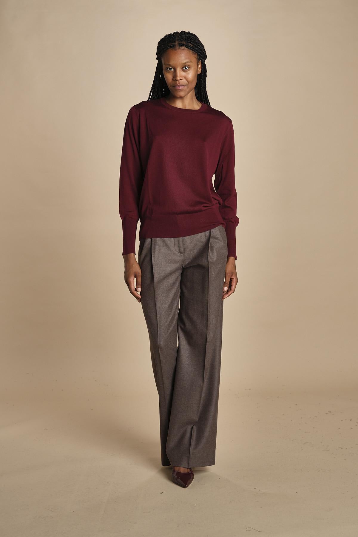 girocollo over in merino. La modella è alta 174 cm e indossa una taglia S. Composizione: 100% lana merino