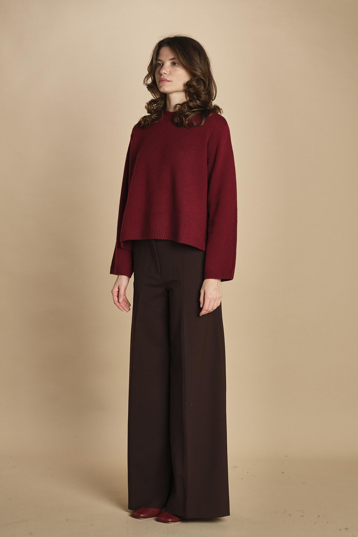 girocollo rasato. La modella è alta 174 cm e indossa una taglia S. 100% cachemire