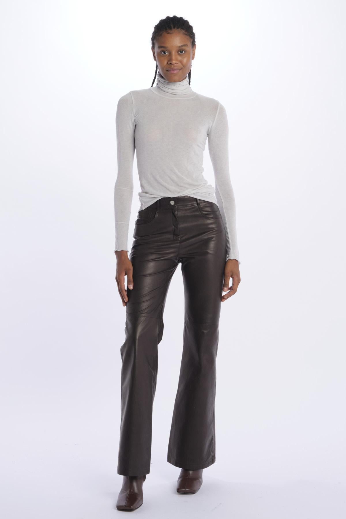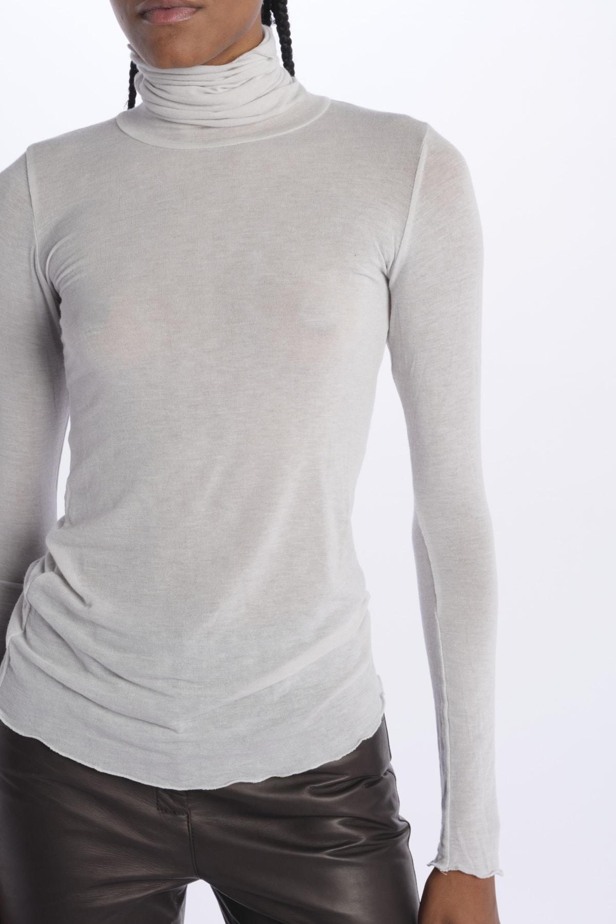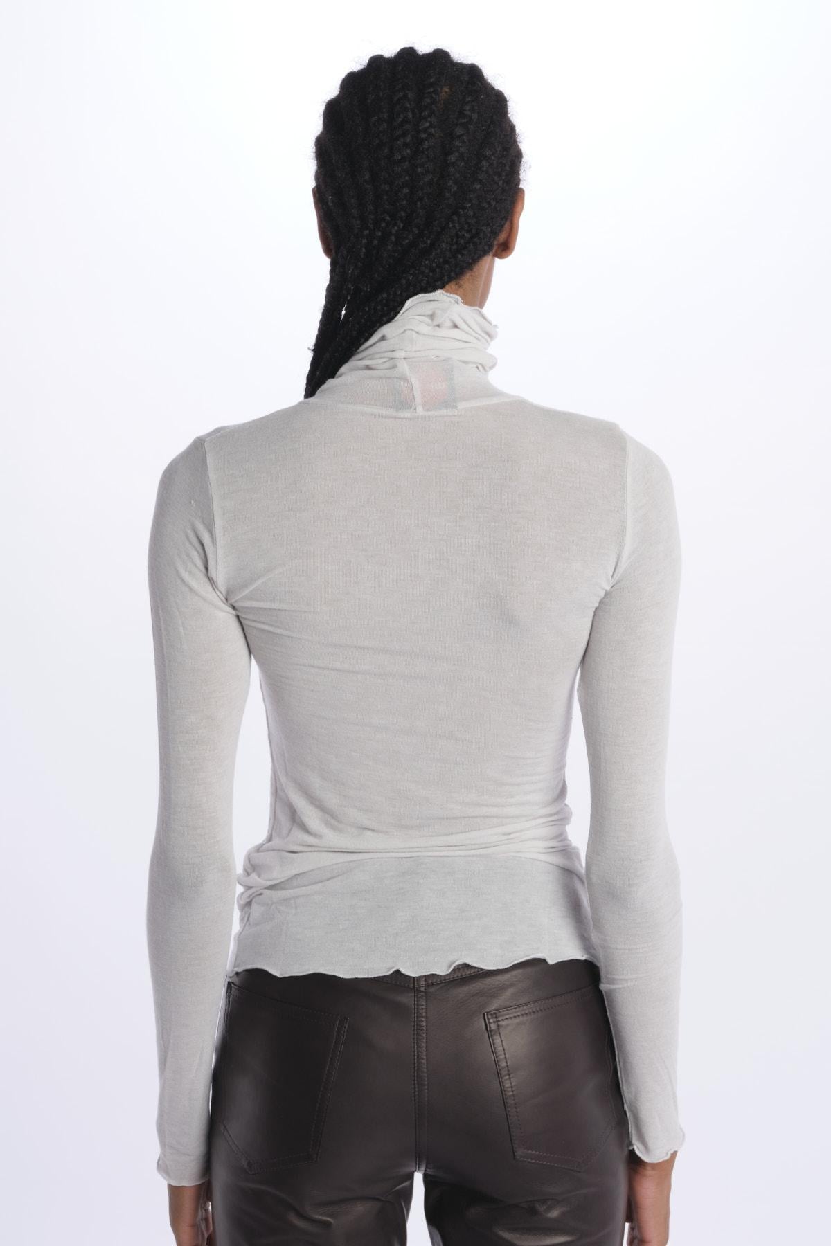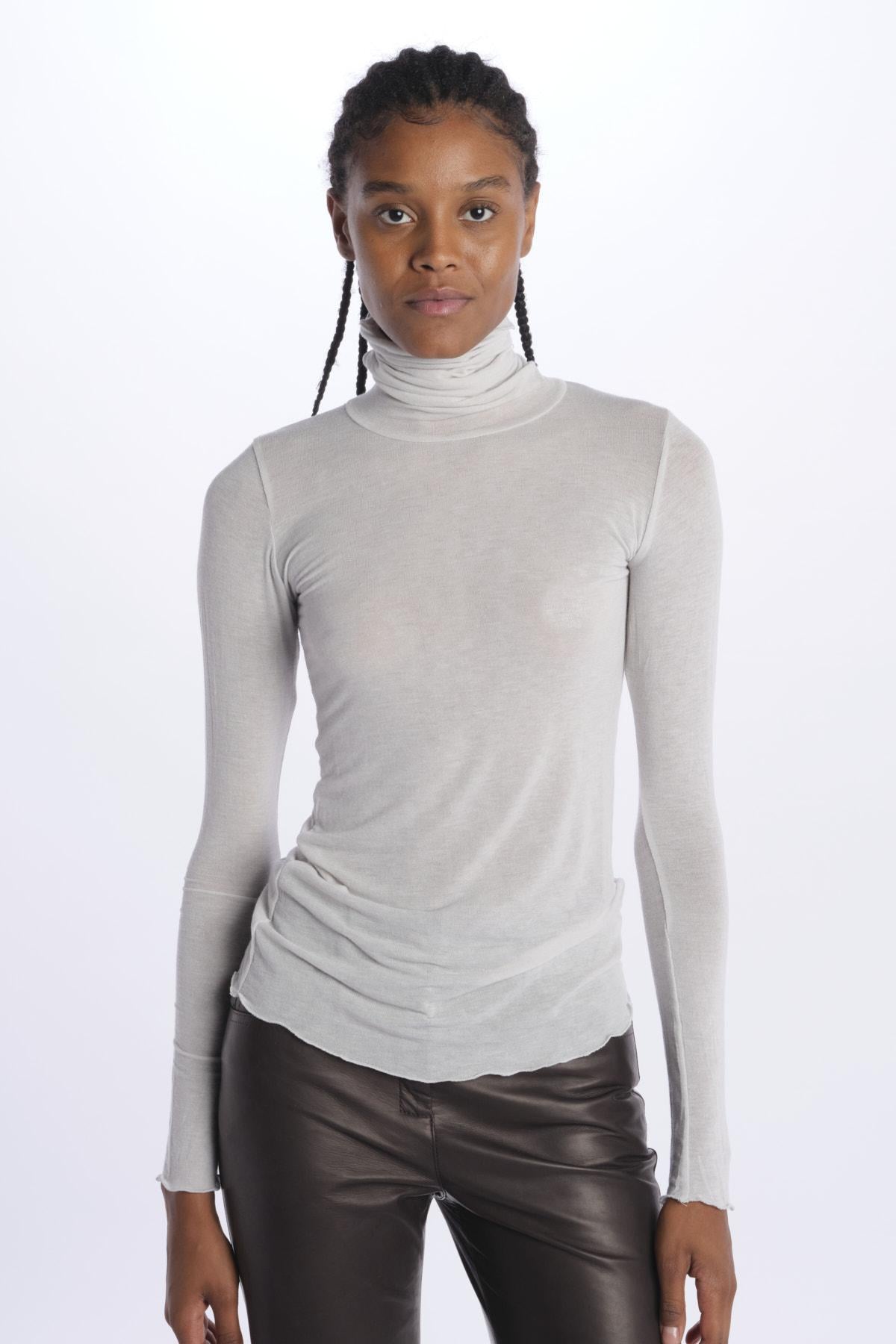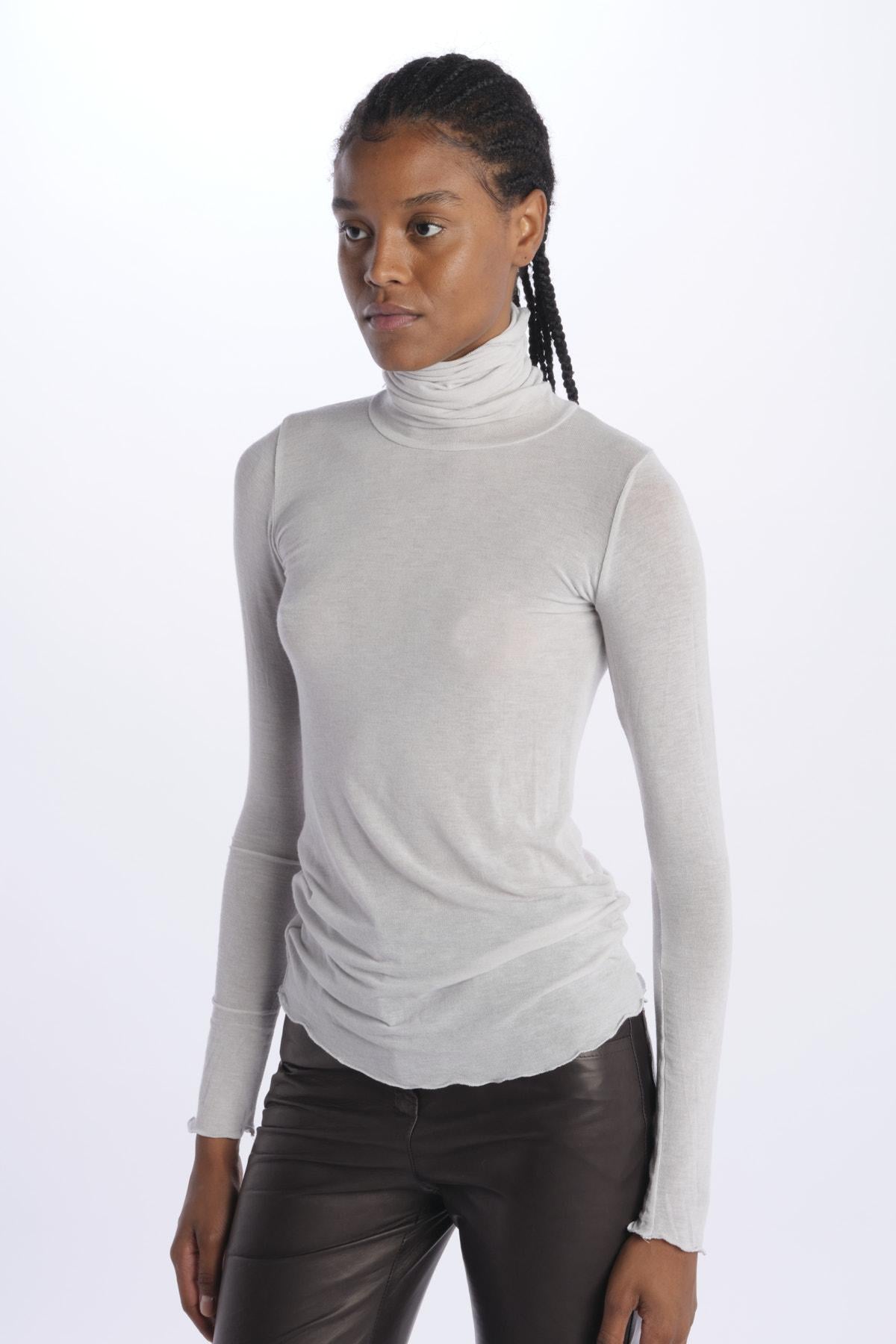Sweater by Milaura solid color jersey turtleneck. The model is 174 cm tall and wears size S. Composition: 64% Viscose, 18% Polyamide, 8% Elastane, 10% Cashmere.
