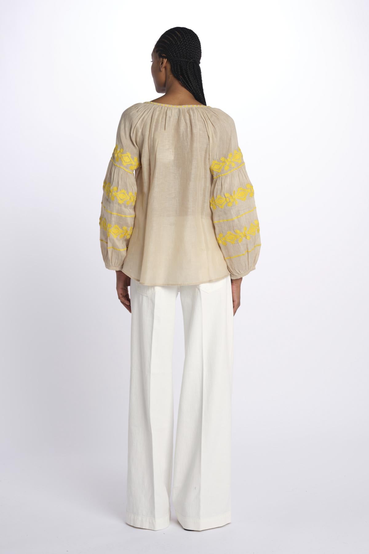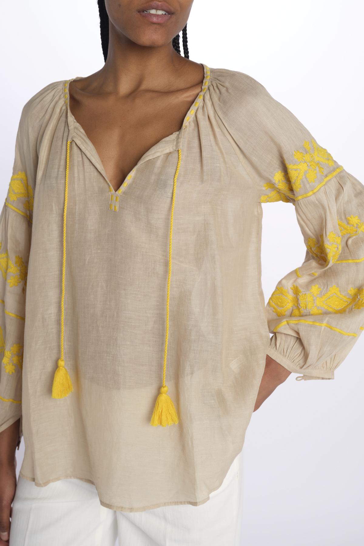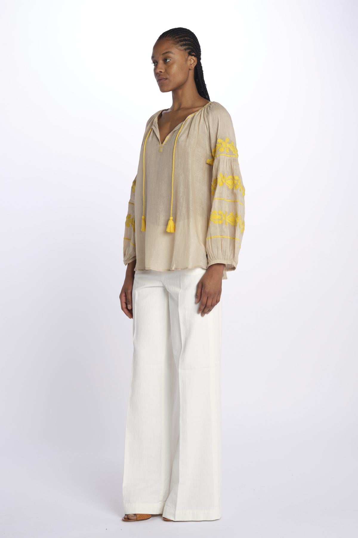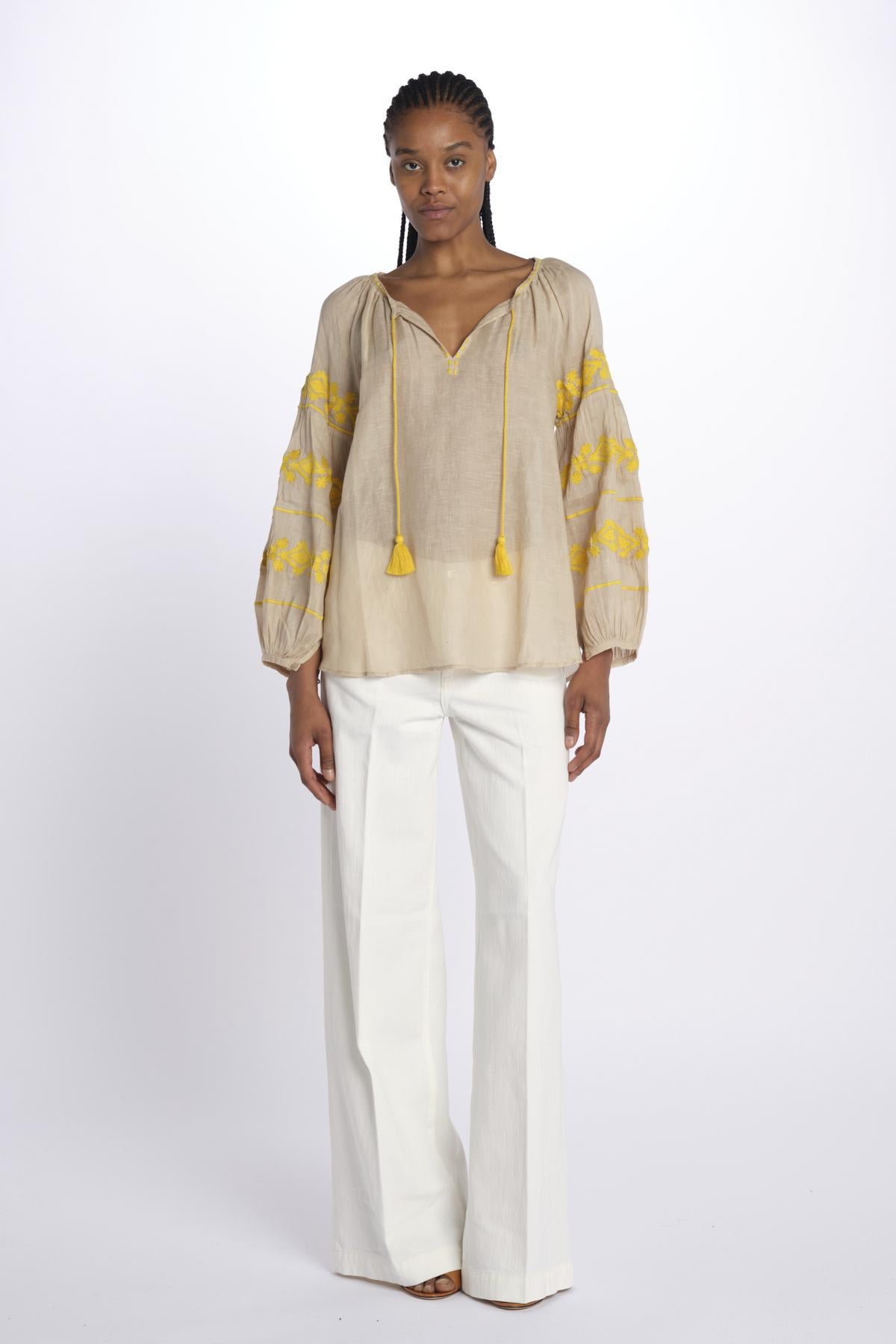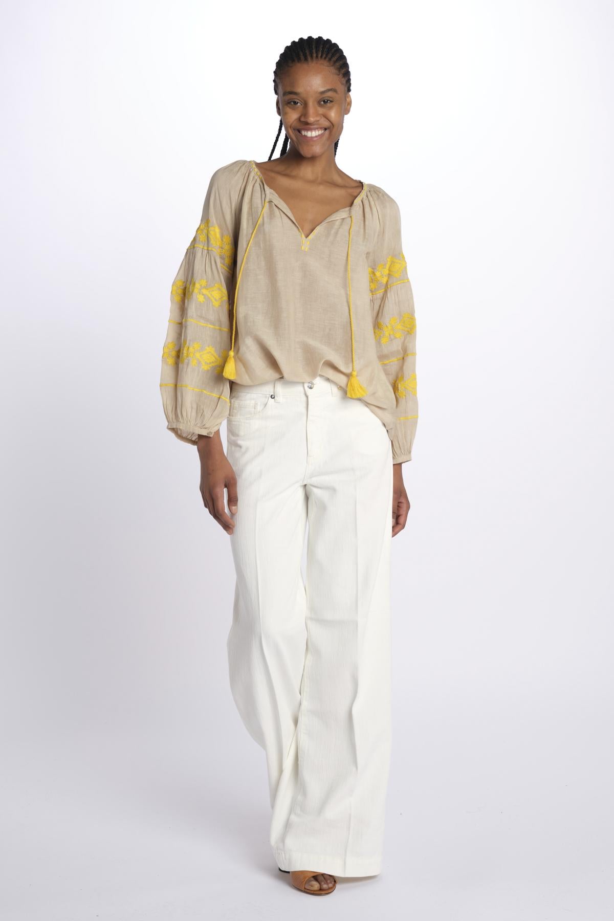BYBLOS embroidered sleeve shirt by milaura. The model is 174 cm tall and wears a size XS. Composition: 60% cotton, 40% linen.