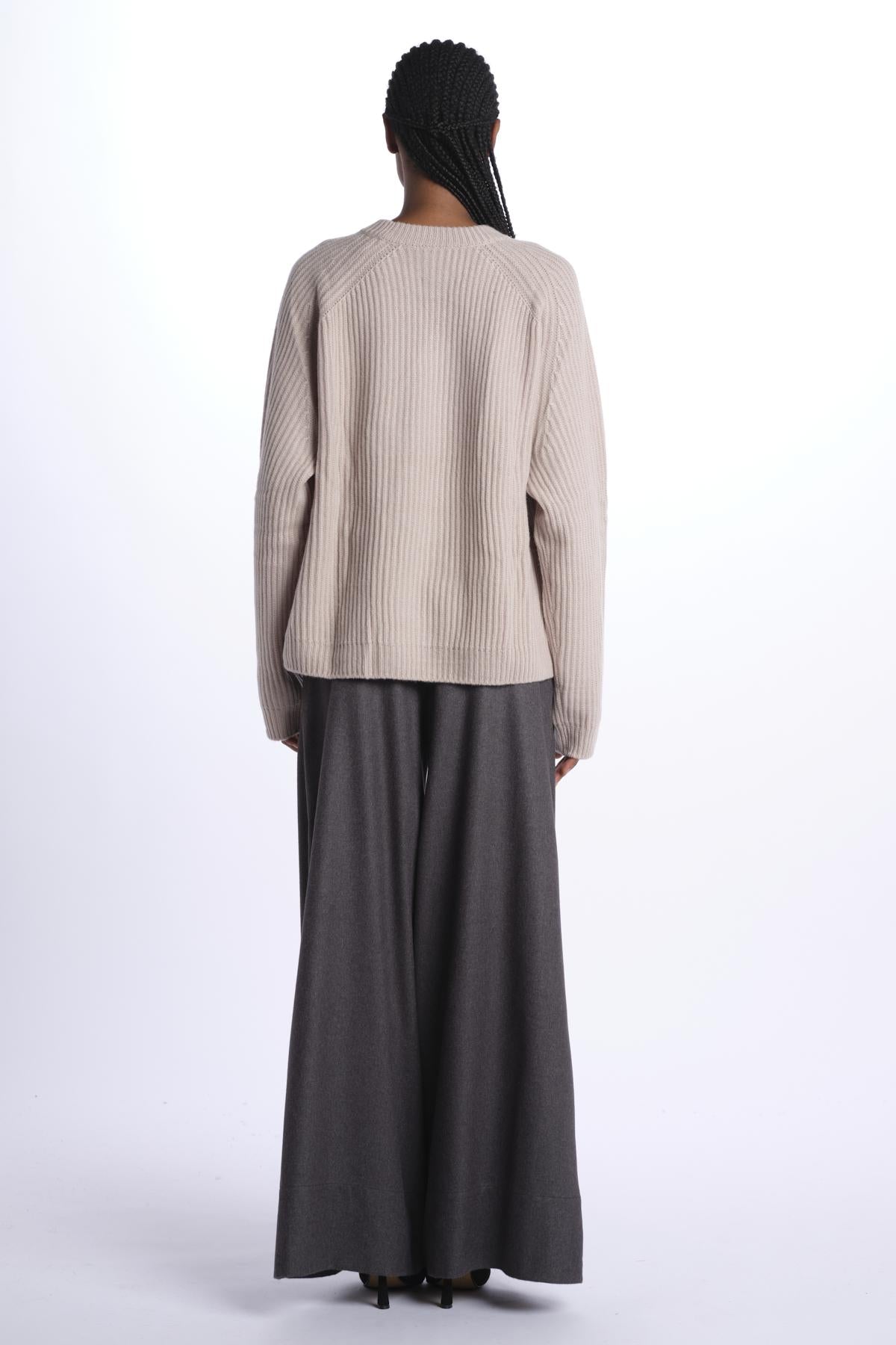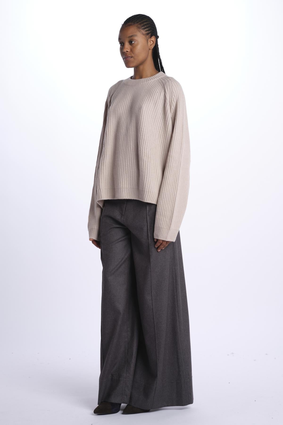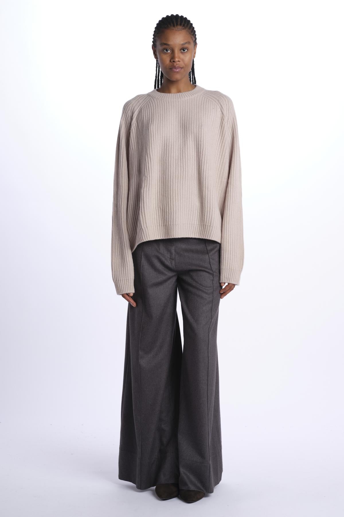 Ribbed oversized crewneck by milaura knit. The model is 174 cm tall and wears a size 0/1. Composition: 100% cashmere.