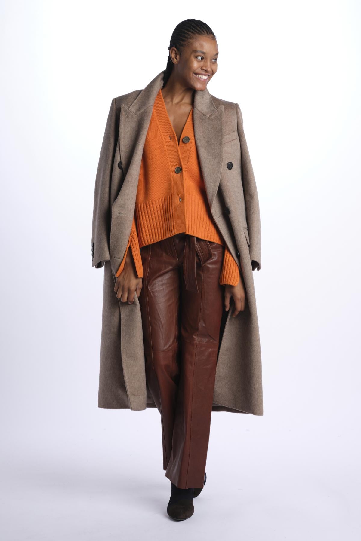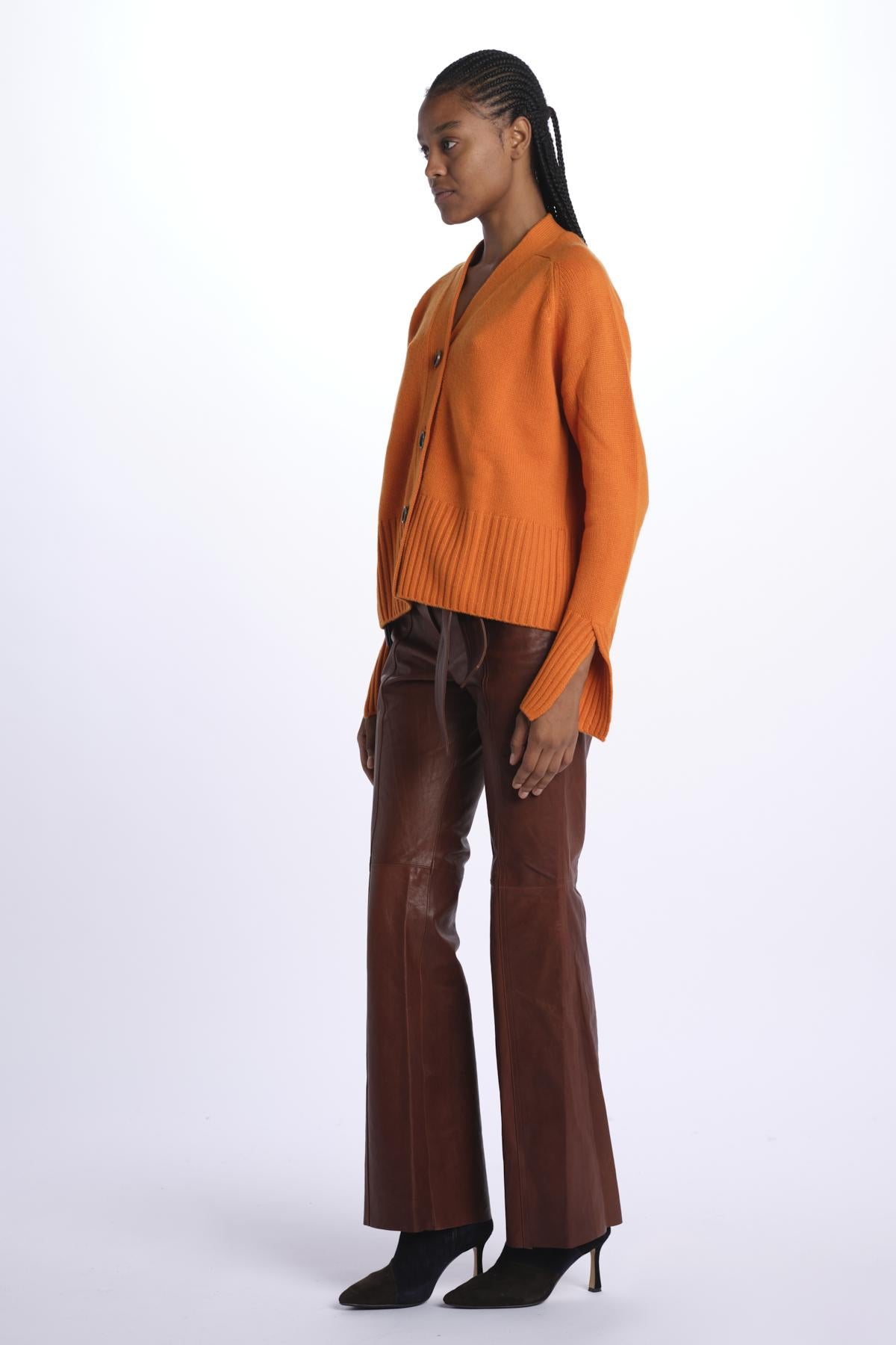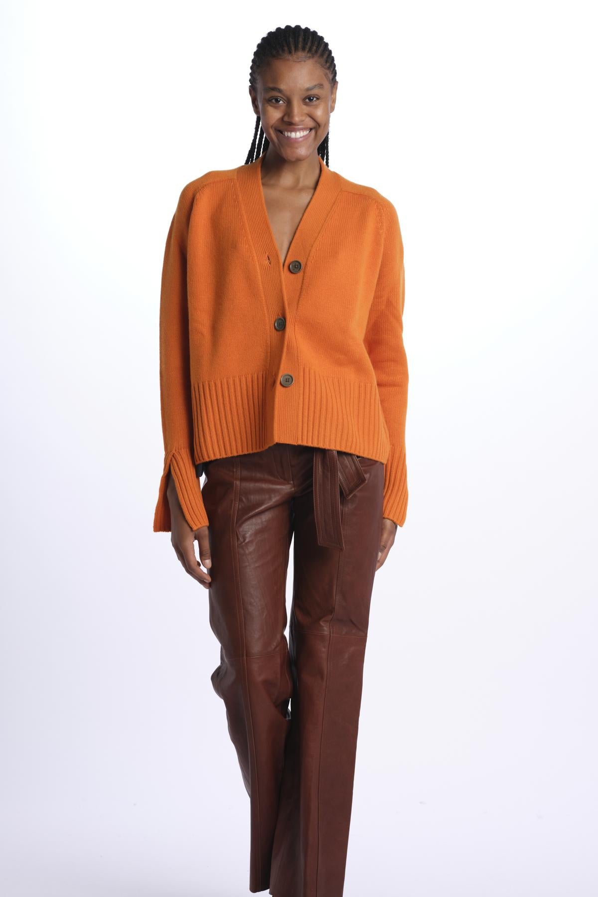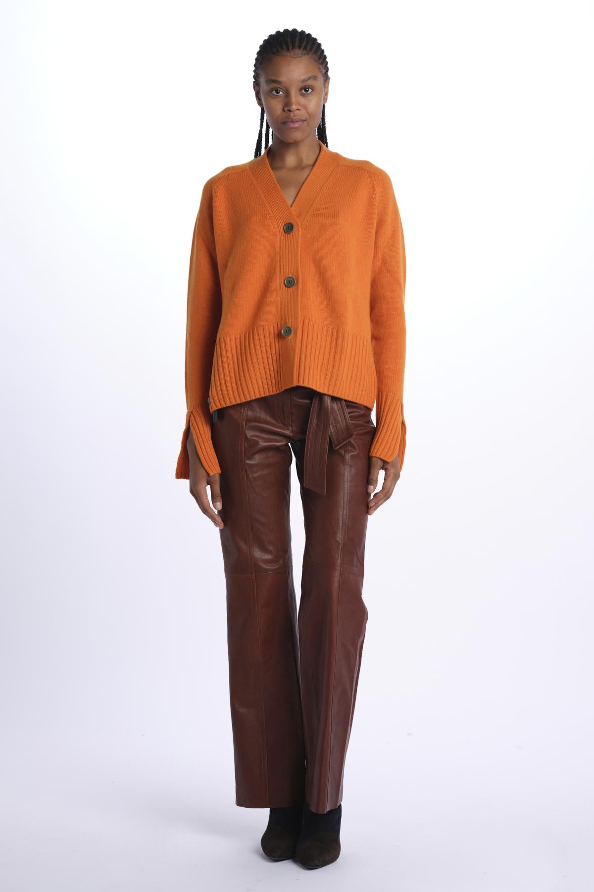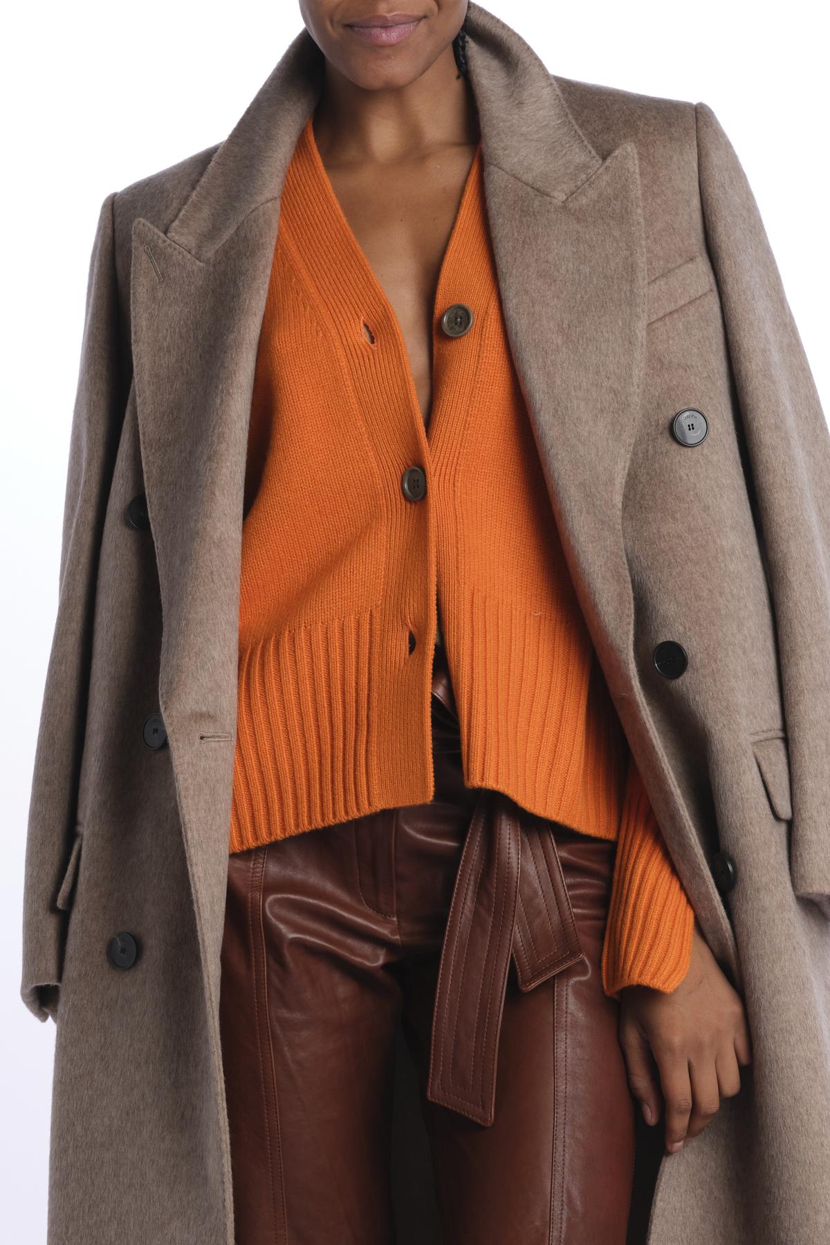 3 button cardigan by milaura knit. The model is 174 cm tall and wears a size XS. Composition: 100% cashmere.