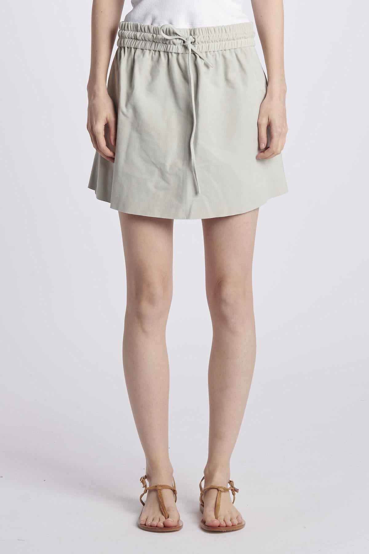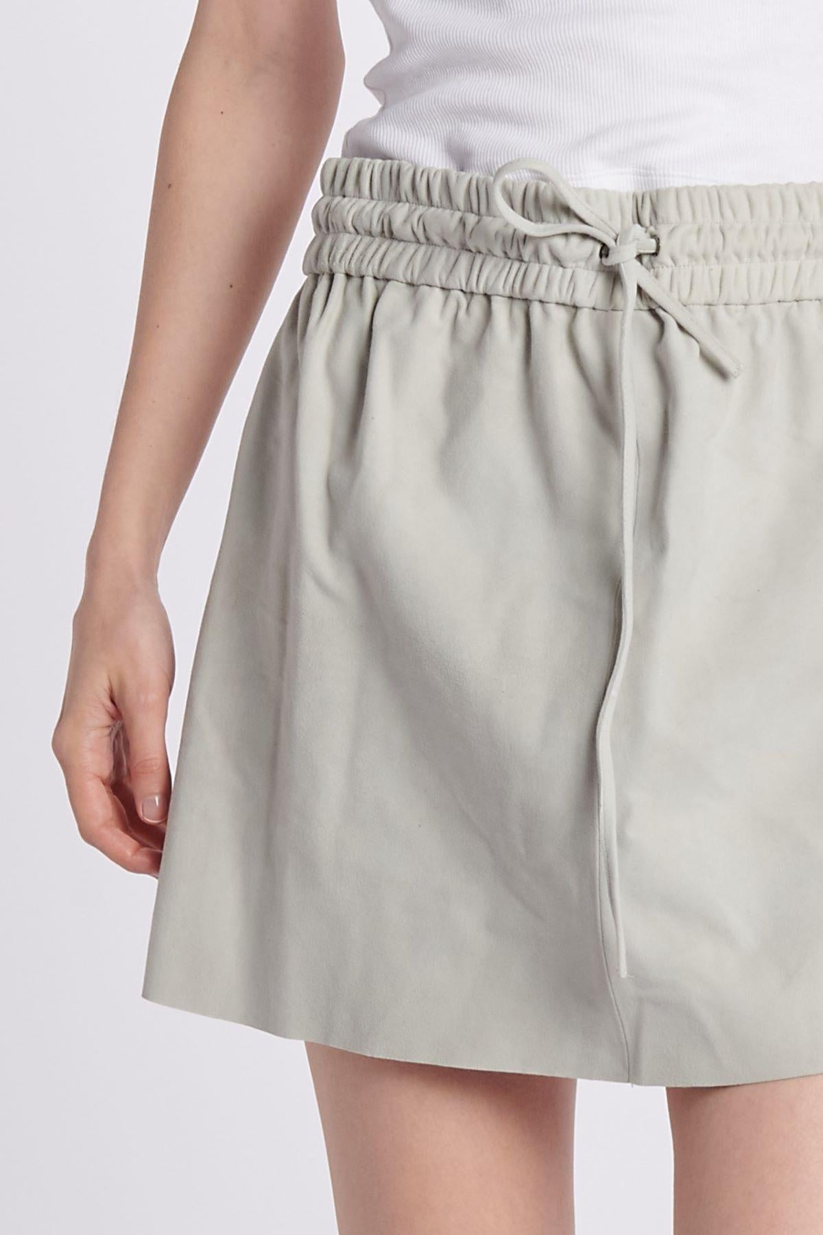 Skirt by Milaura in suede with drawstring. The model is 174 cm tall and wears size 38. Composition: 100% Lambskin.